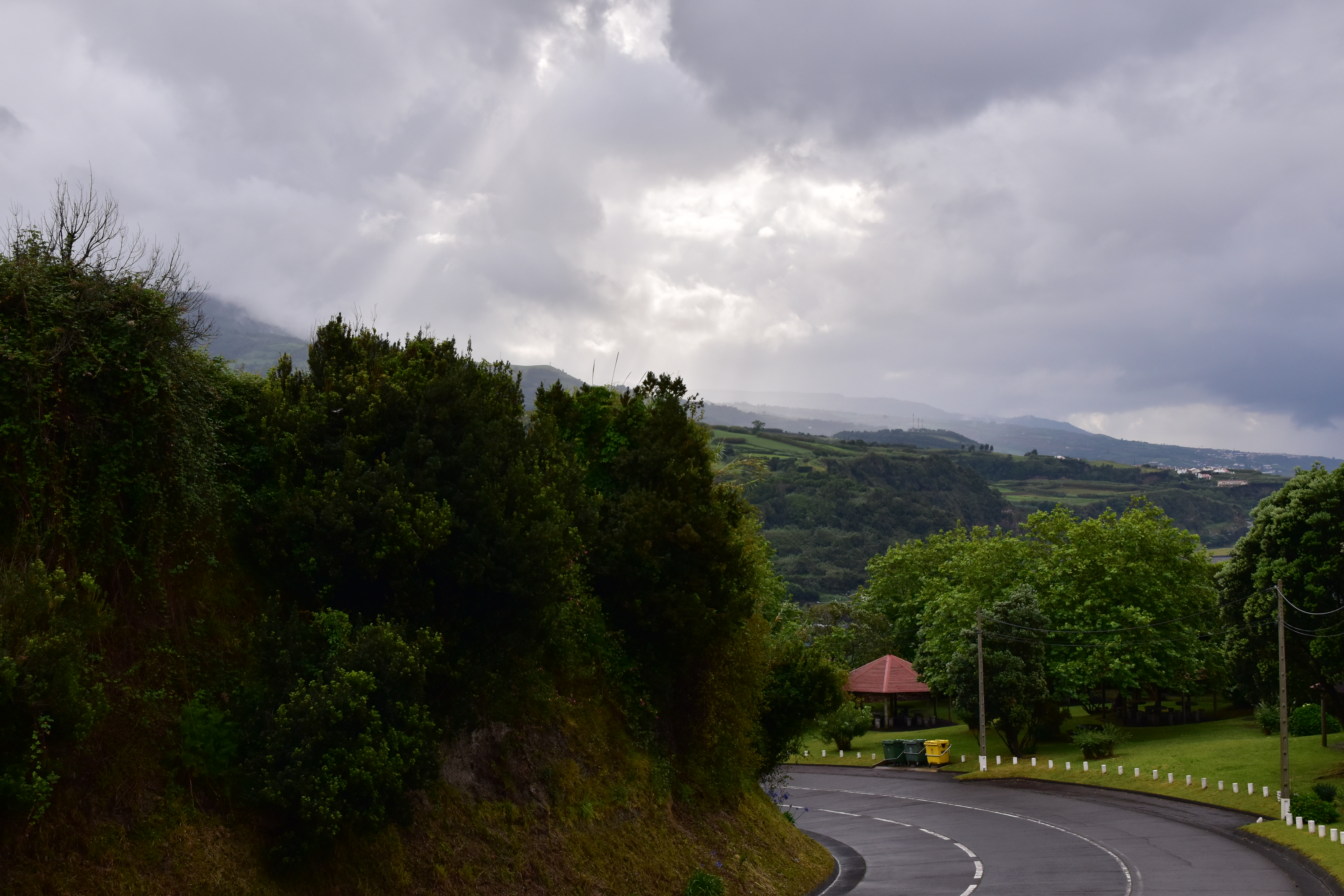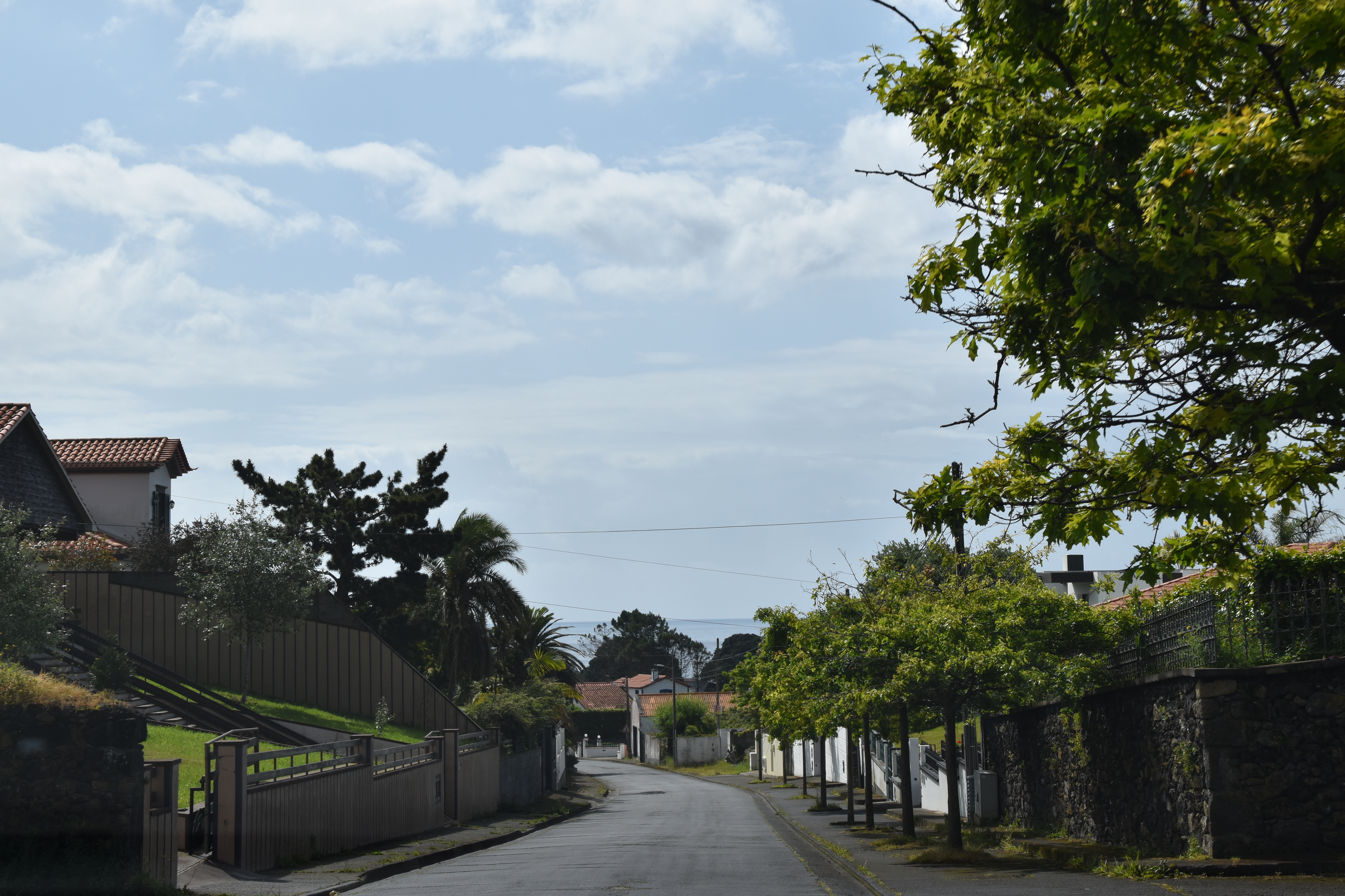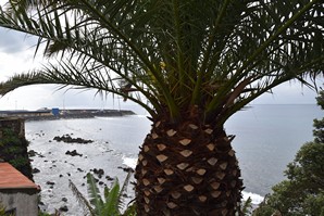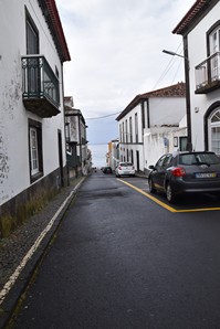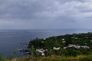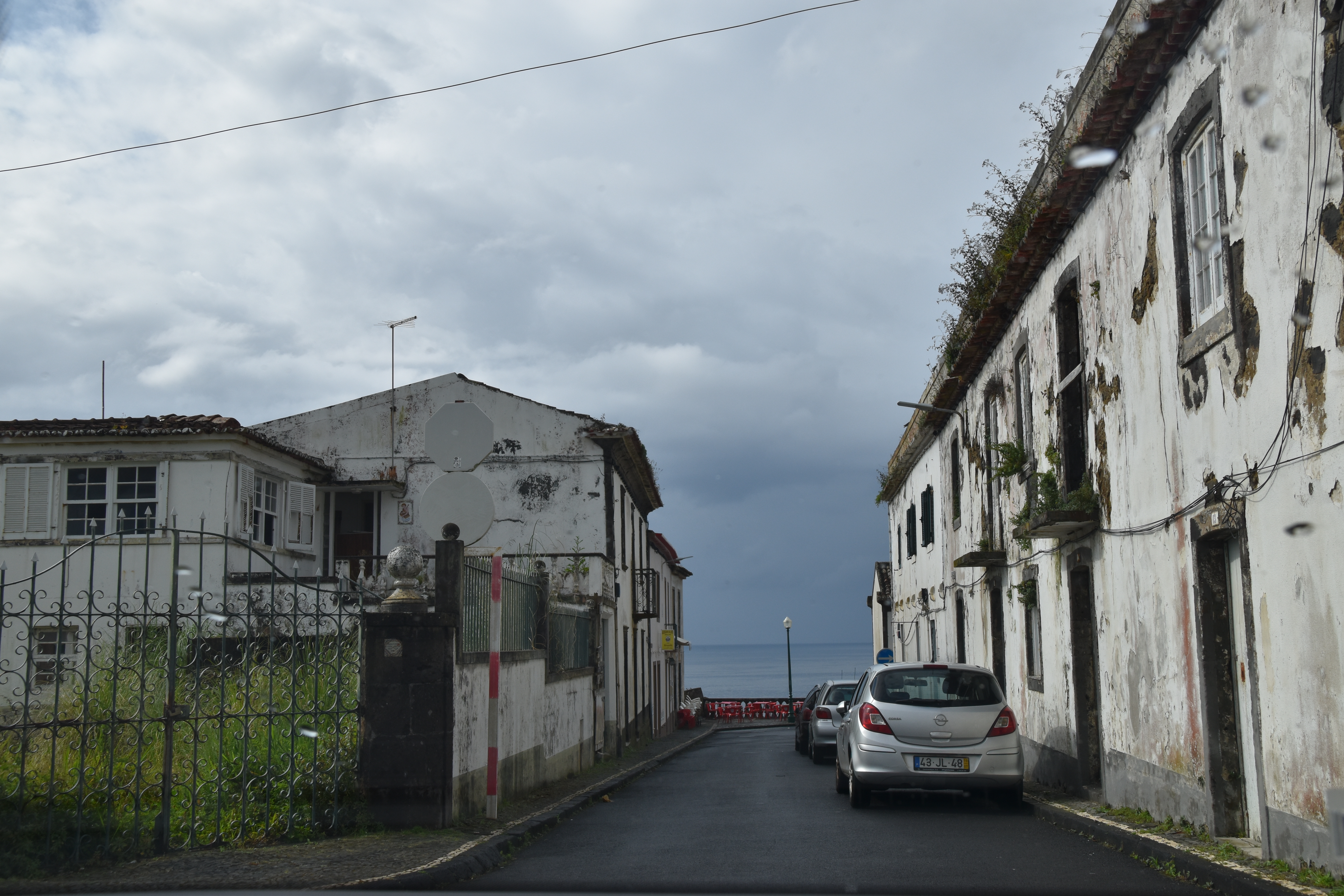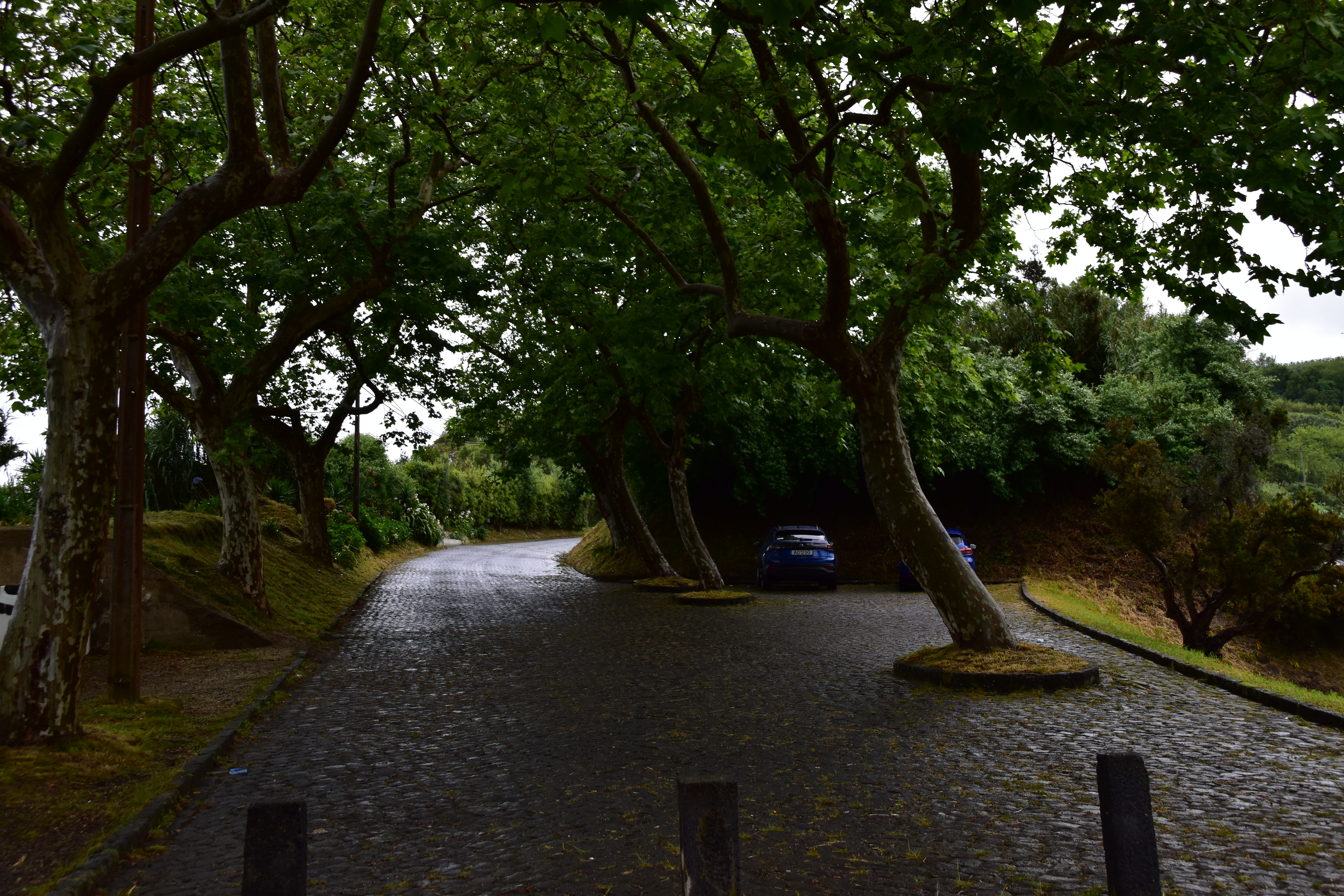 C'est dans cette dernière que nous nous stationnons et marchons un peu, dans le jardim Antero de Quental encerclé par l'église do Senhor Bom Jeus da Pera et l'église de Sao Miguel Arcanjo, et les rues avoisonnantes, plutôt désertes. Arrivés à la petite Praça Bento Gois, Martin entre à la boutique Vodafone pour acheter une carte locale et nous reprenons tranquillement la route, en essayant de longer la côte le plus longtemps possible. Tout au bout, juste avant de devoir obligatoirement tourner à gauche pour rejoindre la grande route, nous prenons l'embranchement à droite vers la Praia da Amora. Ça descend assez abruptement dans une forêt luxuriante jusqu'à une aire de picnic où on pourrait utiliser de magnifiques bbq et d'énormes table en pierre. Il y a une vue magnifique sur la côte, et un petit sentier qui descend à une plage, mais comme ça semble pas mal raide et que nous sommes vannés, nous nous contentons de la vue et de la fraîcheur de l'ombre du feuillage dense. Déjà nous sommes très impressionnés par la végétation, toutes les fleurs et les arbustes en bordure de route qui reluisent après la pluie.