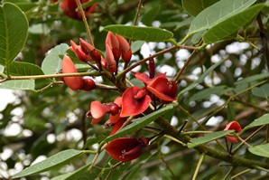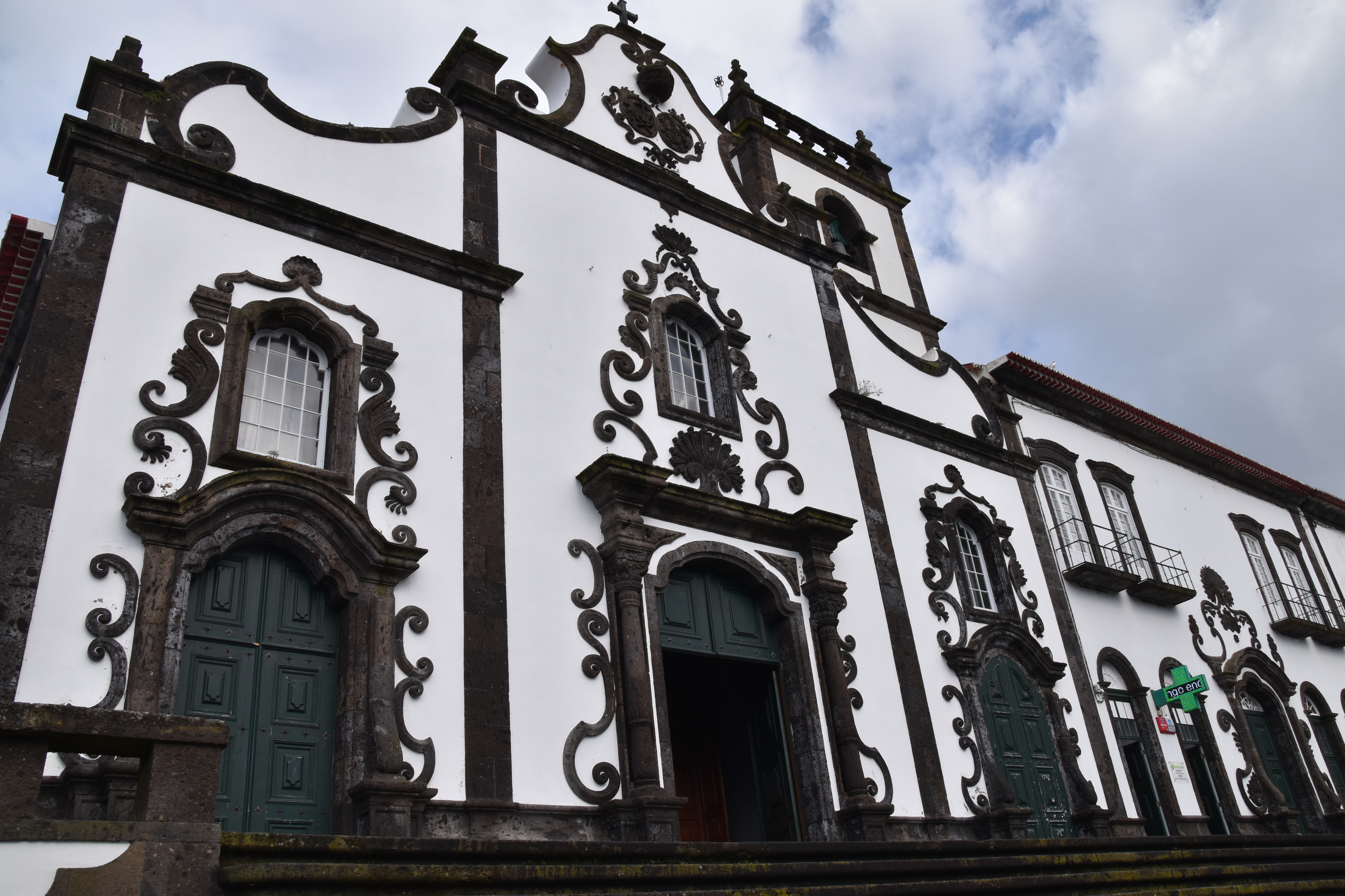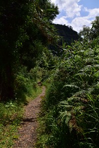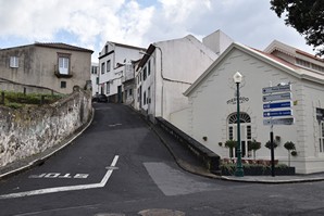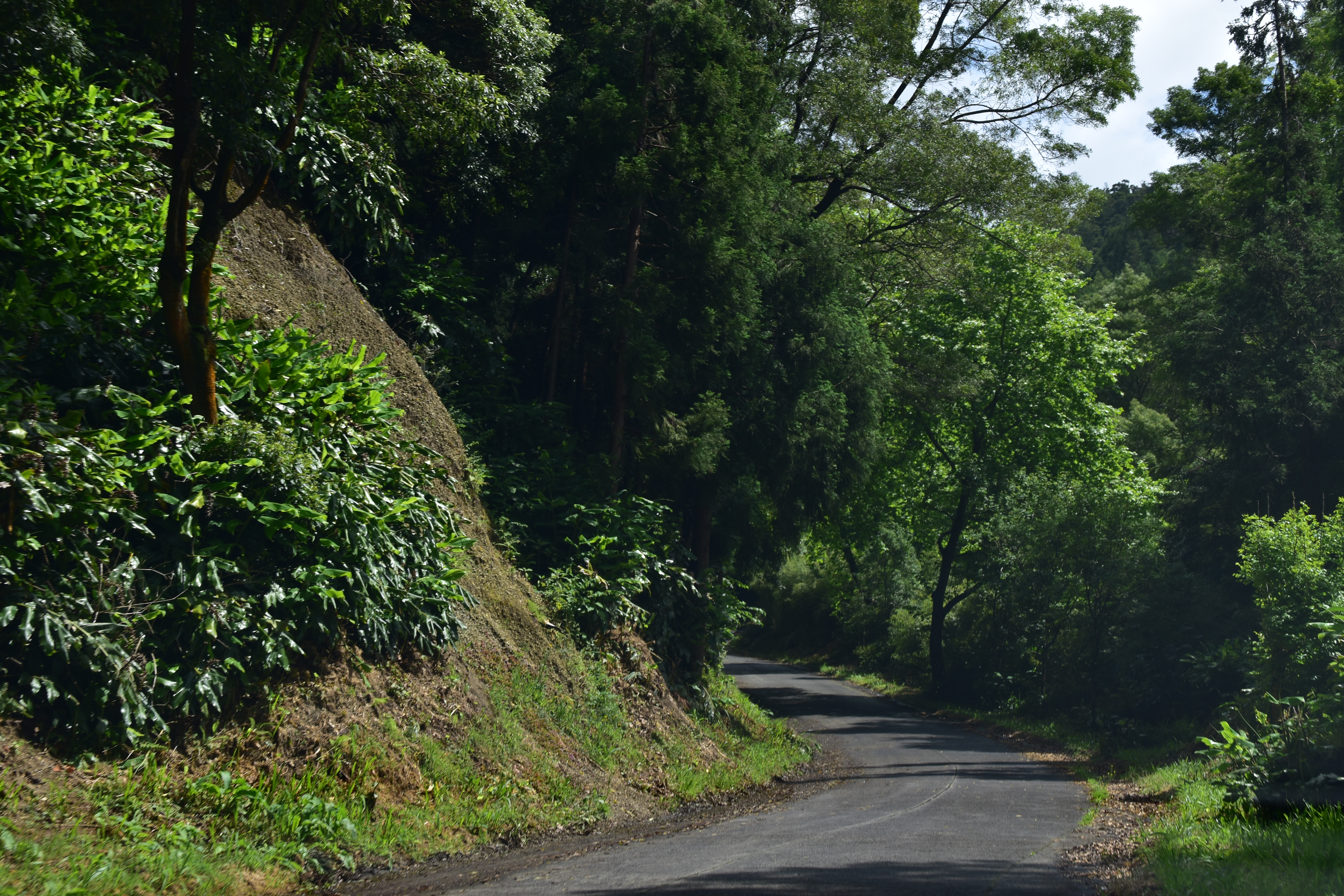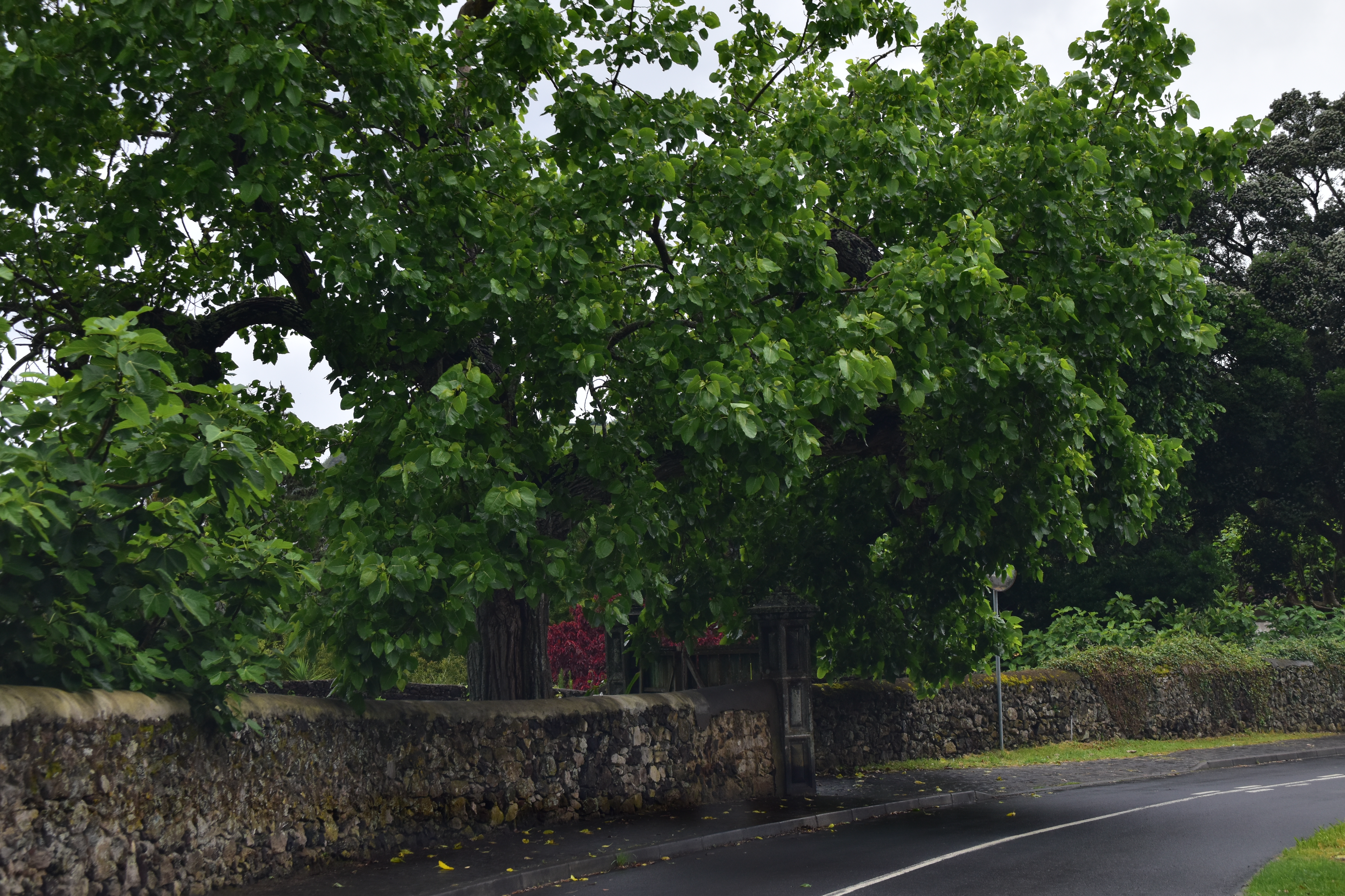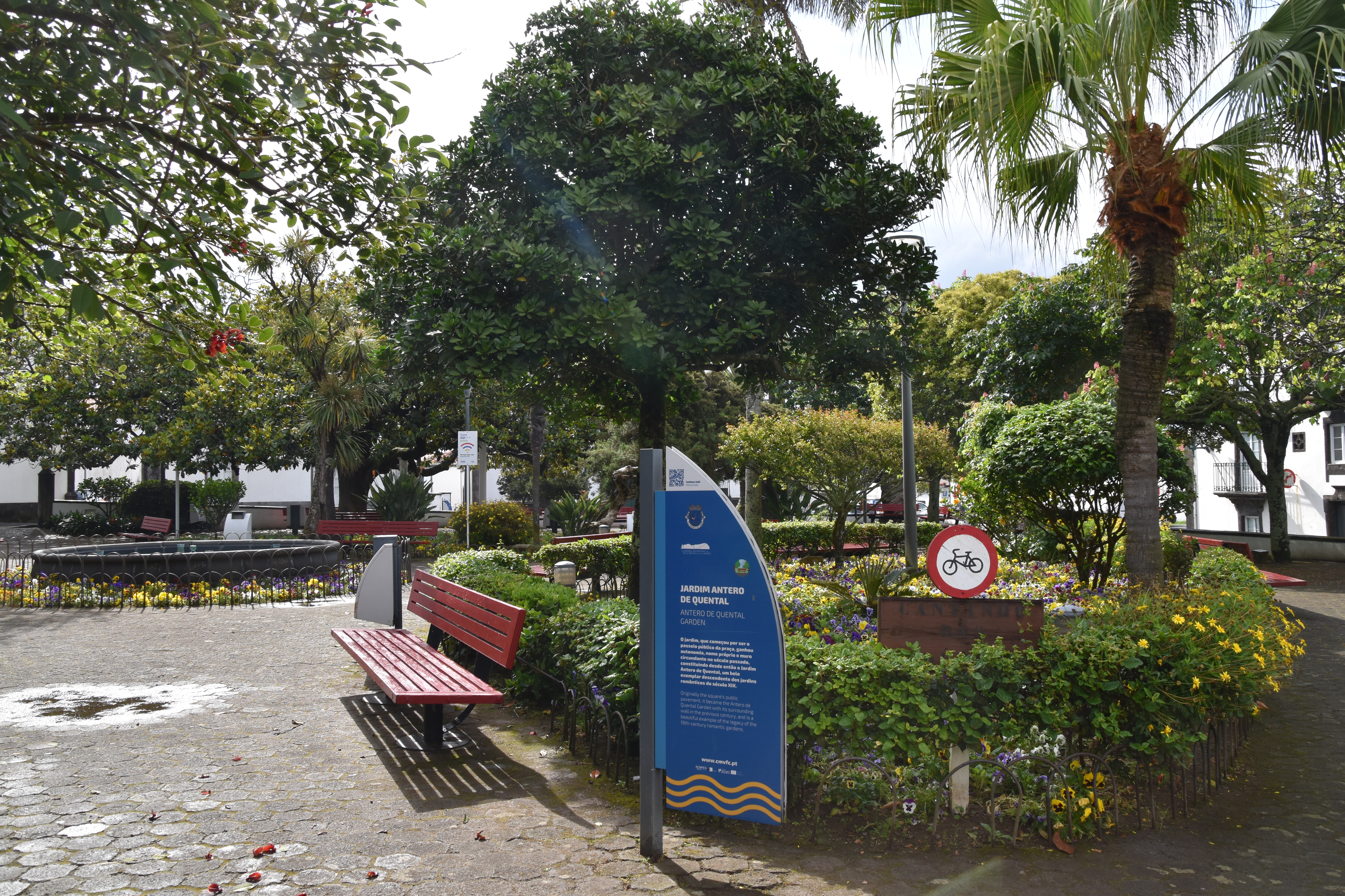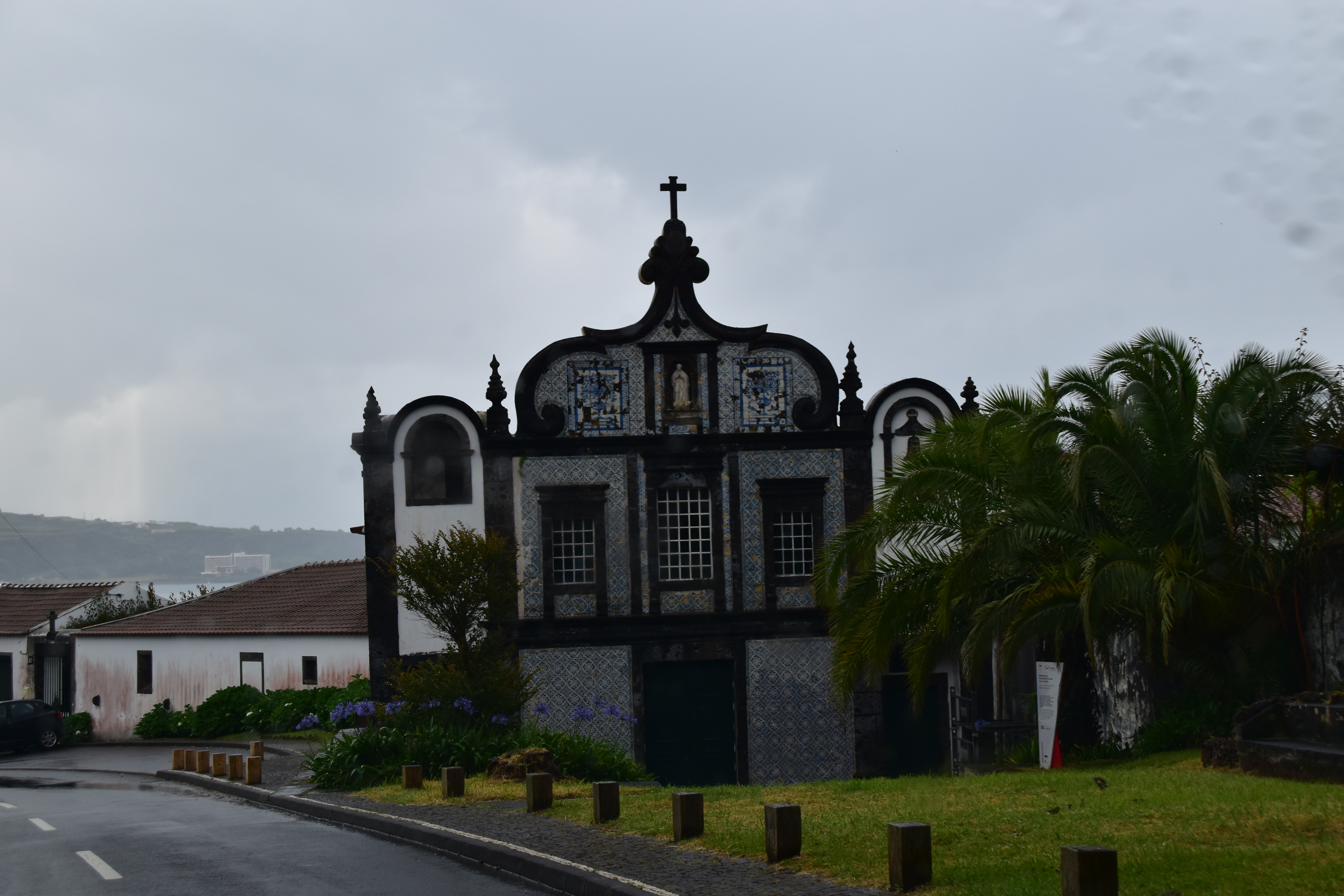 C'est dans cette dernière que nous nous stationnons et marchons un peu, dans le jardim Antero de Quental encerclé par l'église do Senhor Bom Jeus da Pera et l'église de Sao Miguel Arcanjo, et les rues avoisonnantes, plutôt désertes. Arrivés à la petite Praça Bento Gois, Martin entre à la boutique Vodafone pour acheter une carte locale et nous reprenons tranquillement la route, en essayant de longer la côte le plus longtemps possible. Tout au bout, juste avant de devoir obligatoirement tourner à gauche pour rejoindre la grande route, nous prenons l'embranchement à droite vers la Praia da Amora. Ça descend assez abruptement dans une forêt luxuriante jusqu'à une aire de picnic où on pourrait utiliser de magnifiques bbq et d'énormes table en pierre. Il y a une vue magnifique sur la côte, et un petit sentier qui descend à une plage, mais comme ça semble pas mal raide et que nous sommes vannés, nous nous contentons de la vue et de la fraîcheur de l'ombre du feuillage dense. Déjà nous sommes très impressionnés par la végétation, toutes les fleurs et les arbustes en bordure de route qui reluisent après la pluie.