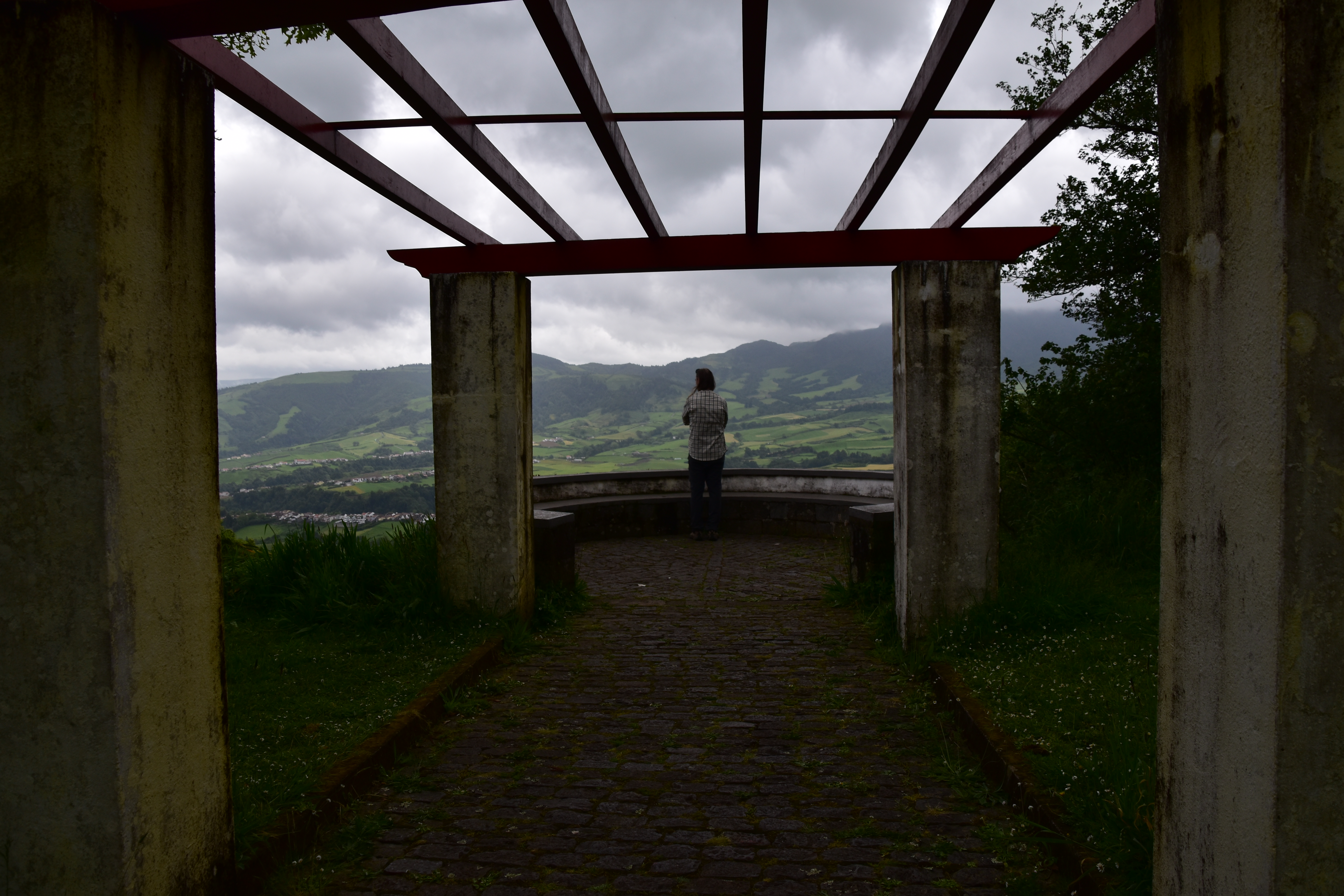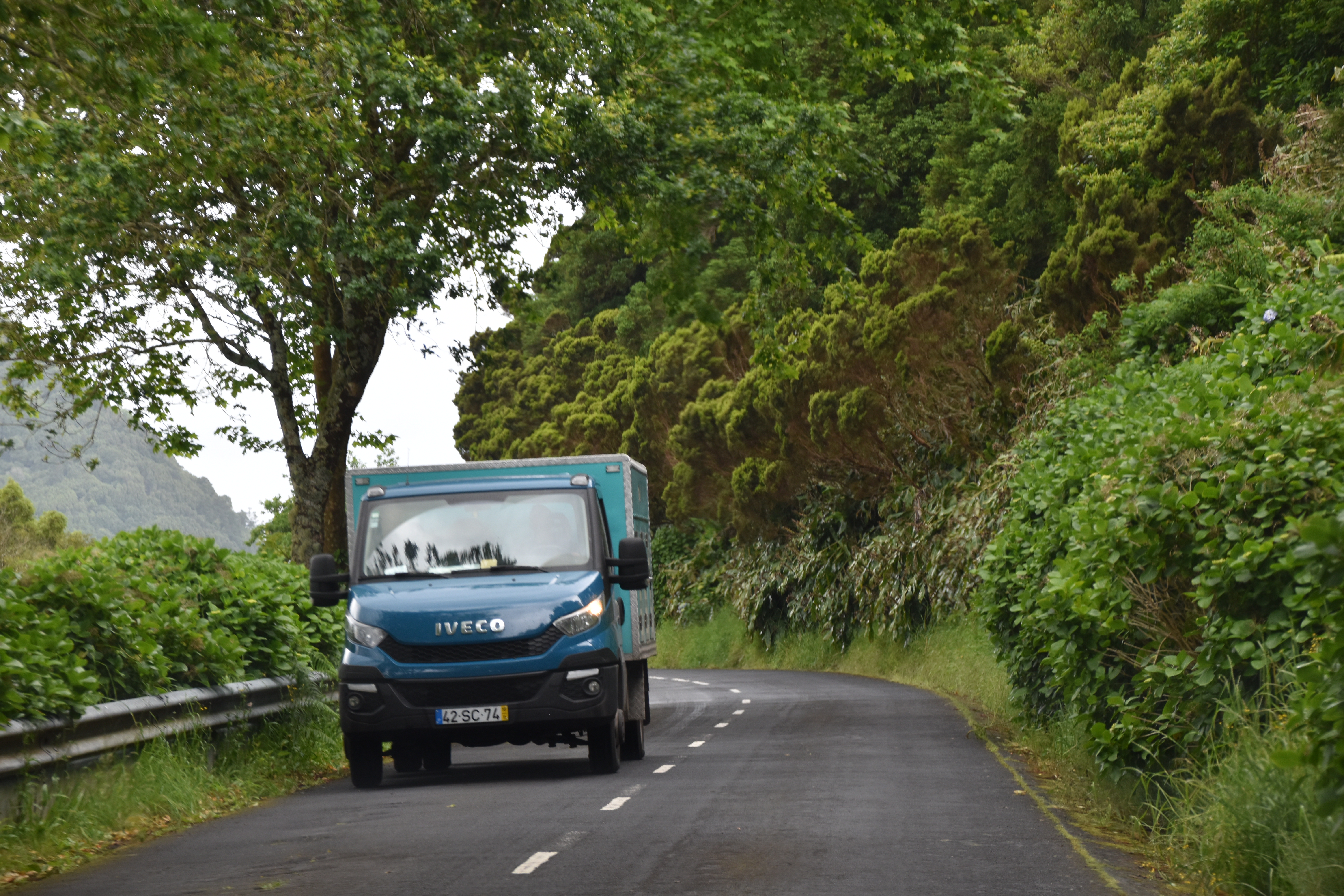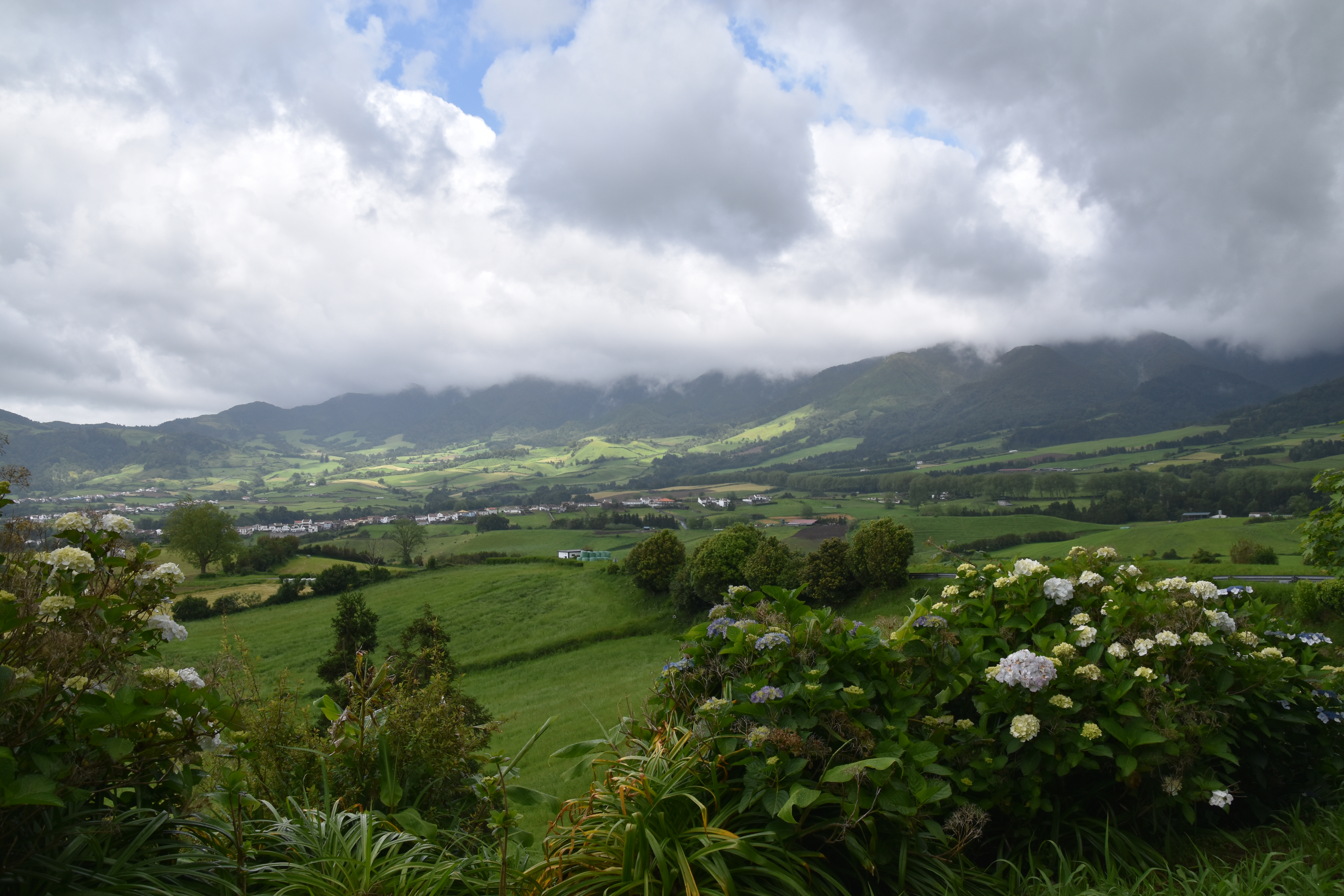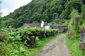 En quittant Faial da terra, nous empruntons une petite route qui mène vers Sanguinho, puis après avoir rejoint la 1a, nous voyons une bifurcation sur la gauche qui indique: rota da tronqueira, serra de Tronqueira. La route n'est pas pavée, et ne permet pas de rencontrer, mais semble en bon état: petite recherche rapido sur le portable, il semble que ce soit une route super intéressante, et nous ne cherchons pas plus loin et l'empruntons. Le gravier est bien gratté et la route se fait bien avec la voiture, même si à quelques endroits il y a de bonnes crevasses causées par les fortes pluies. Néanmoins nous persévérons, car la route qui monte dans la serra offre de bien belles vues pendant les 17 km entre Agua Retorta et Nordeste. À Nordeste nous faisons quelques emplettes et ne profitons pas assez longuement de cette belle petite ville tranquille. Le retour sur Furnas se fait rondement, car les distances ne sont pas grandes, sur une belle route qui sinue à travers champs.