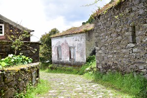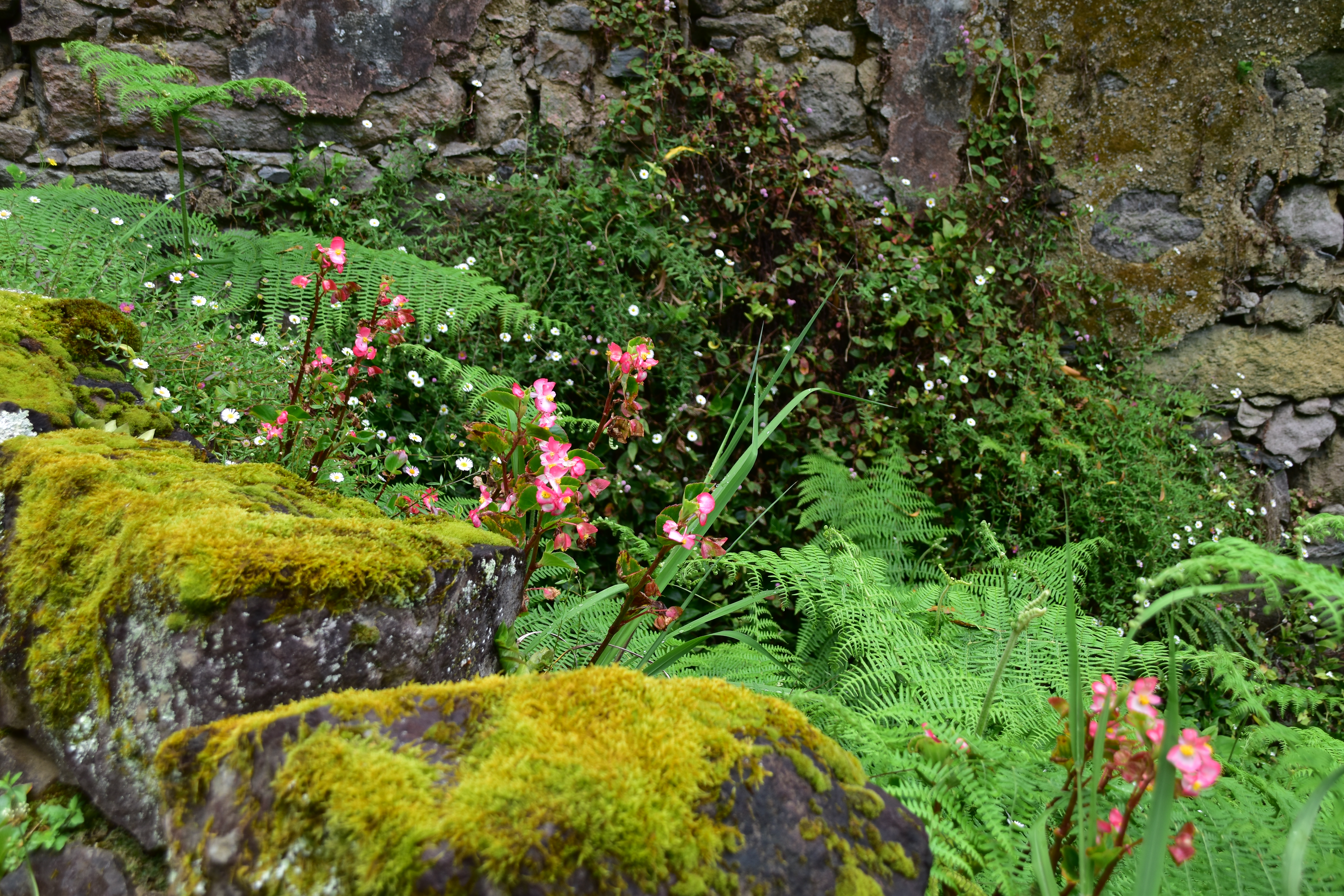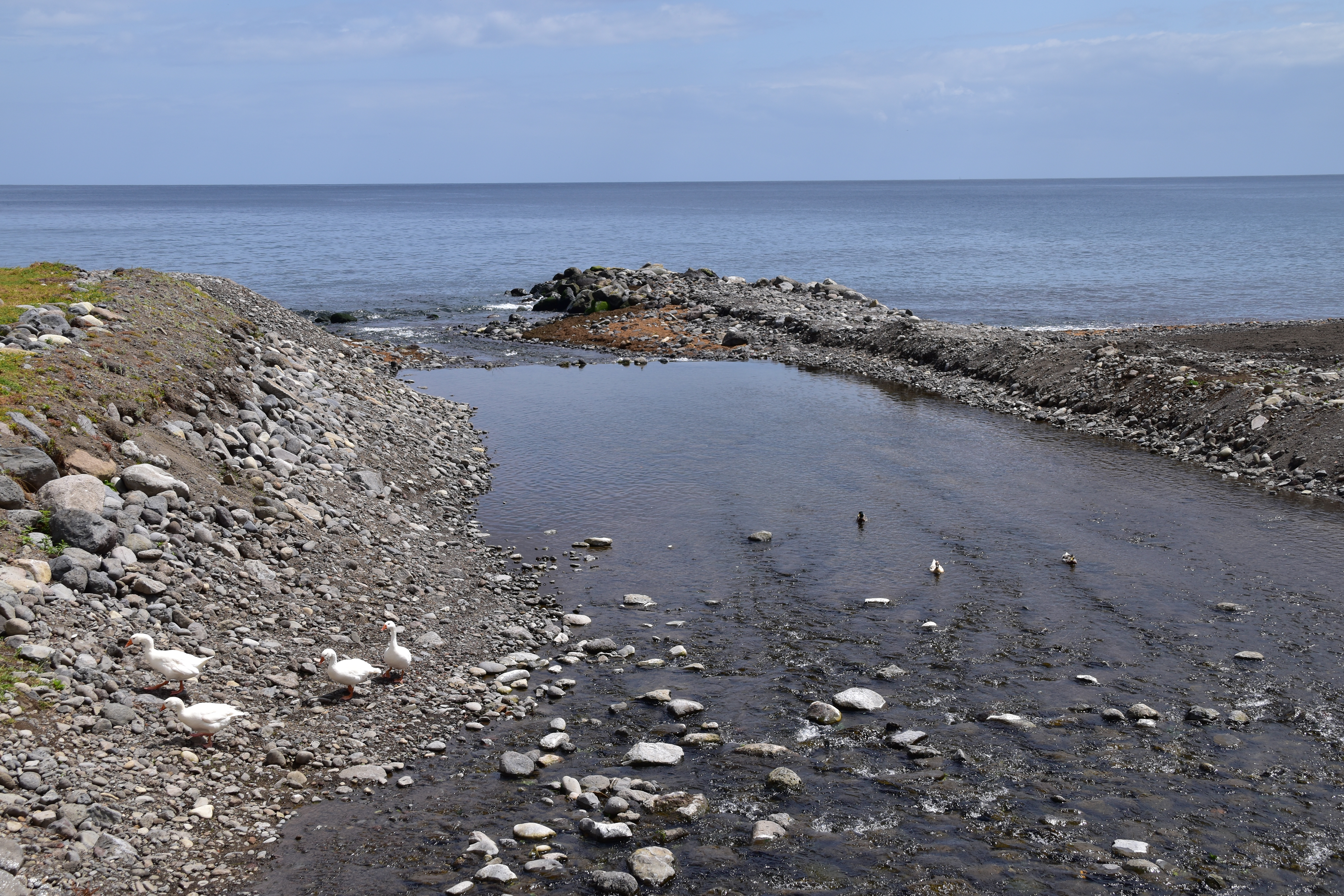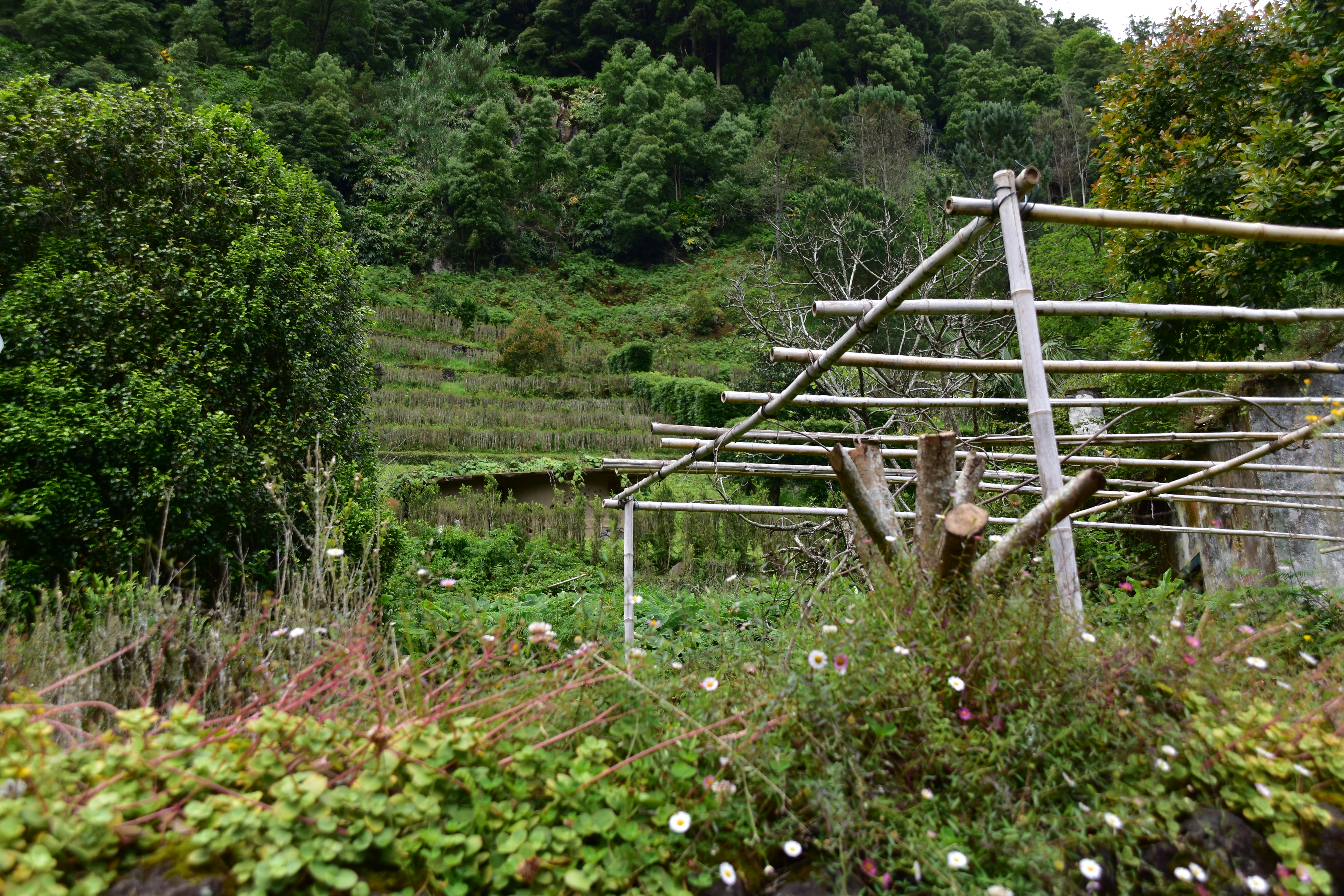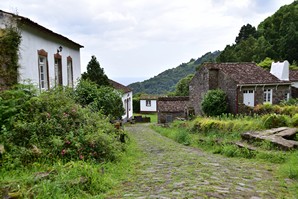Arrivés dans le village, nous longeons le cours d'eau jusqu'à un panneau indicateur des sentiers de rando des alentours. Nous garons la voiture sur la rue, attachons nos bottes et regardons avec perplexité les indications: nous voulons faire le sentier Quatro caminhnos do Faial da Terra, et il est très bien indiqué sur la gauche mais comme le document que nous a fourni l'agence est contradictoire, nous prenons plutôt tout droit pour suivre le trajet de la carte de l'agence. Finalement, ce n'est pas le bon sentier, mais comme nous sommes plus ou moins en forme, ce n'est pas plus mal: ce sentier longe la rivière aller-retour, c'est très beau, la végétation est luxuriante, les oiseaux piaillent, et au bout de la boucle nous arrivons au village de Sanguinho, un ancien village plutôt, qui n'est plus habité mais en voie d'être restauré. Il ne fait pas très chaud, heureusement car c'est très très humide, dans la forêt gorgée d'eau. Les arbres, les fougères, les mousses, les fleurs, tout est humide et reluisant, c'est vraiment très beau. Nous redescendons vers la route par le sentier en pavés glissants. De retour à la voiture, nous nous attardons un peu dans le petit port, où il y a une belle piscine qui donne envie: toutes ces piscines bien entretenues et gratuites nous impressionnent!