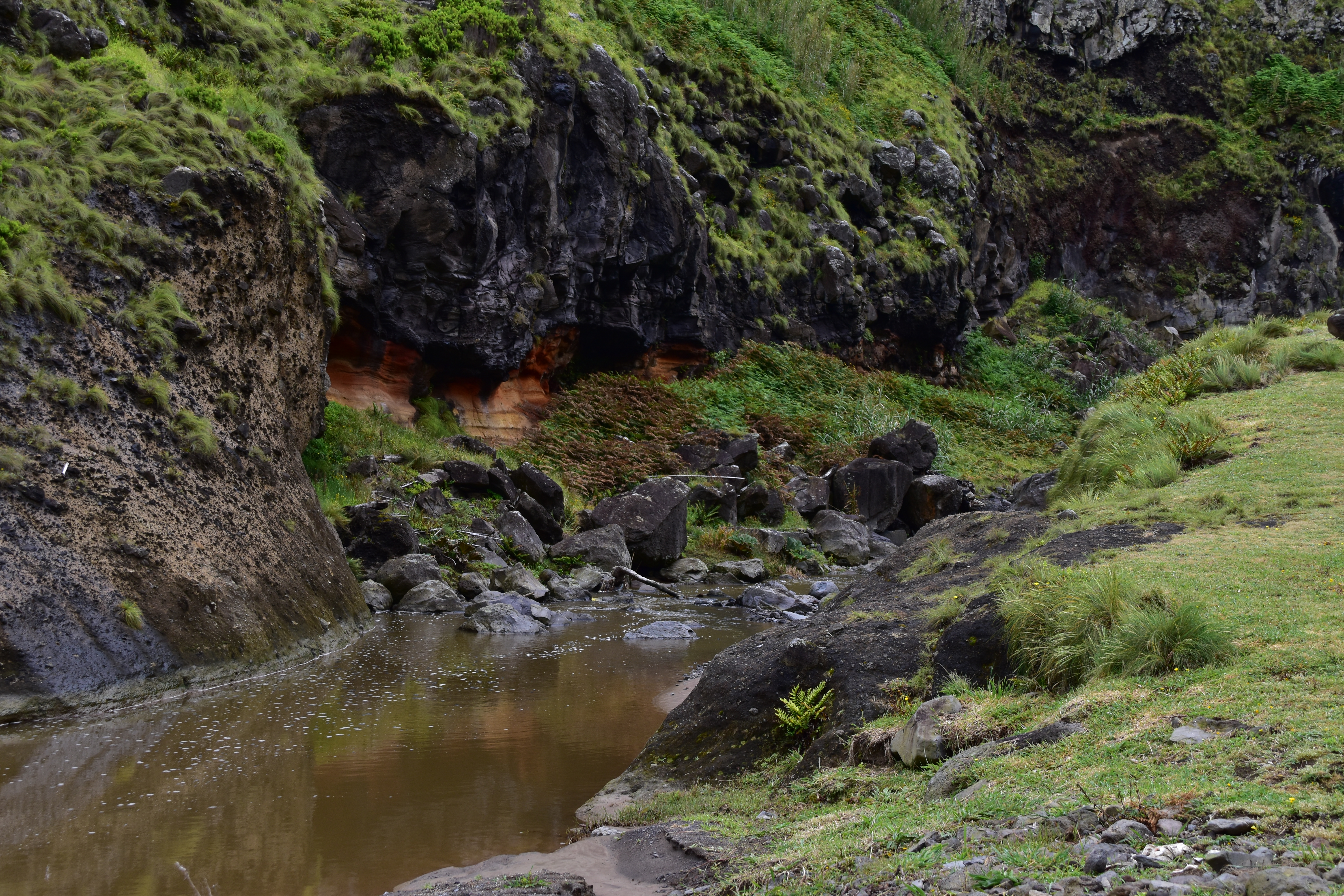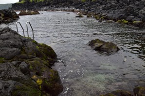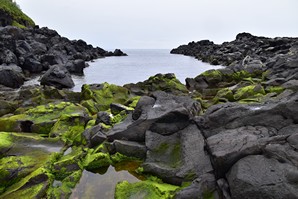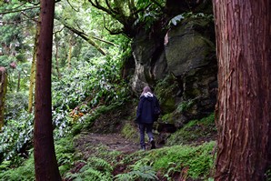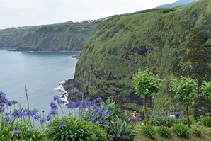 Nous poursuivons notre route vers l'est par Lomba de Sao pedro et lomba da maia, et faisons le petit détour par le Miradouro e merendario da Rocha, où nous décidons de descendre en voiture le petit chemin très abrupt qui mène à une belle cascade, la cascata do Homem. Nous sommes absoluement seuls sur le site, pour admirer la chute qui descend en un petit ruisseau jusqu'à la mer, à quelques mètres de là. C'est vraiment magnifique.