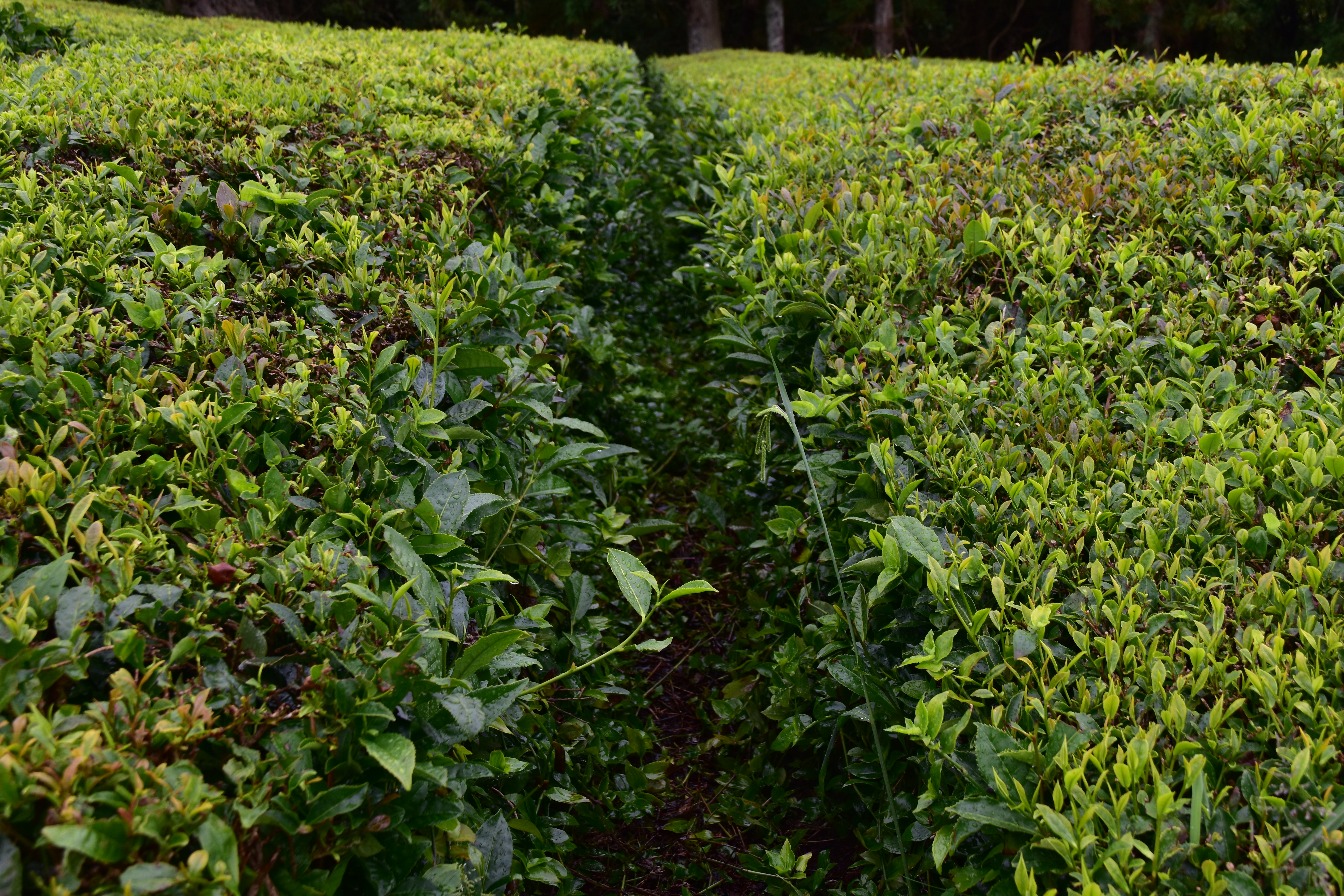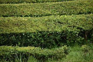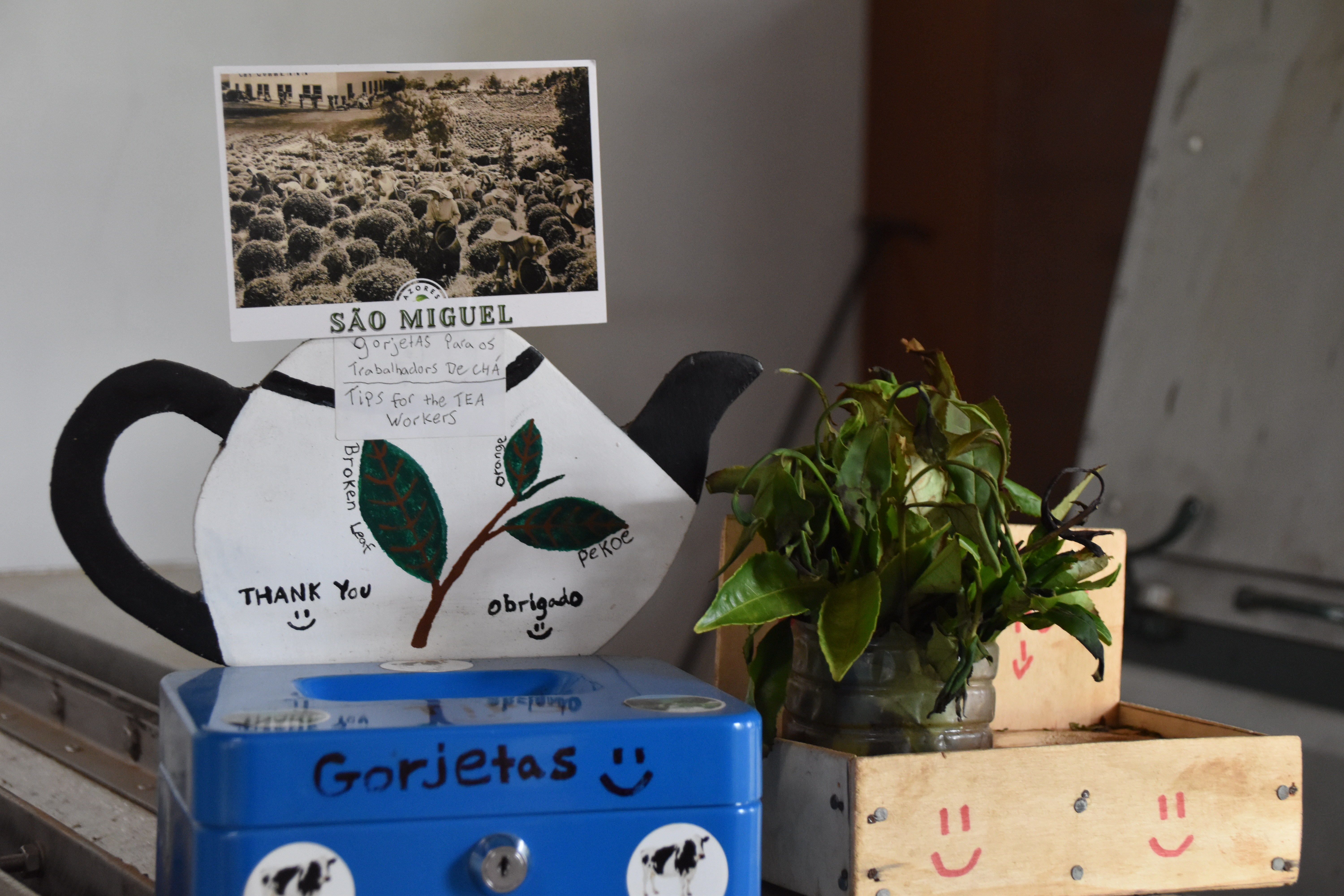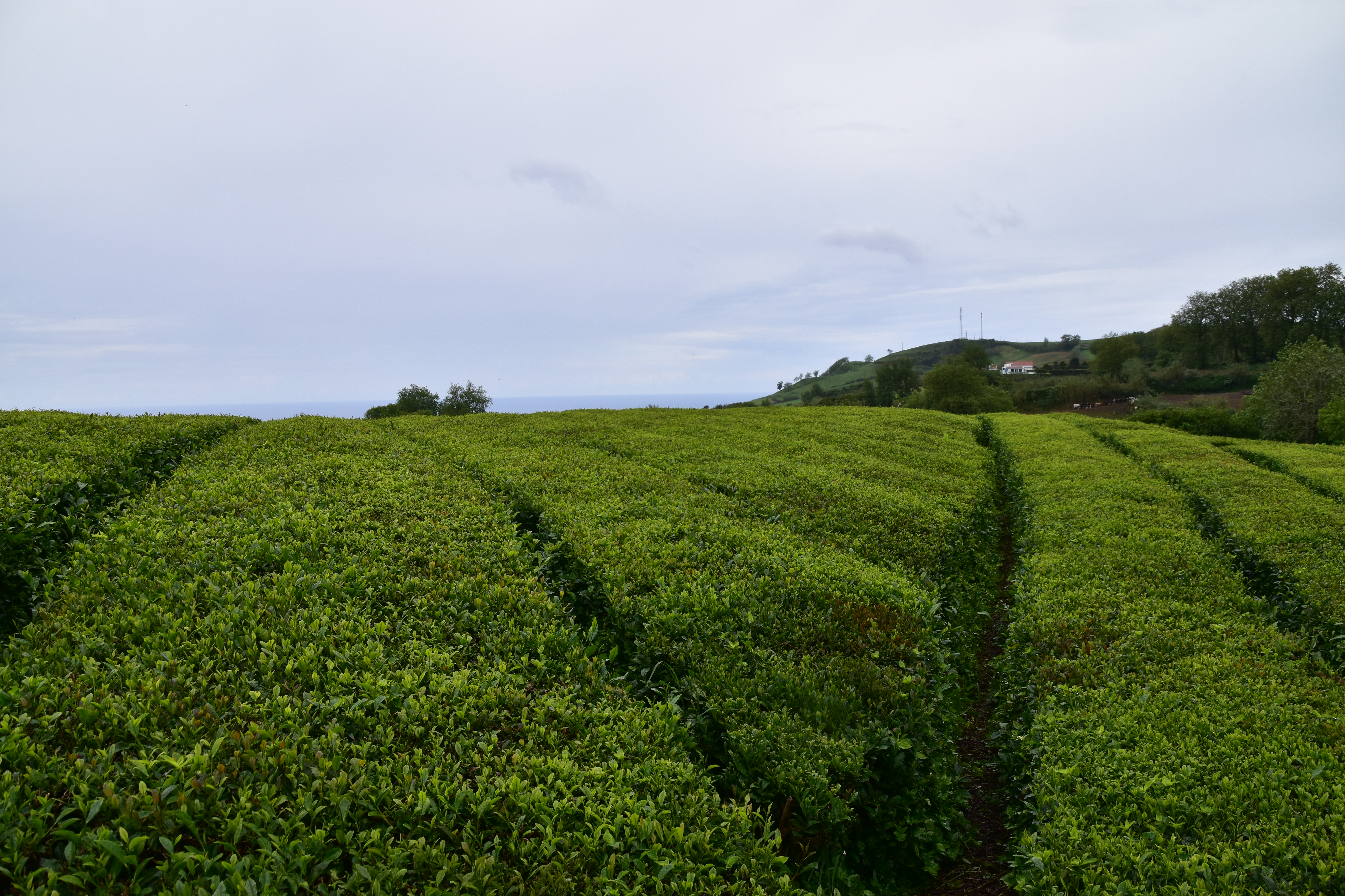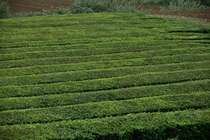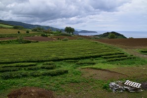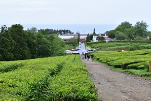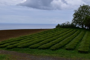 Nous continuons notre route pour rejoindre la plantation de thé Cha Gorreana à Sao Bras. Il y a pas mal de voitures dans le stationnement, en fait il y a peu de stationnement, mais nous ne sommes pas nombreux à visiter les installations de la fabrique. Bien qu'elle ne soit pas guidée, la visite est très intéressante avec le petit dépliant explicatif qu'on nous fournit en français. Les employés travaillent sous nos yeux sur la machinerie que nous pouvons voir en action et nous sommes bien impressionnés par l'ingénieux système de poulies qui permet de tout faire fonctionner en même temps sans perte d'énergie. Nous nous installons à une table sur le grand balcon pour boire plusieurs tasses de thé (dégustation gratuite) et manger un sandwich pendant qu'une bonne averse s'abat sur le site, amenant tout un nouveau lot de visiteurs! C'est ensuite sous un mini crachin que nous arpentons les champs de thé en face de la fabrique.