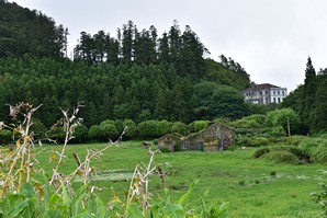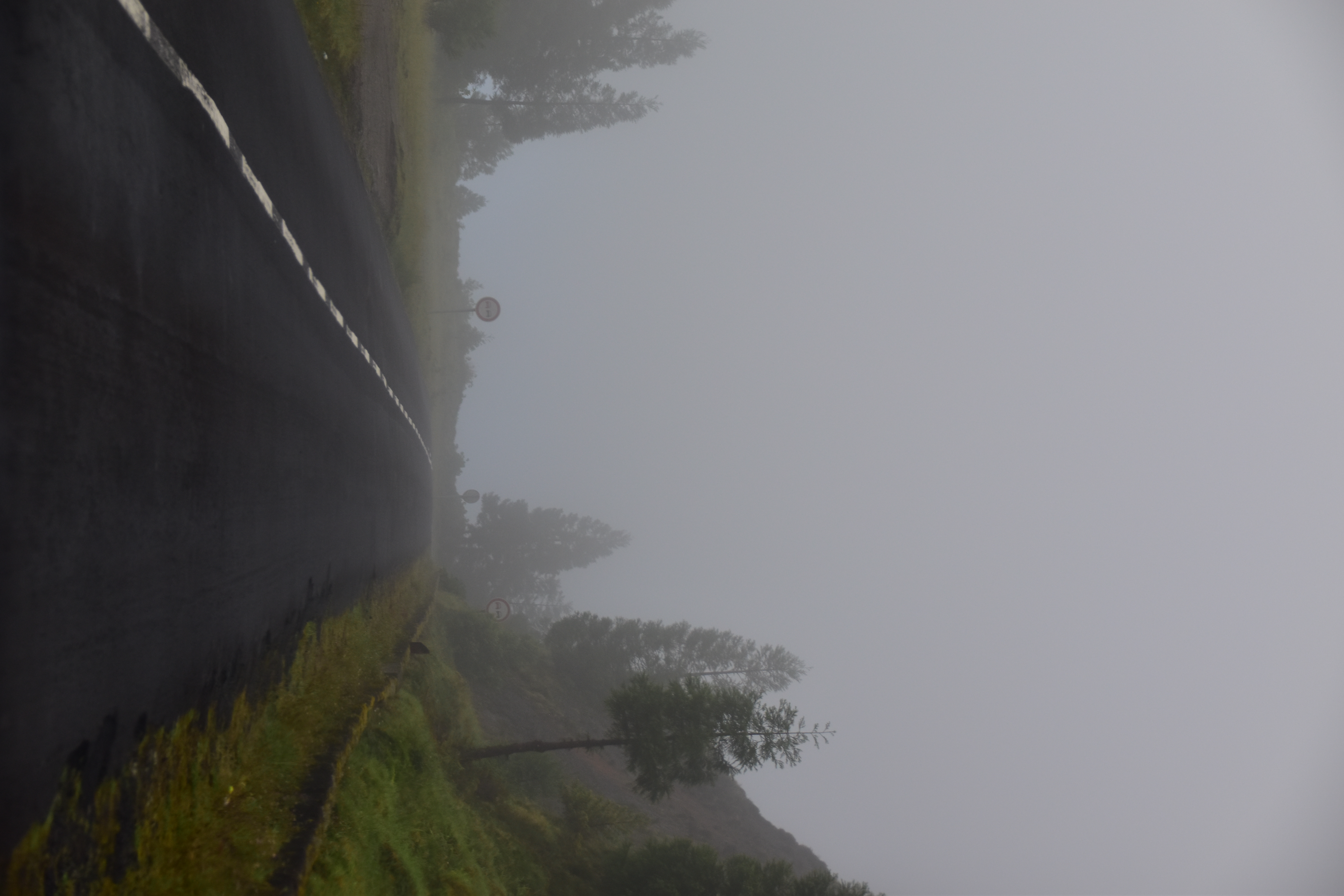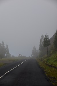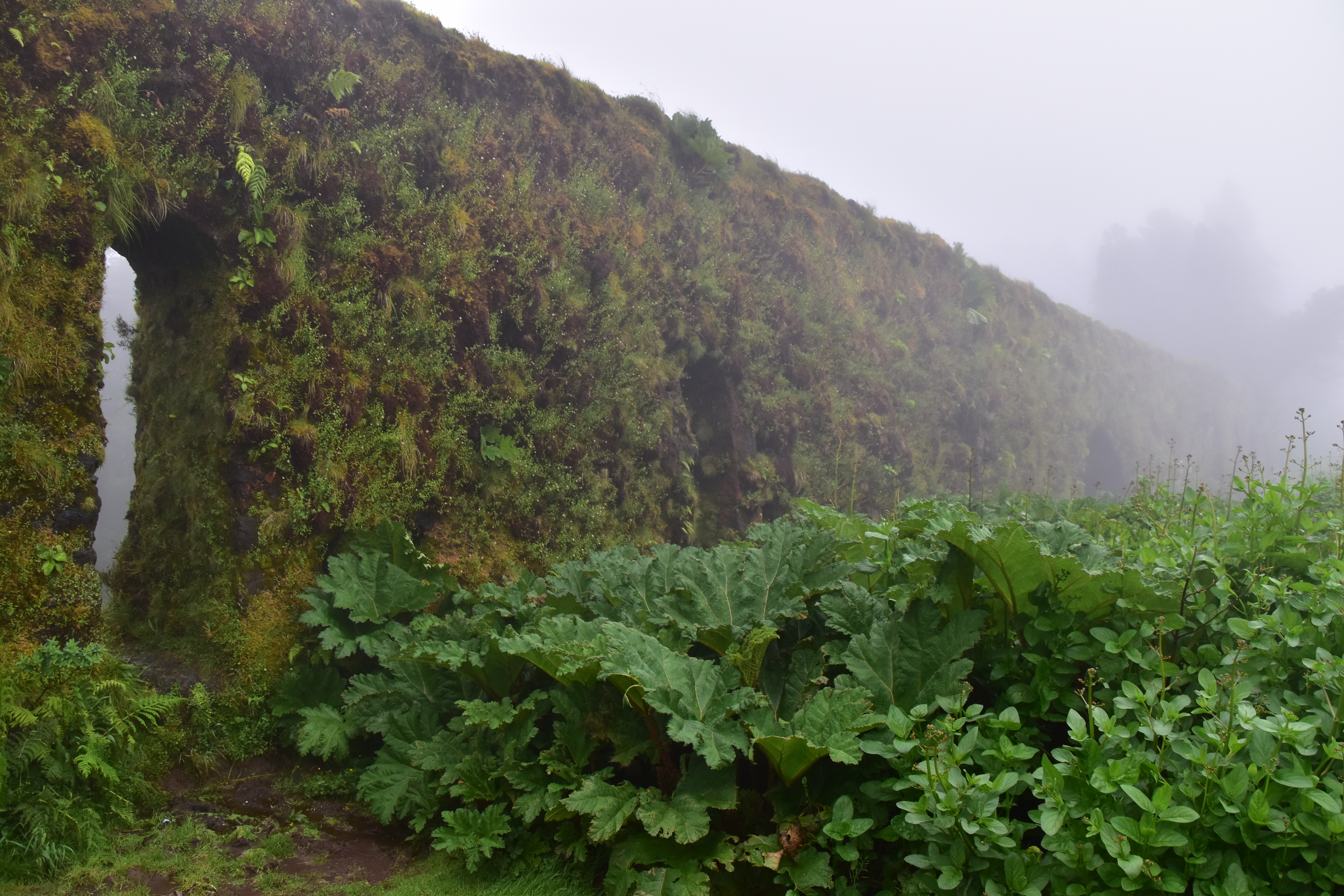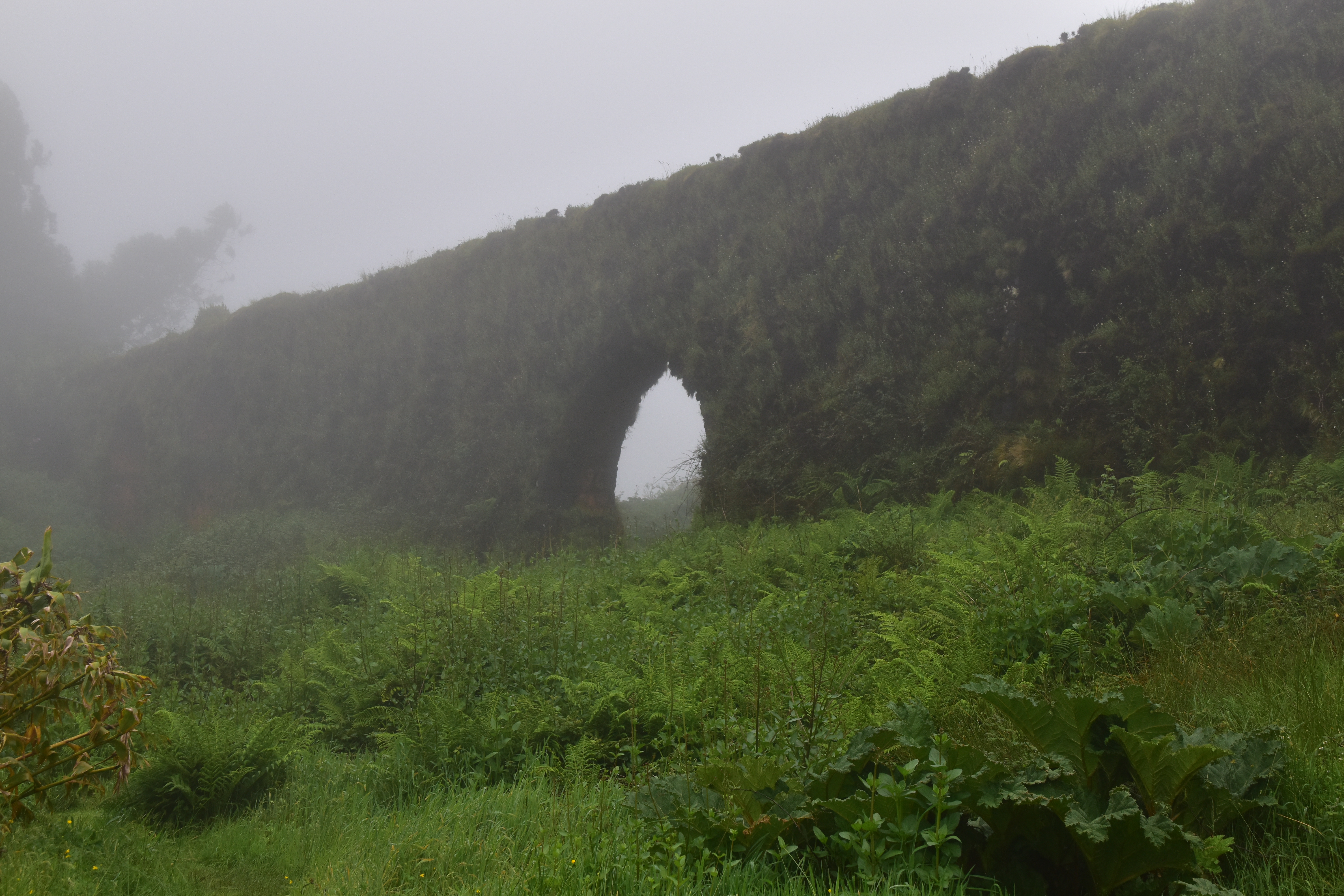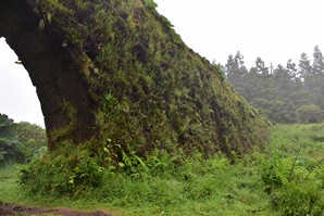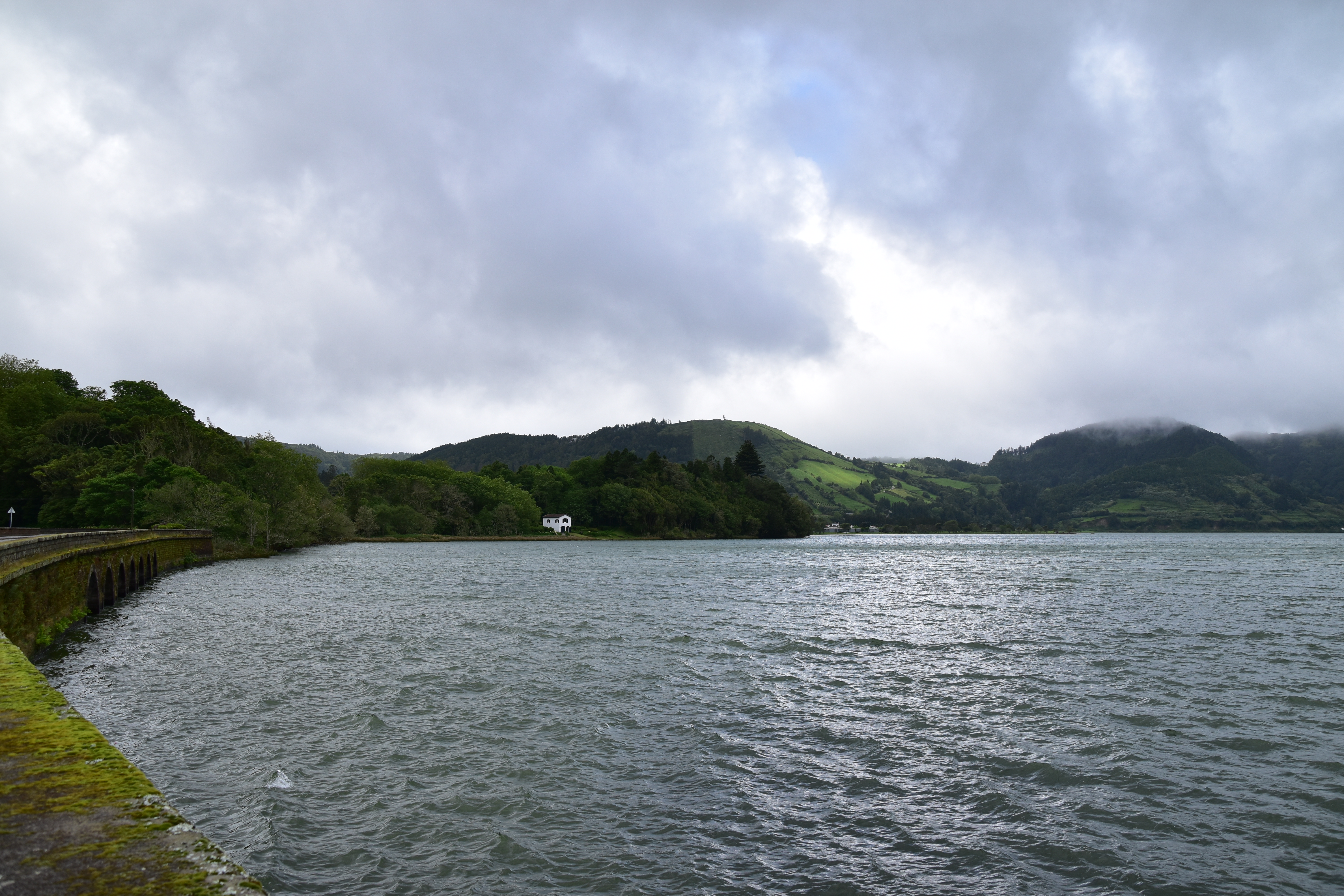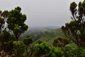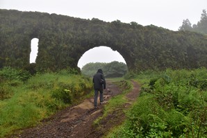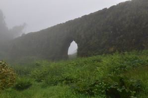 Le ciel est partiellement dégagé ce matin sur Ponta Delgada et nous tentons notre chance pour Sete Cidades. Toutefois en montant vers les points de vue, nous finissons par perdre presque complètement le paysage des deux côtés de la route. Cela donne un aspect très romantique au trajet, et nous arrêtons quand même à l'aqueduc pour prendre quelques photos, malgré le vent qui souffle à 1000 km/h au moins en nous fouettant au visage la brume contenue dans les nuages qui ont envahi toute la route.