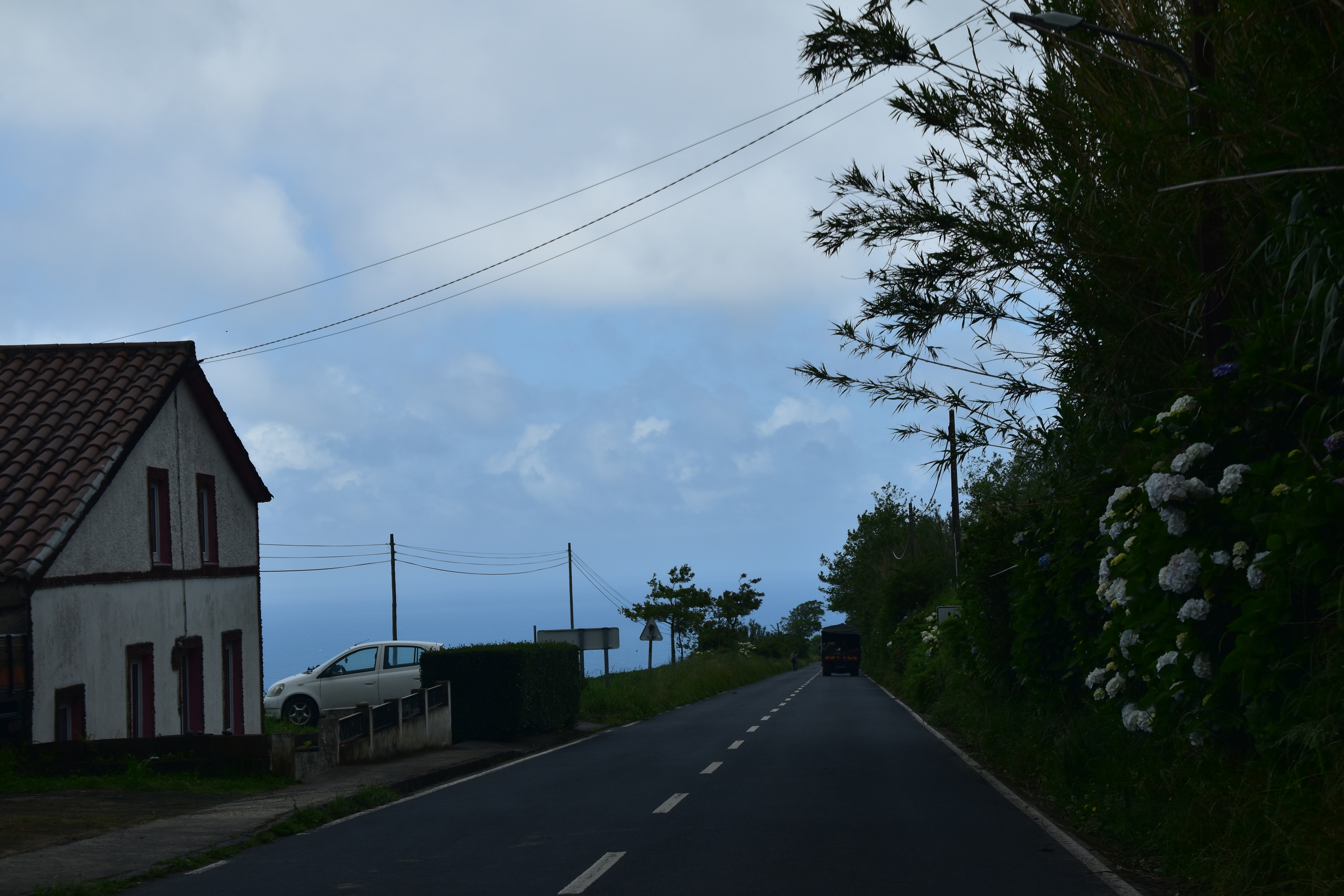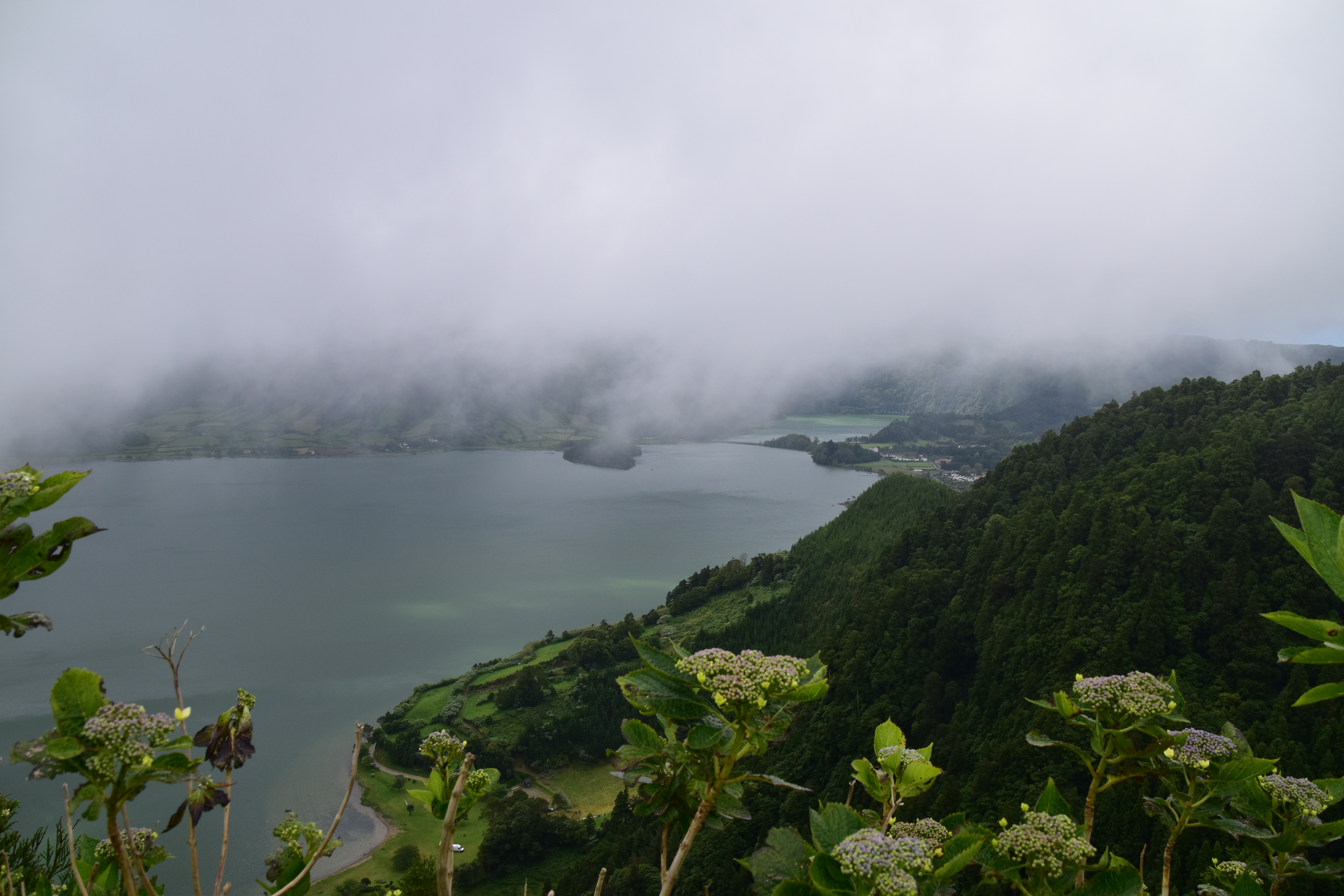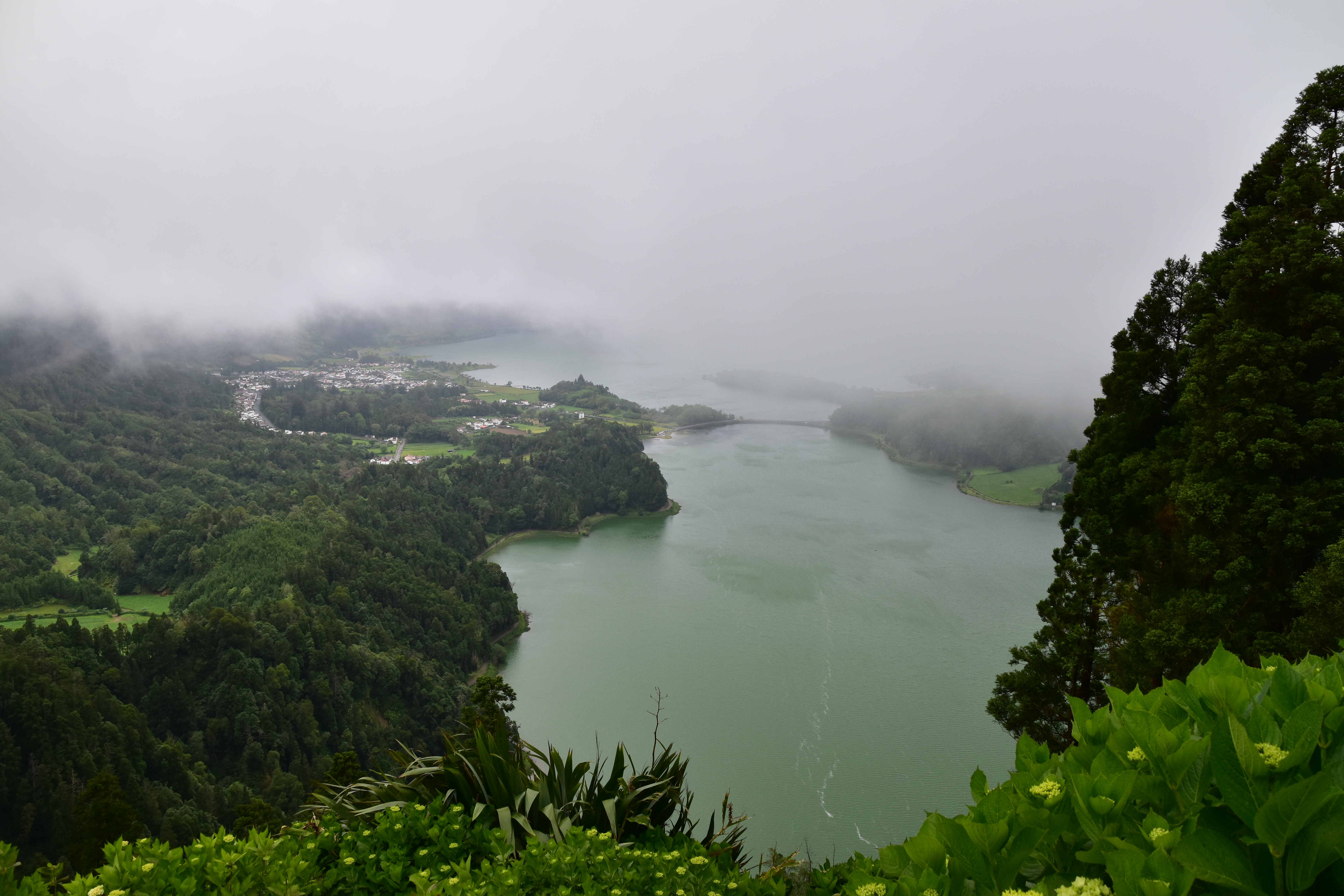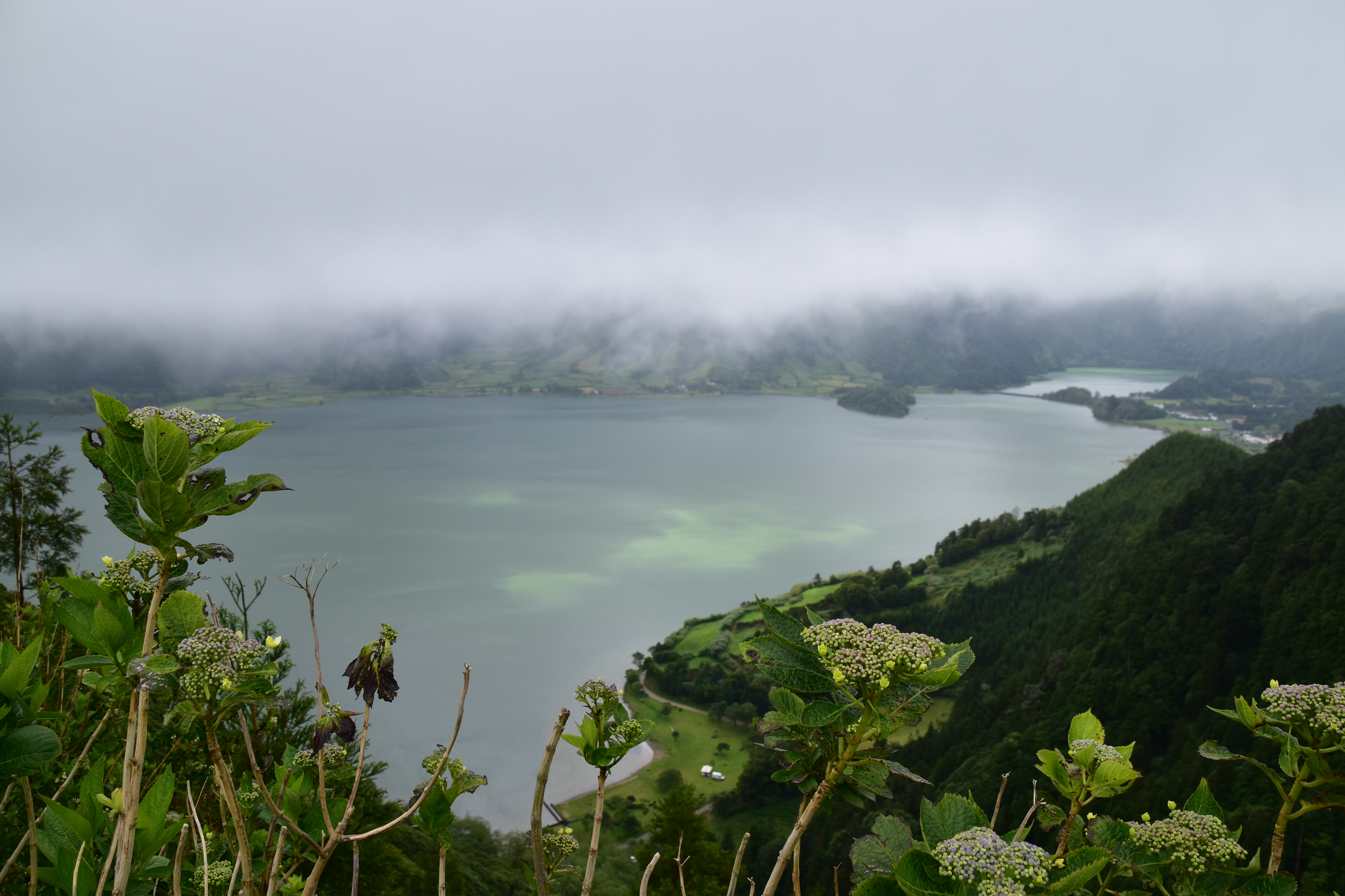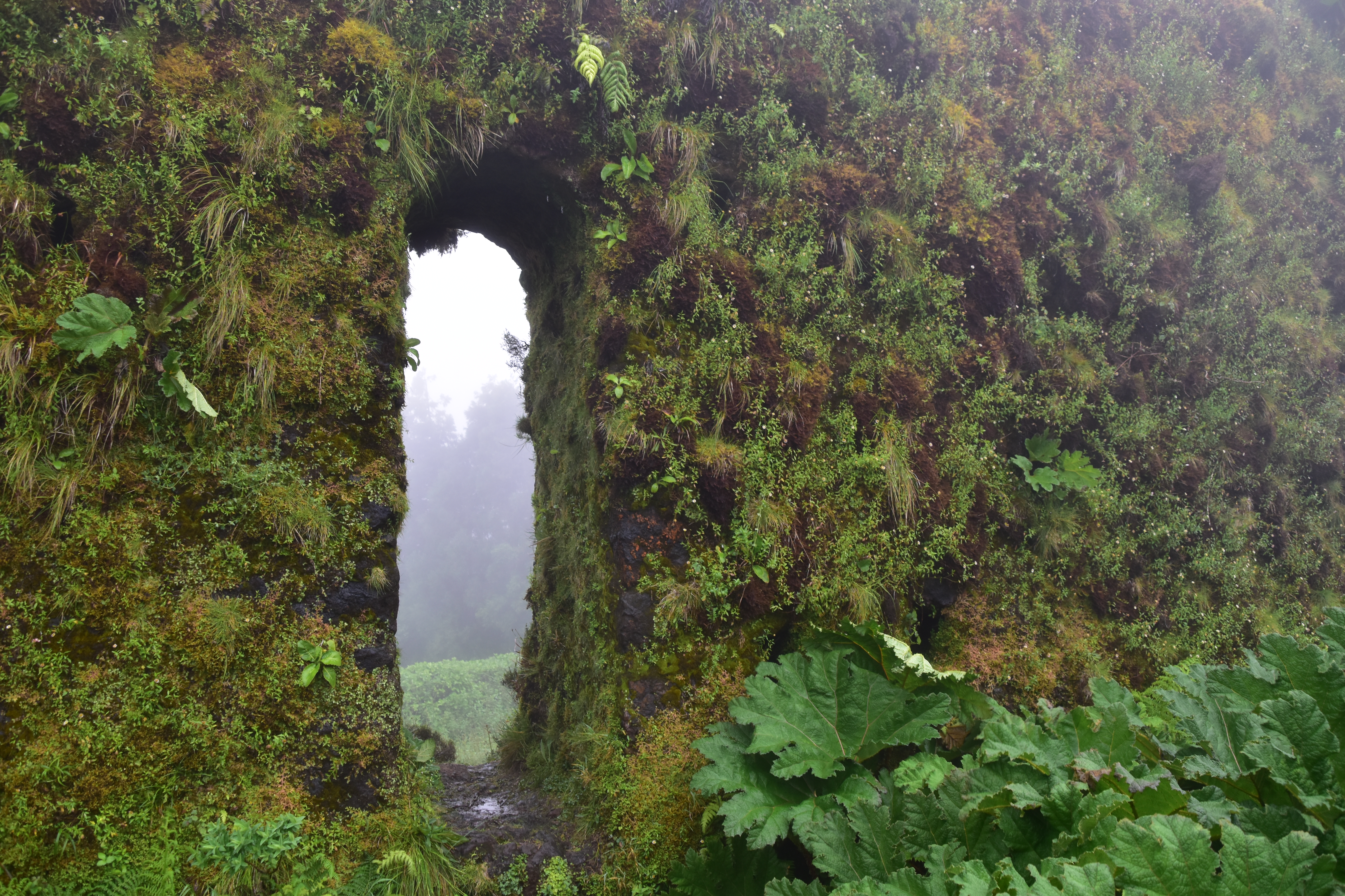Le ciel est partiellement dégagé ce matin sur Ponta Delgada et nous tentons notre chance pour Sete Cidades. Toutefois en montant vers les points de vue, nous finissons par perdre presque complètement le paysage des deux côtés de la route. Cela donne un aspect très romantique au trajet, et nous arrêtons quand même à l'aqueduc pour prendre quelques photos, malgré le vent qui souffle à 1000 km/h au moins en nous fouettant au visage la brume contenue dans les nuages qui ont envahi toute la route.
