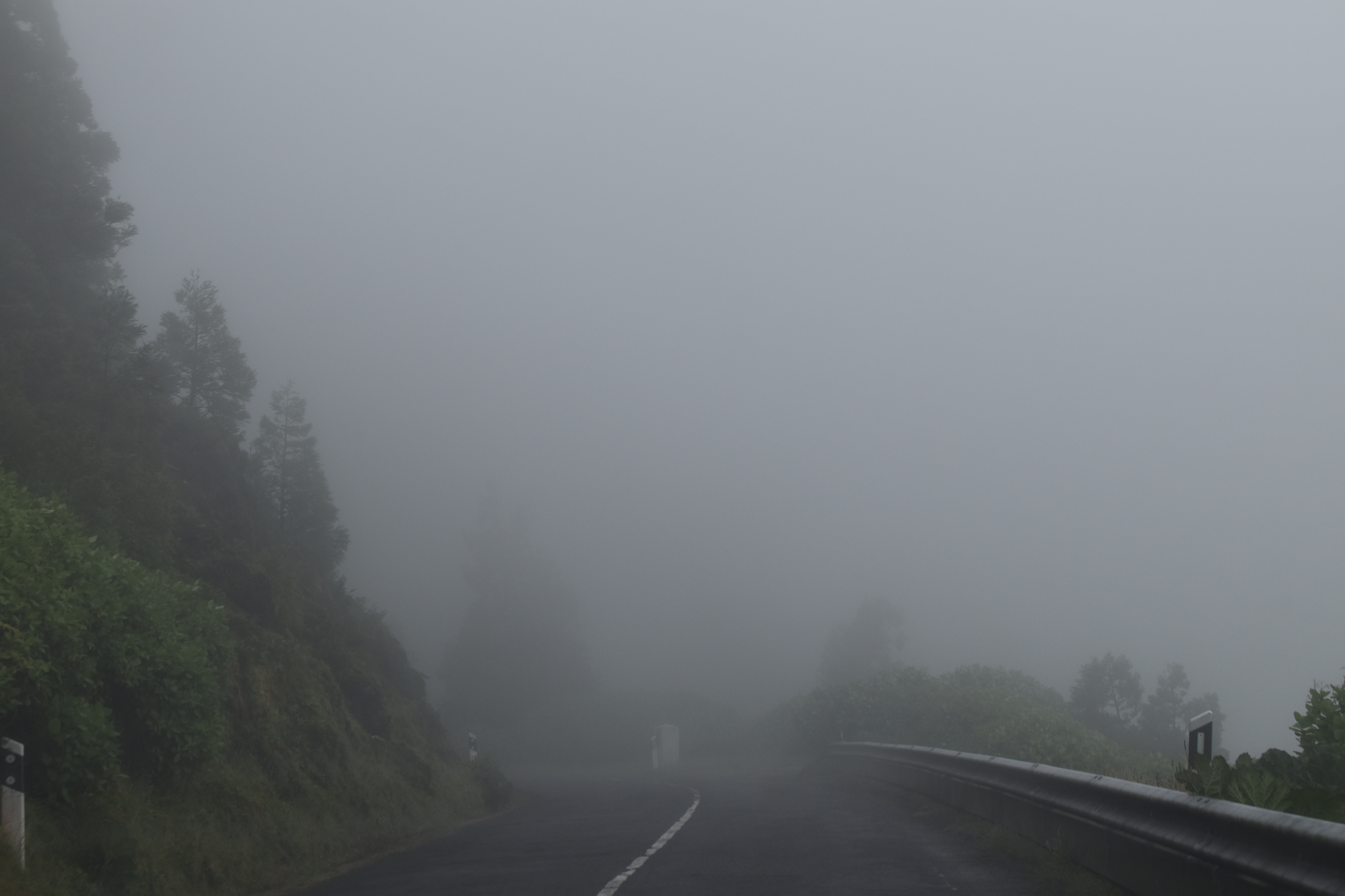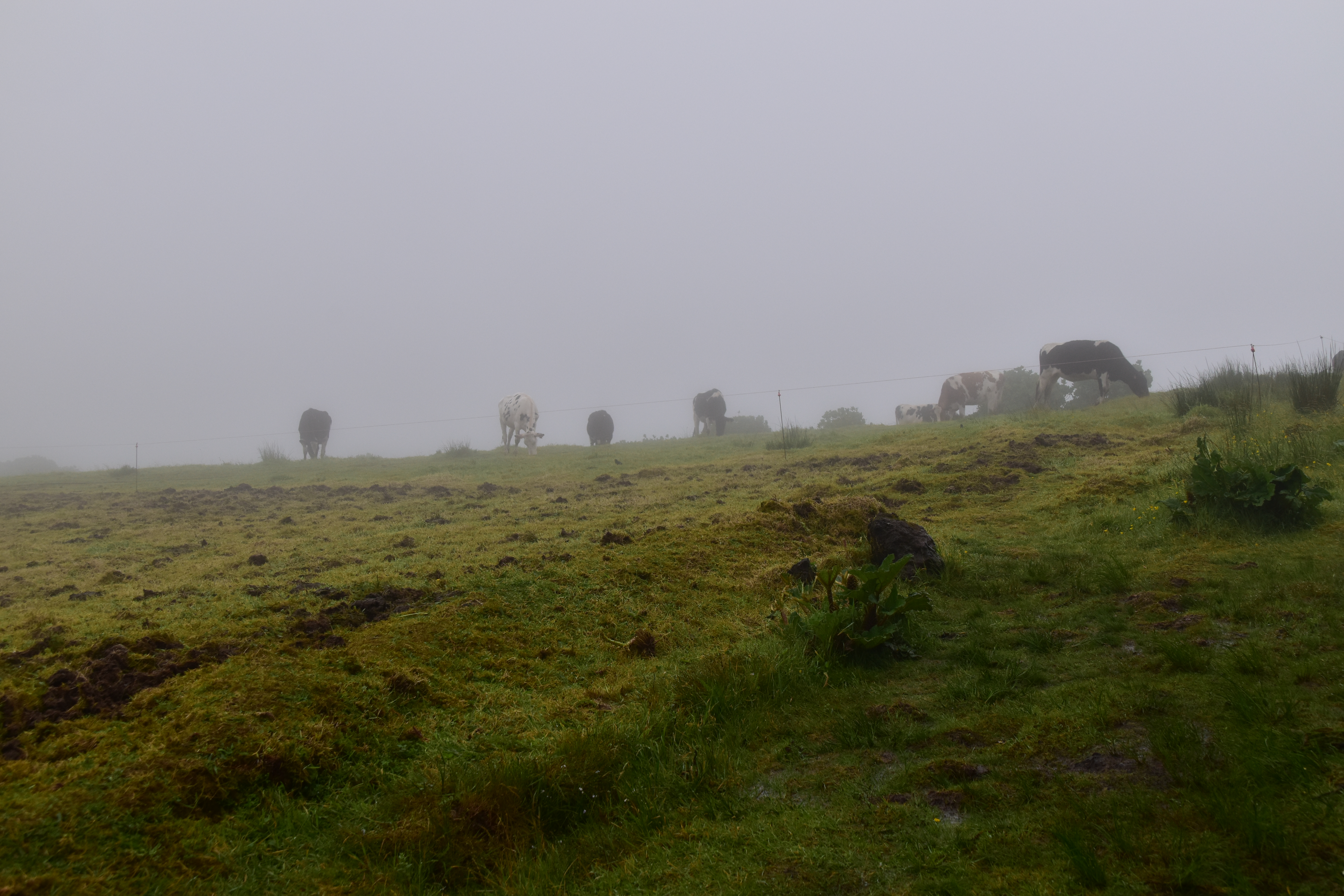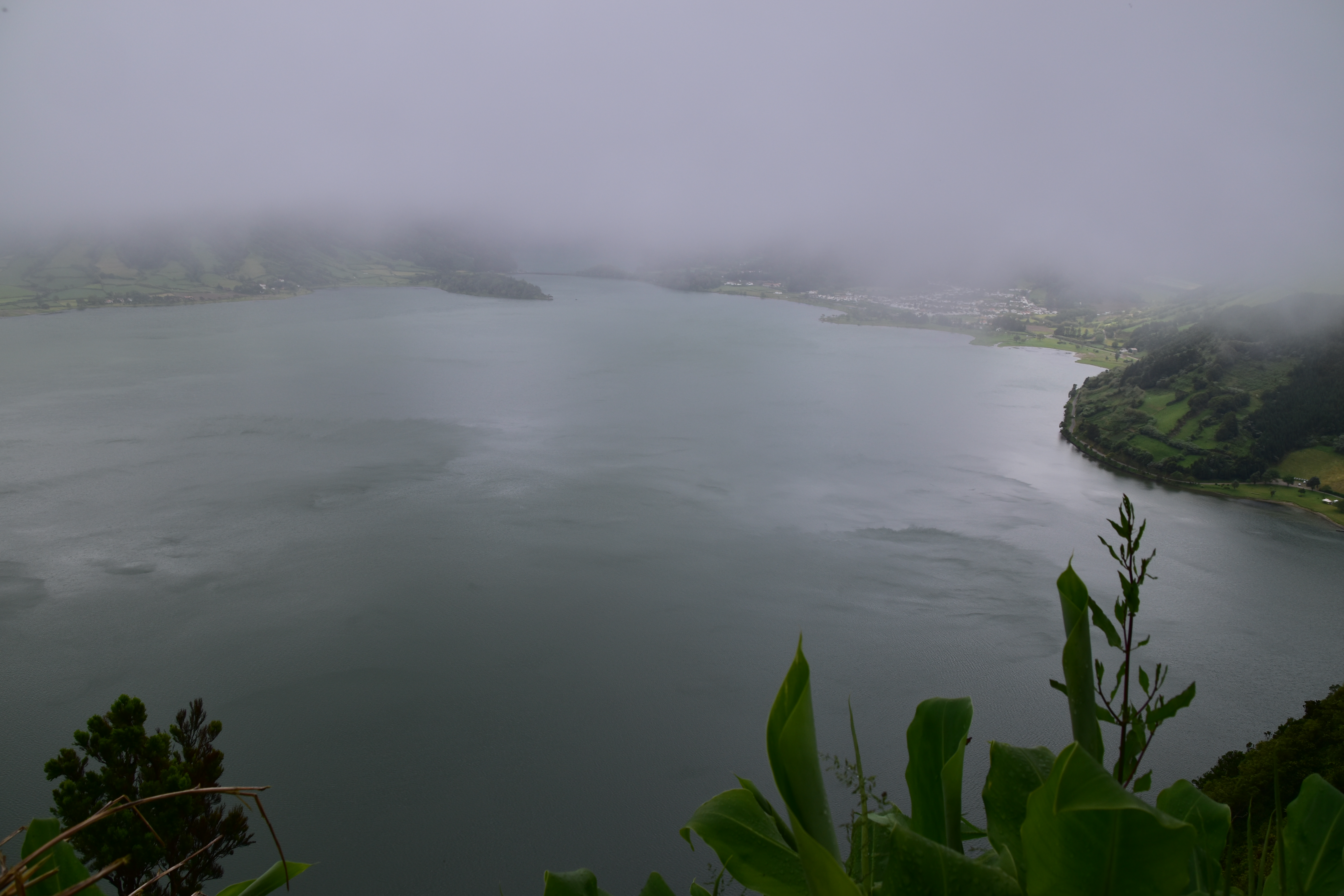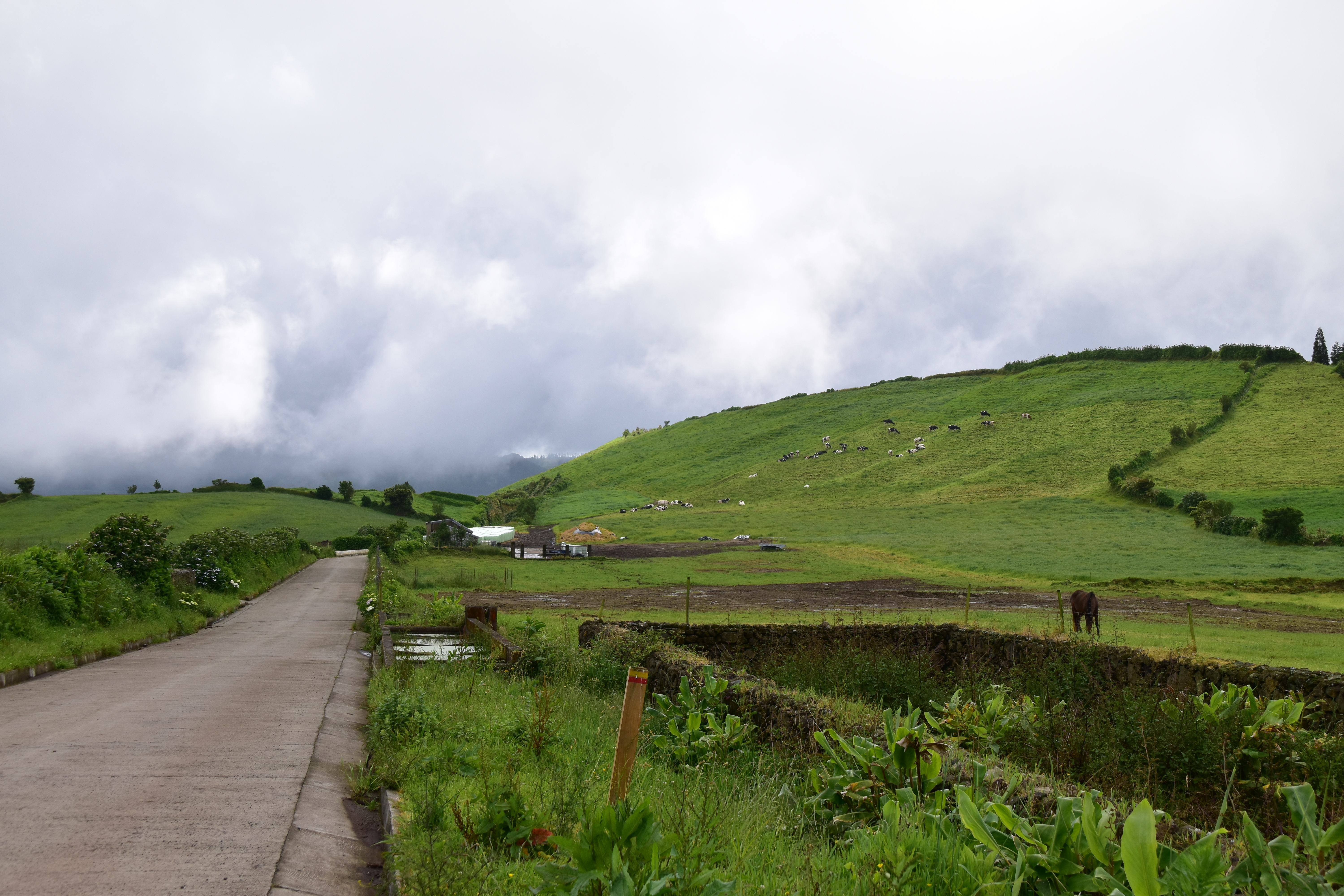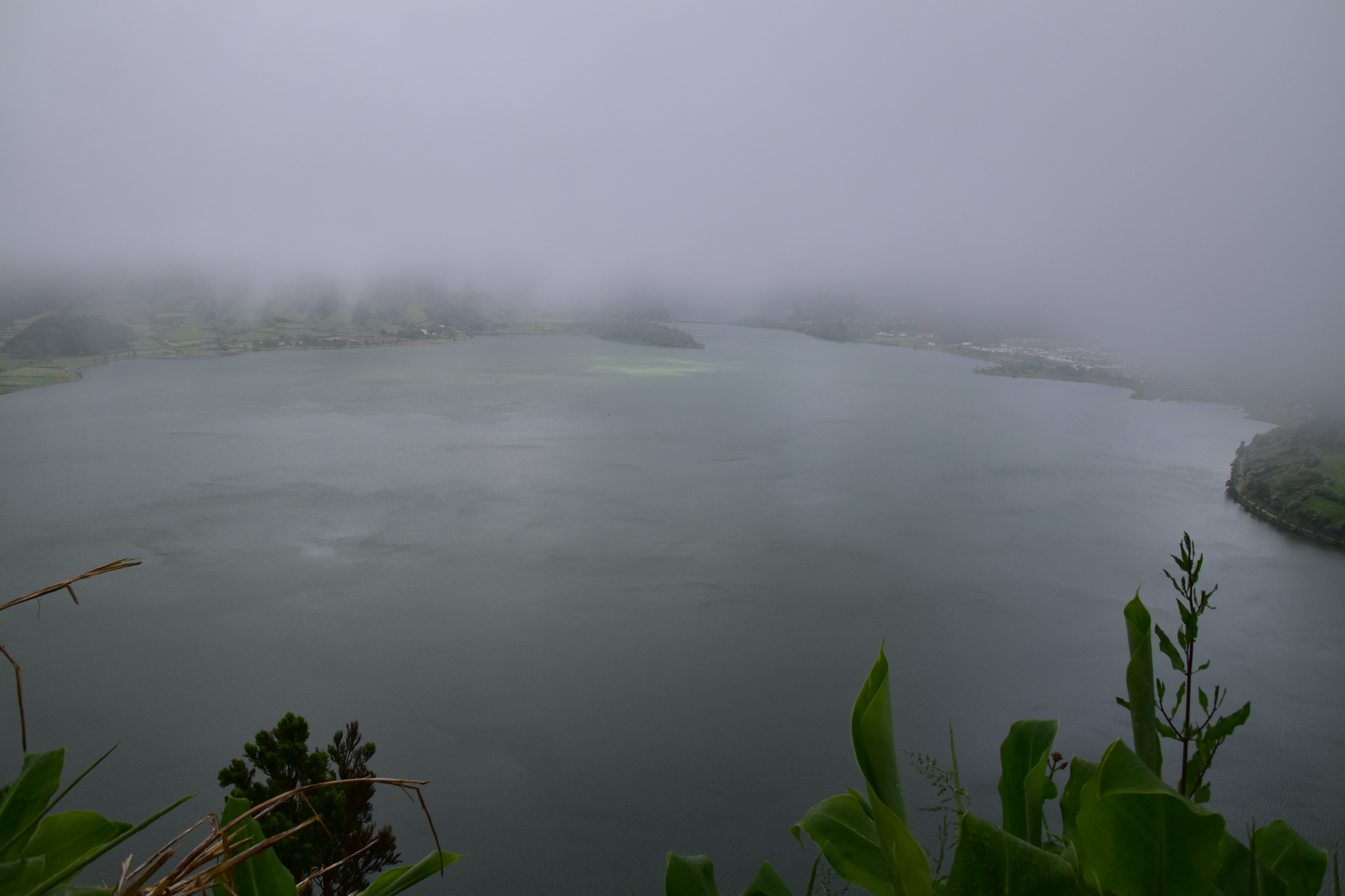 Le ciel est partiellement dégagé ce matin sur Ponta Delgada et nous tentons notre chance pour Sete Cidades. Toutefois en montant vers les points de vue, nous finissons par perdre presque complètement le paysage des deux côtés de la route. Cela donne un aspect très romantique au trajet, et nous arrêtons quand même à l'aqueduc pour prendre quelques photos, malgré le vent qui souffle à 1000 km/h au moins en nous fouettant au visage la brume contenue dans les nuages qui ont envahi toute la route.