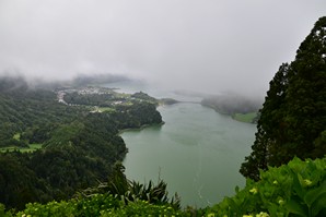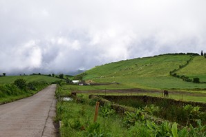 Nous redescendons sur Sete Cidades, et décidons de pousser jusqu'au point de vue de l'autre côté du lac ... c'est une petite, très petite route sur laquelle nous ne croisons que 2 vtt et des marcheurs, ce qui nous gêne un peu, mais nous avons la chance d'obtenir une courte vue sur les lacs avant que les nuages ne reviennent.