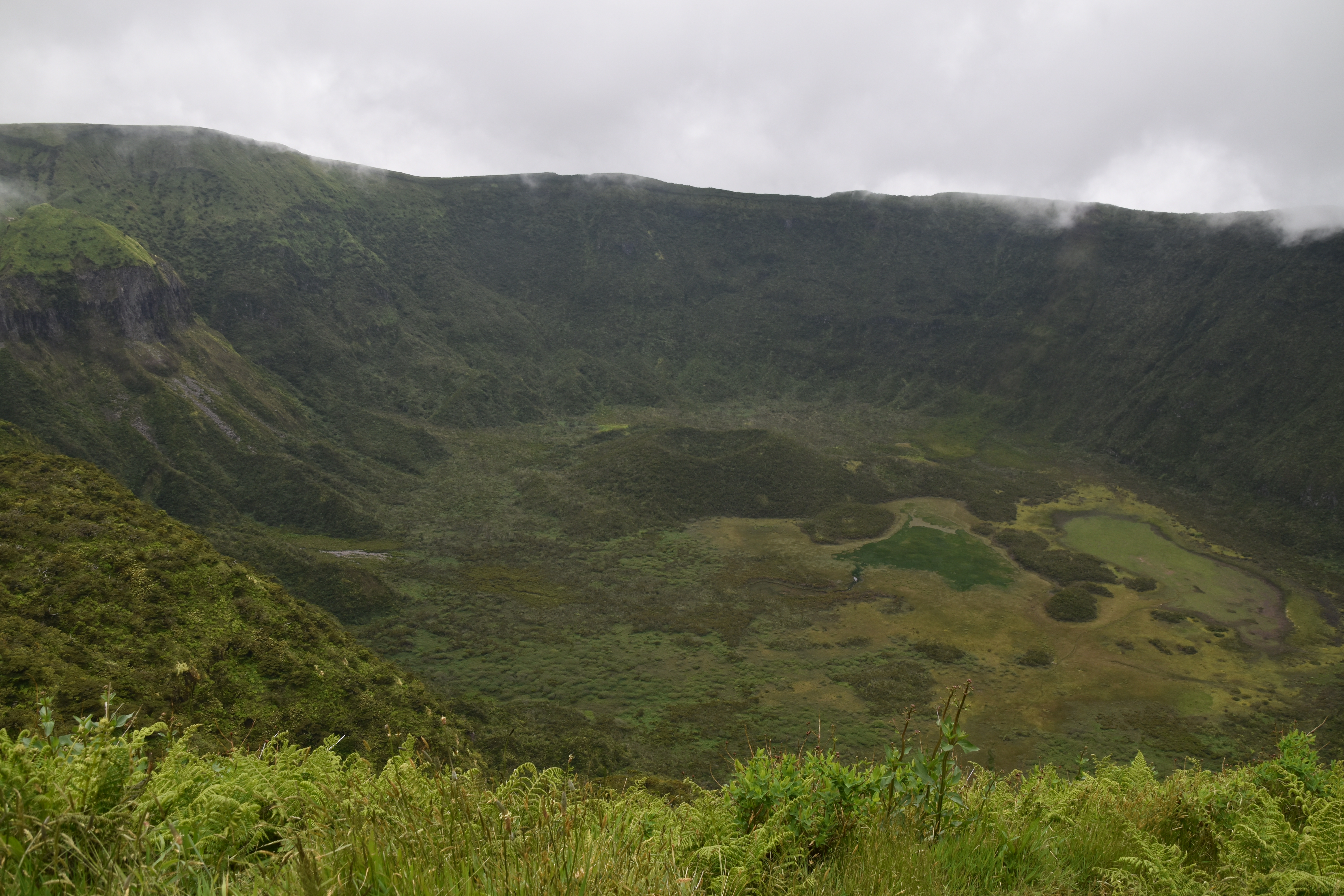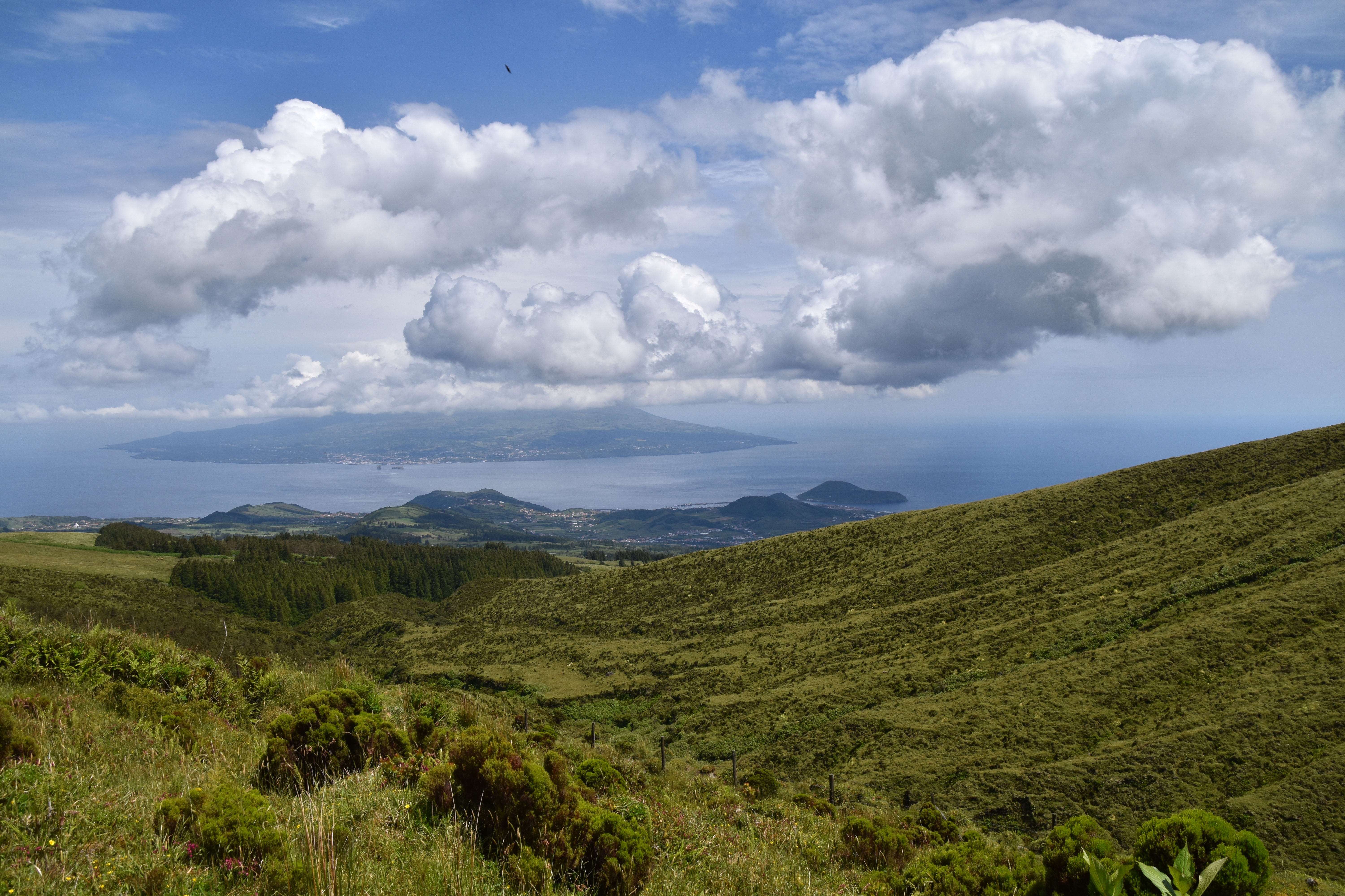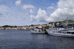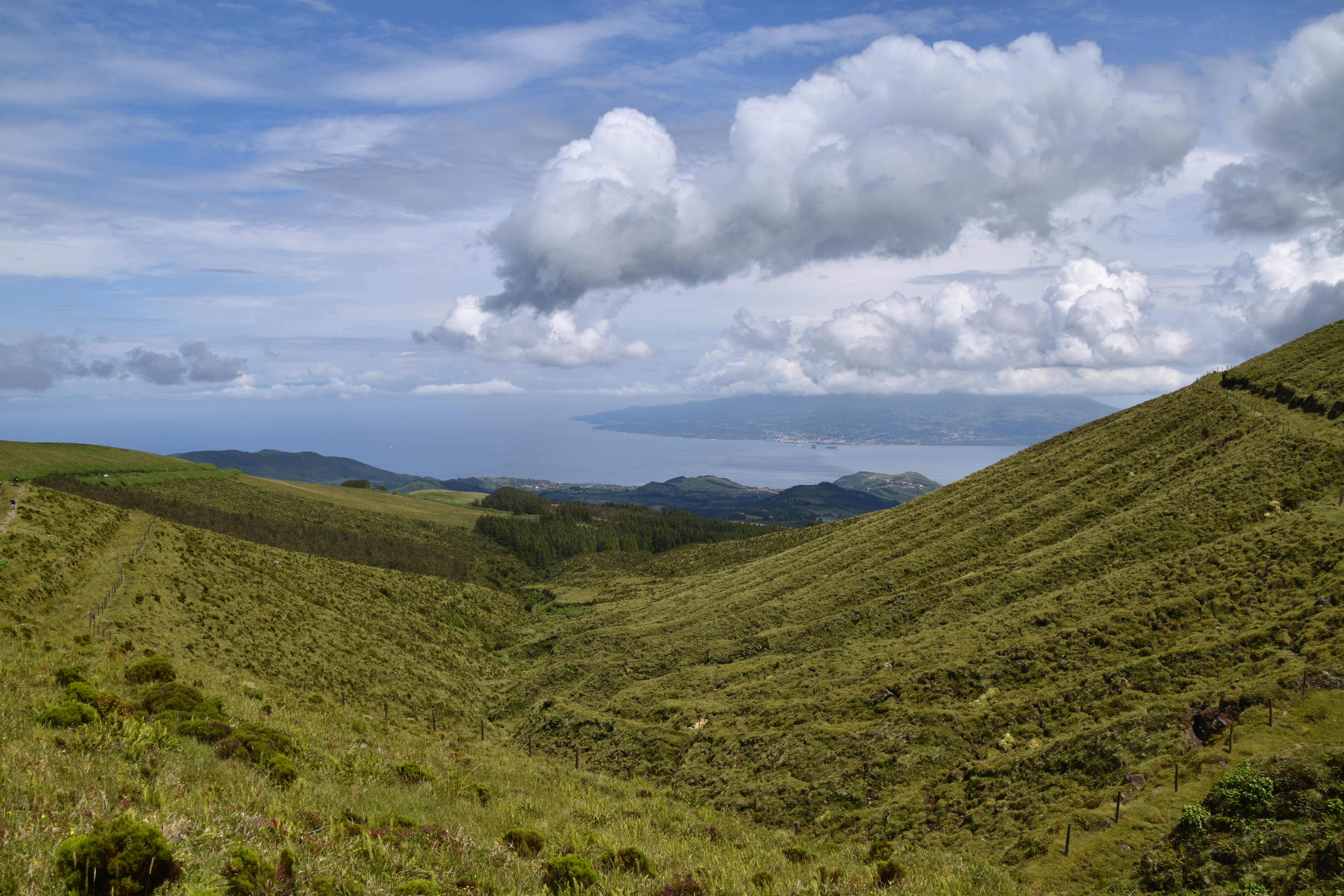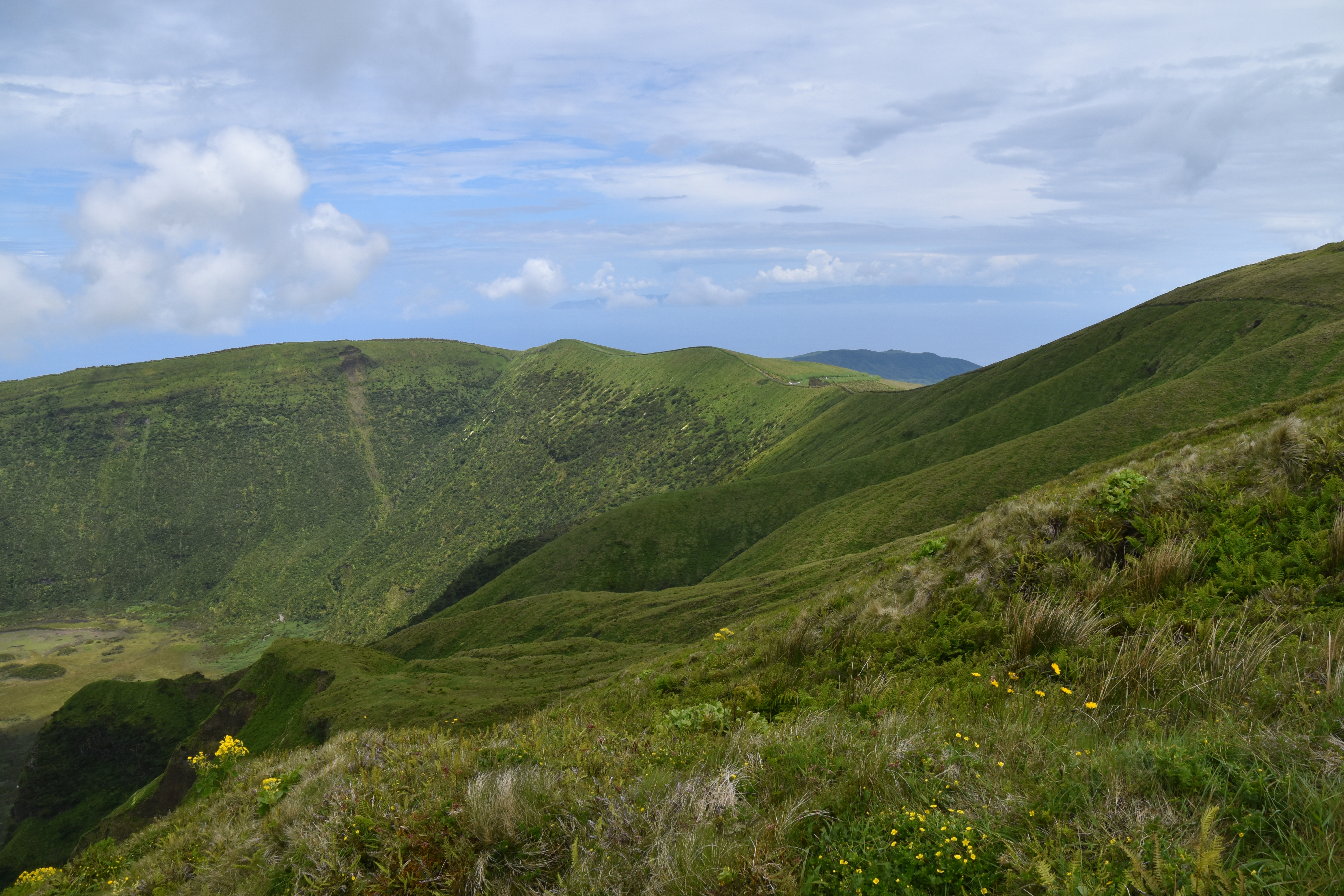 On prend le traversier ce matin, 11 kilomètres à peine pour rejoindre l'île de Faial. Dès notre arrivée, comme il fait beau, on se rend à la caldeira do cabeço gordo. Deux heures et demi pour faire le tour sur la crête, avec des vues magnifiques dans toutes les directions. C'est vraiment très beau.