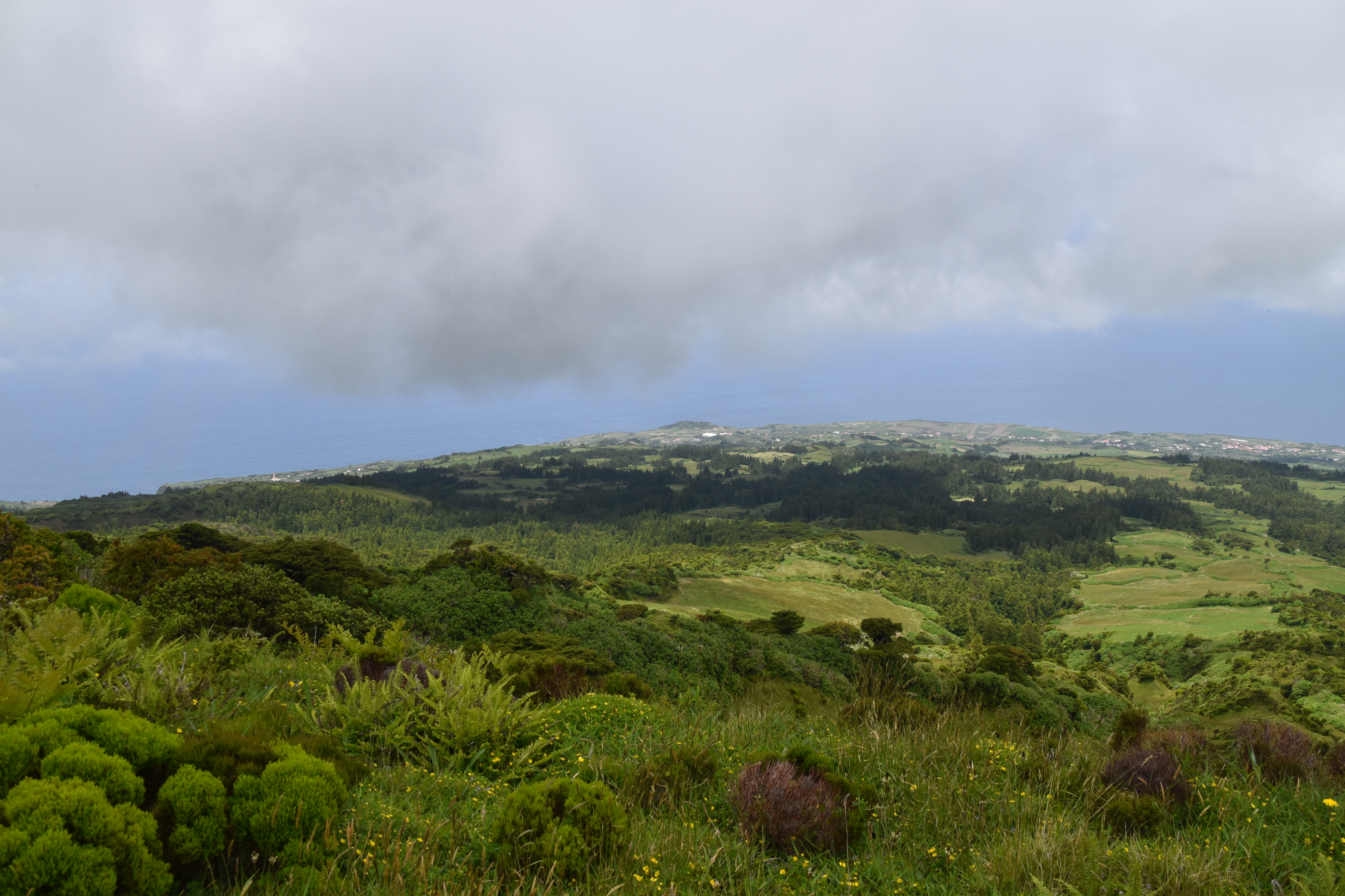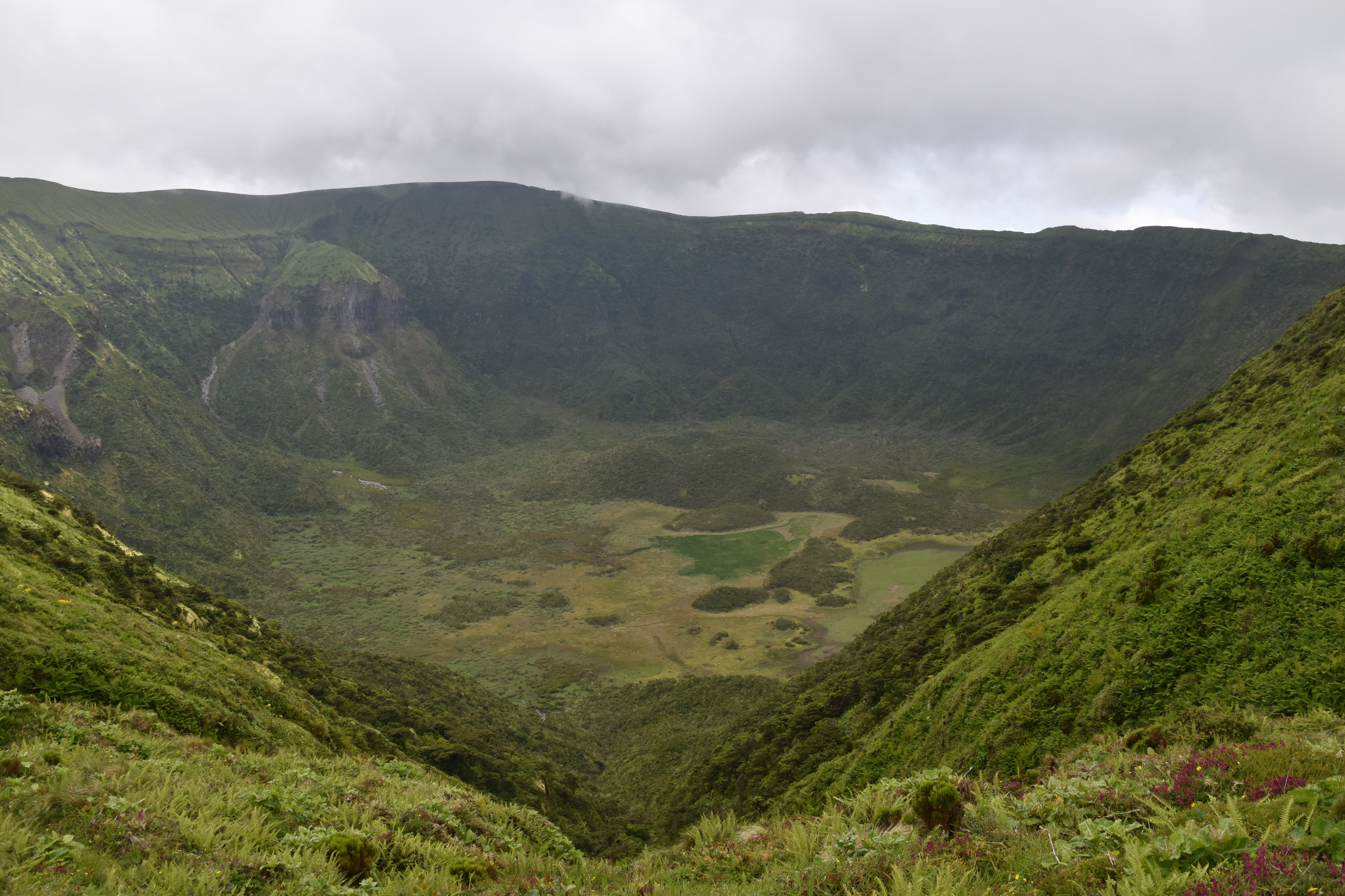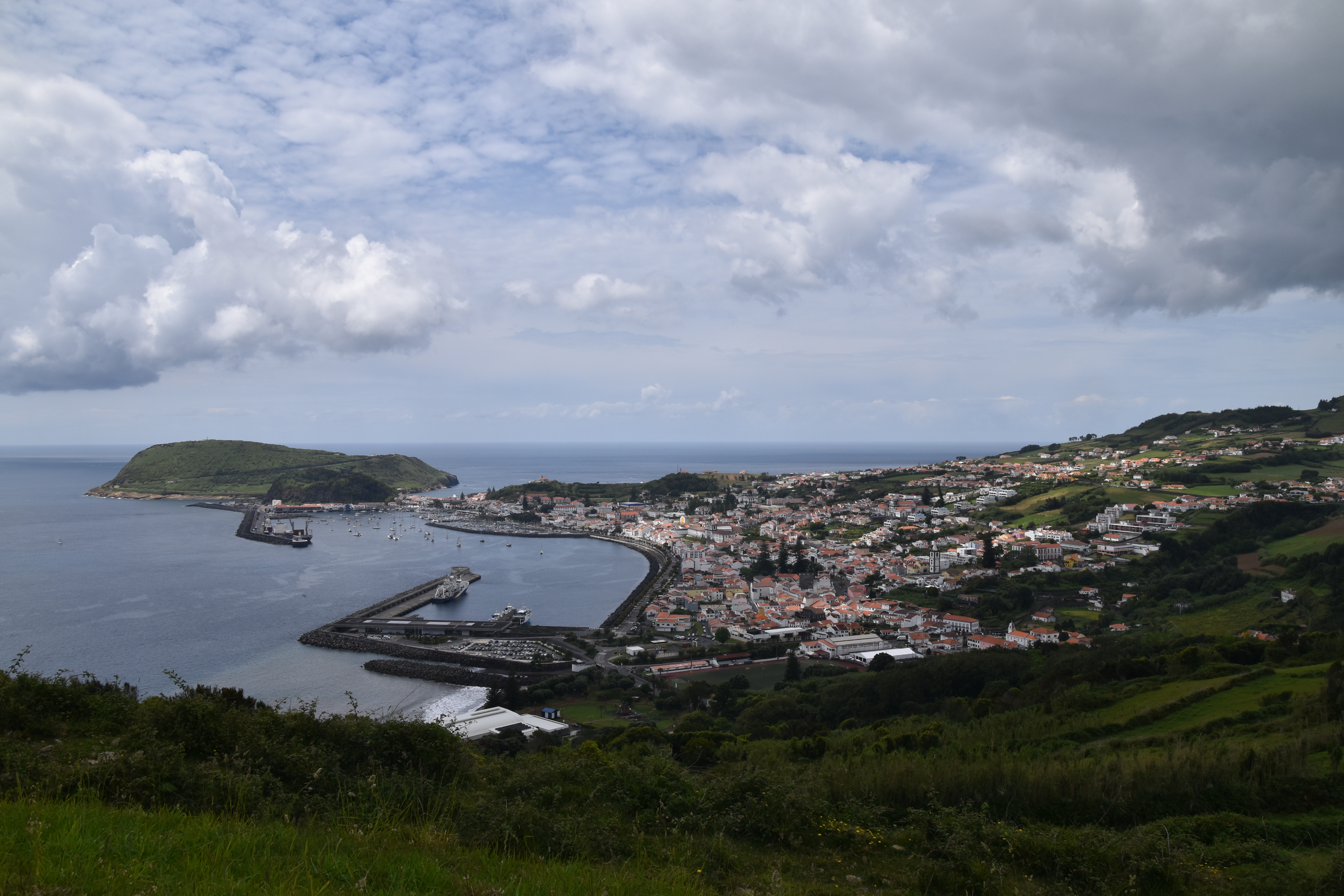 On prend le traversier ce matin, 11 kilomètres à peine pour rejoindre l'île de Faial. Dès notre arrivée, comme il fait beau, on se rend à la caldeira do cabeço gordo. Deux heures et demi pour faire le tour sur la crête, avec des vues magnifiques dans toutes les directions. C'est vraiment très beau.
