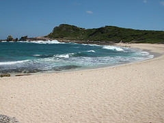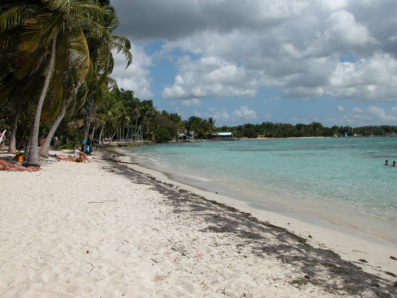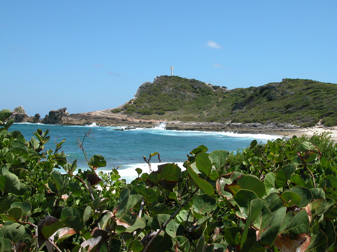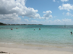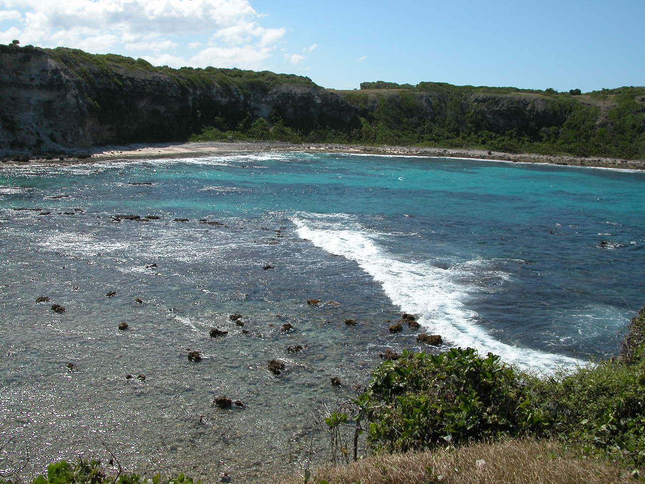 Nous nous levons tôt (c’est à dire 6h, heure où l’air climatisé cesse de fonctionner!), déjeunons rapidement puis partons en voiture faire le tour de Grande Terre. Nous prenons la route vers Pointe-À-Pitre puis vers la droite, pour faire le tour de Grande Terre dans le sens contre-horaire. Nous passons par Gosier, où nous prenons quelques photos de l’îlet Gosier, puis nous continuons jusqu’à Sainte-Anne. Nous sommes curieux d’aller y voir la plage de la Caravelle, où est installé le club med de la Guadeloupe. Malgré le grand nombre de voitures stationnées dans l’allée qui mène à la plage, il y a finalement peu de monde, comme partout où nous allons en fait. Le sable est blanc et fin, l’eau est donc turquoise et on aperçoit au loin le récif coralien sur lequel les vagues se brisent pour ensuite défiler doucement vers le bord. Le fond est complètement sablonneux, et très peu profond pendant plusieurs centaines de mètres : on a l’impression de se baigner dans une piscine! Au final, nous préférons les plages plus sauvages et de sable blond et la mer plus agitée de Basse-Terre.