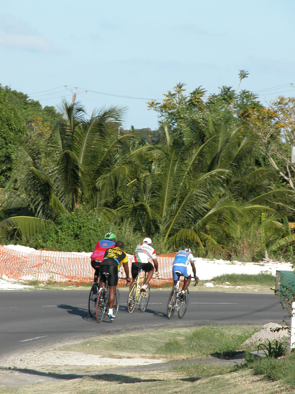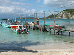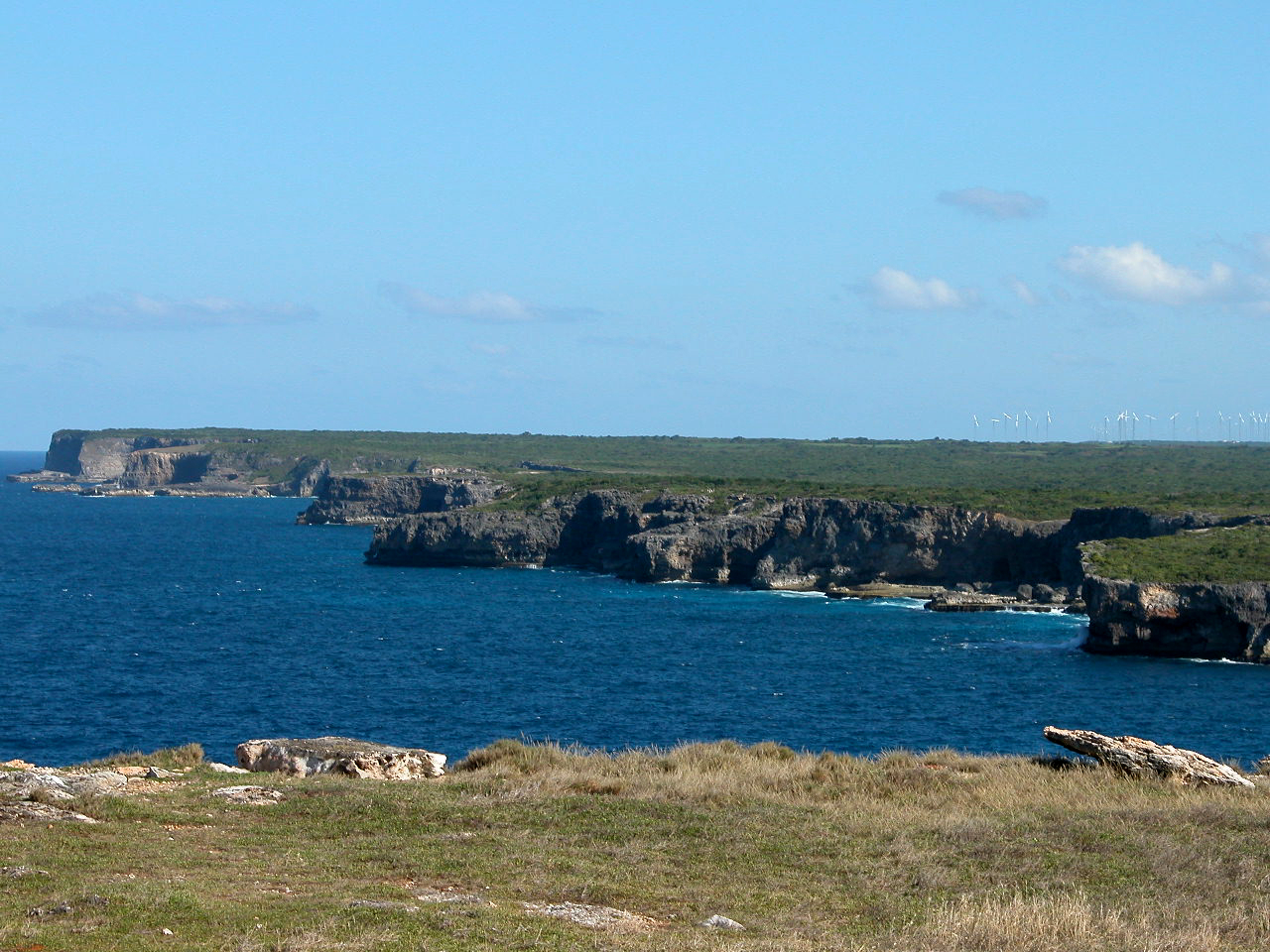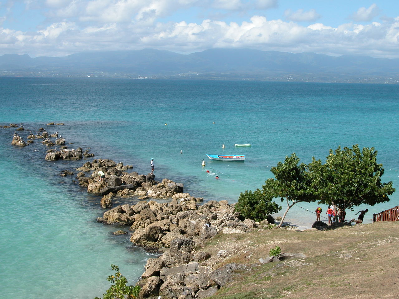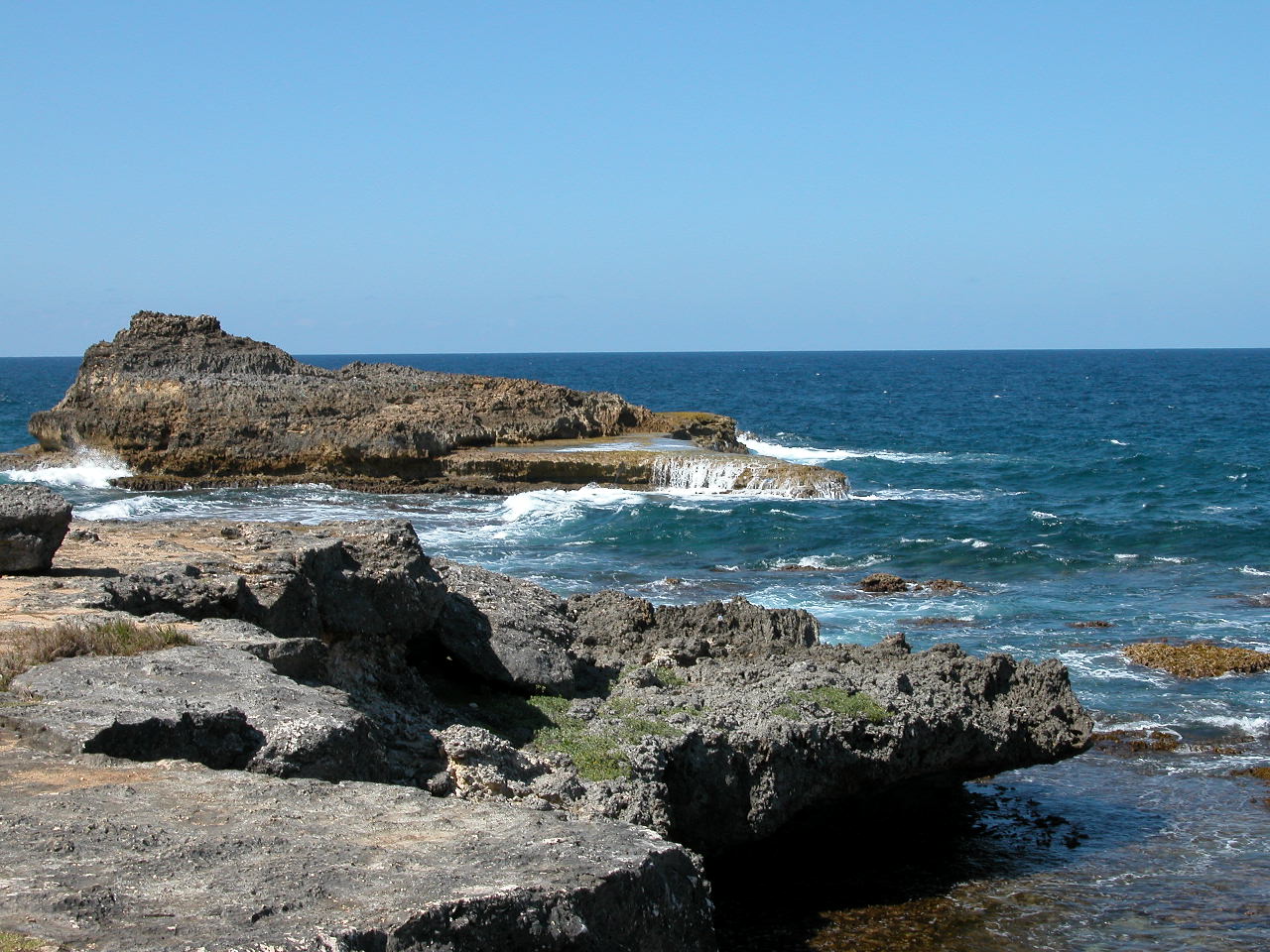 Nous nous levons tôt (c’est à dire 6h, heure où l’air climatisé cesse de fonctionner!), déjeunons rapidement puis partons en voiture faire le tour de Grande Terre. Nous prenons la route vers Pointe-À-Pitre puis vers la droite, pour faire le tour de Grande Terre dans le sens contre-horaire. Nous passons par Gosier, où nous prenons quelques photos de l’îlet Gosier, puis nous continuons jusqu’à Sainte-Anne. Nous sommes curieux d’aller y voir la plage de la Caravelle, où est installé le club med de la Guadeloupe. Malgré le grand nombre de voitures stationnées dans l’allée qui mène à la plage, il y a finalement peu de monde, comme partout où nous allons en fait. Le sable est blanc et fin, l’eau est donc turquoise et on aperçoit au loin le récif coralien sur lequel les vagues se brisent pour ensuite défiler doucement vers le bord. Le fond est complètement sablonneux, et très peu profond pendant plusieurs centaines de mètres : on a l’impression de se baigner dans une piscine! Au final, nous préférons les plages plus sauvages et de sable blond et la mer plus agitée de Basse-Terre.
