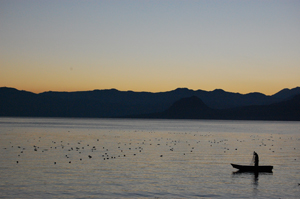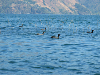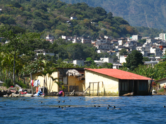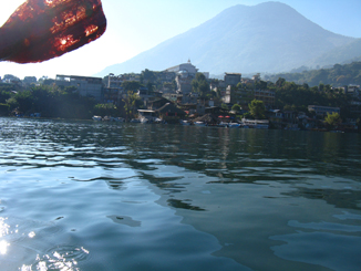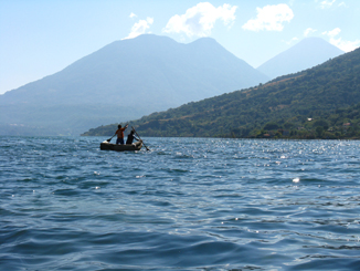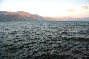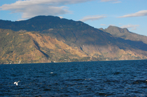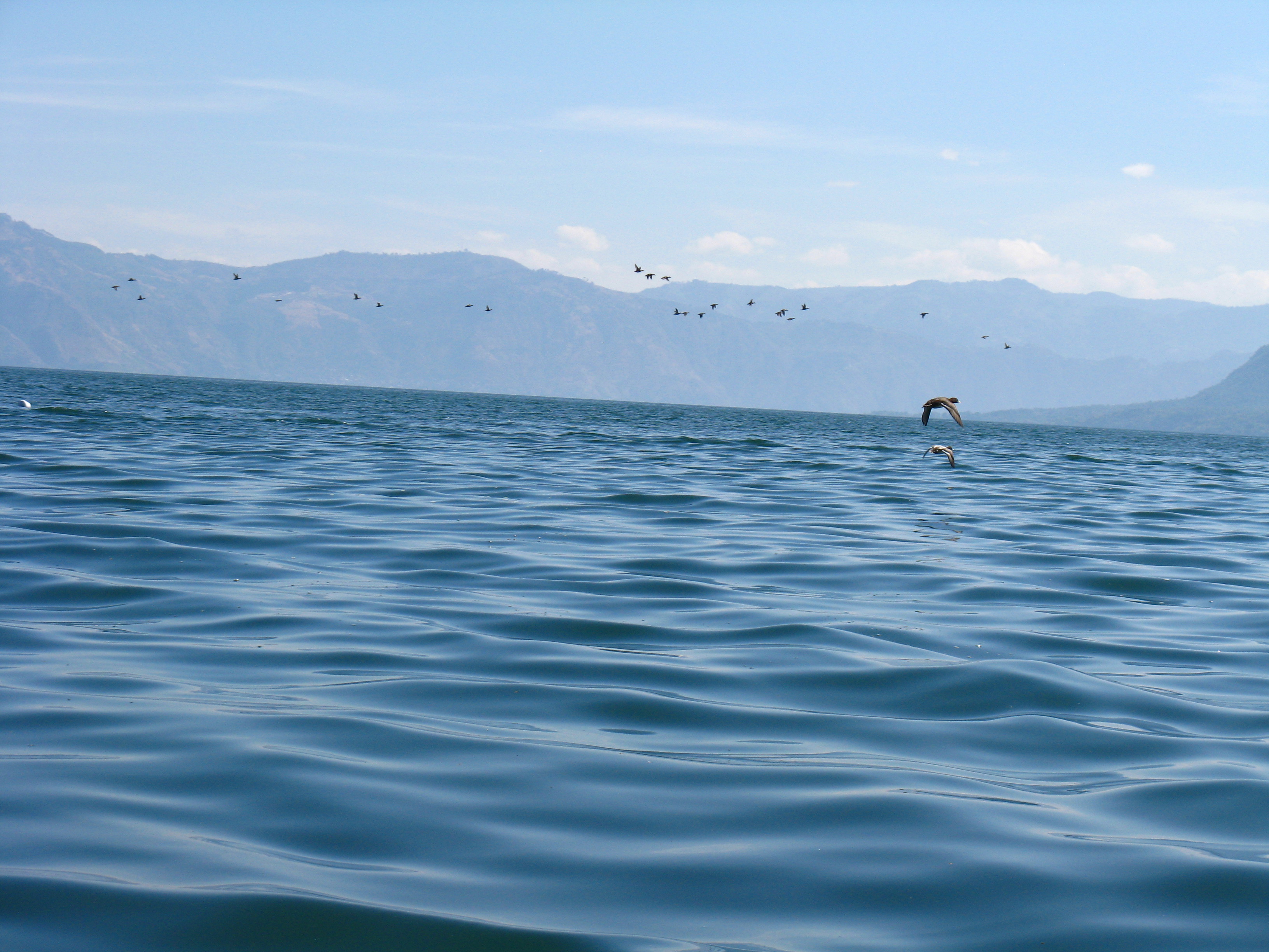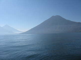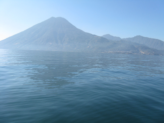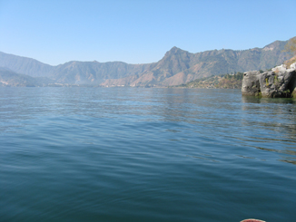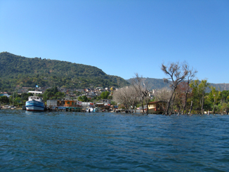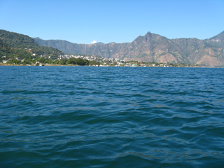 Nous longeons plus ou moins la rive puis arrivés à une pointe rocheuse nous retraversons le lac vers le volcan San Pedro et son village. Nous revenons par la rive de San Pedro ce qui nous donne le loisir d'observer notre hôtel vu du lac ainsi que la maison du proprio dans laquelle s'engouffrent de bonnes vagues car le vent s'est levé et nous pousse dans le dos jusqu'au quai du retour, à 11h30.