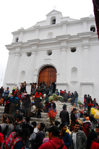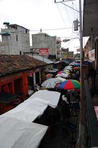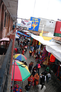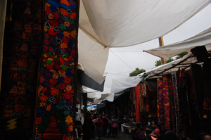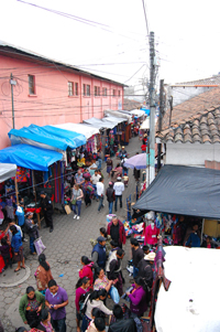 Nous avions mis le cadran à 7h00 mais 3 innocents nous ont réveillés à 5h du mat en discutant assis dans les chaises sur la veranda devant notre chambre et celle de nos voisins. Comme c'est le 2e matin en ligne que ces idiots nous réveillent, je me suis habillée et ai ouvert la porte: ils m'ont regardée l'air surpris, je leur ai dit: hey, por favor, tchhhhtttt!, et ils ont déguerpi quelques minutes plus tard. Mais évidemment, nous ne nous sommes pas rendormis. Le vent n'a pas diminué, il a soufflé toute la nuit et il souffle toujours avec force ce matin et les vagues sont encore hautes. Nous partons à pied vers 7h30 pour aller attendre la navette pour chichi. Étonnamment, la navette arrive à 7h50, soit 10 minutes avant l'heure prévue! Nous partons prendre d'autres gens dans le village et 1 personne à san marcos puis nous "filons" (façon de parler, étant donné l'état de la route) vers chichi. Nous rebroussons chemin jusqu'à l'autoroute que nous empruntons en direction de Antigua pour quelques kilomètres puis nous bifurquons pour nous rendre vers chichi. La route sinue mais elle n'est pas mauvaise. Nous arrivons un peu plus tard que prévu car une passagère a des petits problèmes intestinaux et nous devons nous arrêter à quelques reprises pour los servicios. Nous arrivons à 10h20 à chichi. La navette se stationne à quelques pas de l'entrée du marché. Nous marchons dans les rues très achalandées où somme toute les touristes ne sont pas les plus nombreux en ce dimanche. Il y a beaucoup de locaux venus faire des bonnes affaires. Nous n'achetons pas grand chose: un poncho pour stef qui gèle car il ne fait pas la même température à chichi qu'à san pedro et il tombe de temps en temps une petite pluie agaçante, une grande couverture tissée à la main et un chapeau pour Martin. Le reste du temps nous errons dans les rues du marché et au bout du compte 1 heure aurait amplement suffi ce qui signifie qu'en réalité, cette excursion n'en vaut pas la peine. Le coût n'est pas élevé du tout mais le trajet est long: 4 heures de route pour aller magasiner ... nous ne sommes pas convaincus!