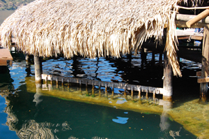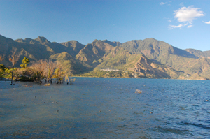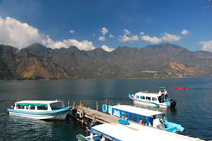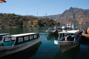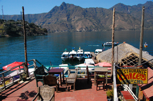 Nous mangeons 2 tipicos énormes avec café et thé puis relaxons un peu en faisant les plans pour la journée et les jours qui viennent. Vers midi nous partons en reconnaissance en ville. Il fait vraiment très chaud au soleil et nous en concluons que nous ferons probablement l'impasse sur la rando au San Pedro car même en partant tôt, nous arriverions au sommet en pleine chaleur et terminerions la journée avec un sérieux mal de bloc au minimum, étant donné notre intolérance totale à la chaleur. Nous entrons à l'agence Maya Tzutujil pour s'informer du forfait pour Chichicastenango dimanche prochain, jour de marché. L'excursion prendra toute la journée, départ à 8h00 et retour vers 16h. Nous prenons aussi des informations pour aller faire du kayak dans le courant des matinées qui viennent. Il faudra y aller tôt parce qu'après 10h il n'est plus question de s'agiter! Nous marchons jusqu'au quai Panajachel où nous nous assoyons sur la terrasse de Chile's pour manger un curry de légumes pour stéphanie et un banana split pour martin, en buvant des margaritas. Comme partout jusqu'à présente le service est d'une lenteur extrême, mais comme nous sommes à l'ombre d'un parasol cela ne nous gêne pas trop. Nous observons l'ancien quai visible à quelques pieds sous le niveau d'eau actuel. Le proprio du resto nous explique qu'il est confiant que le niveau de l'eau redescendra à nouveau éventuellement. Il n'élabore pas sur le comment de la chose toutefois. Nous revenons à l'hôtel tranquillement par les petits passages piéton qui sillonnent la ville.