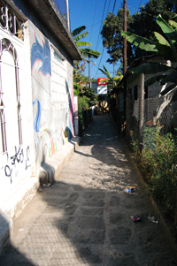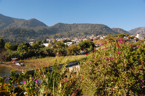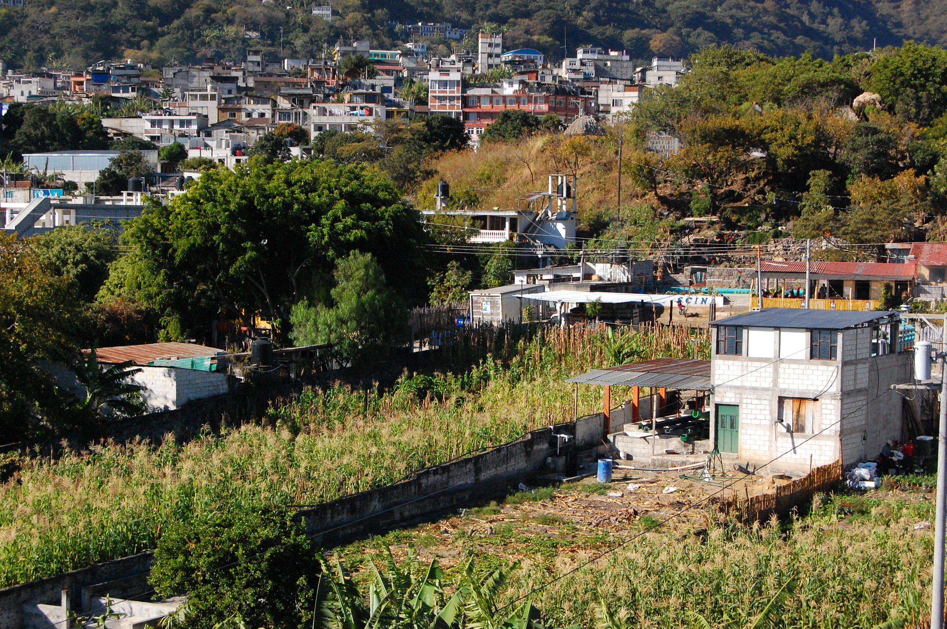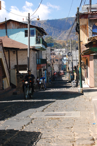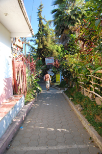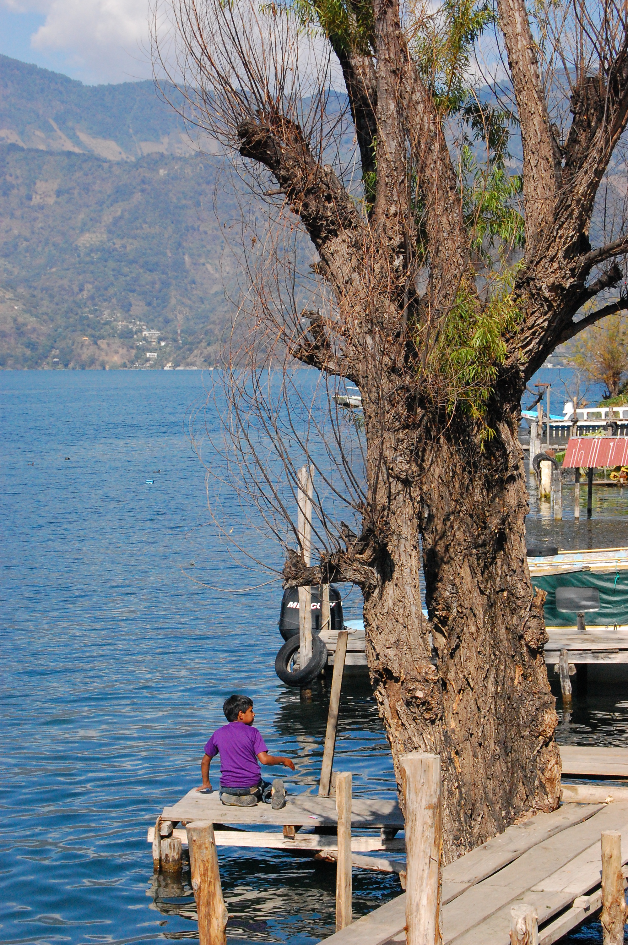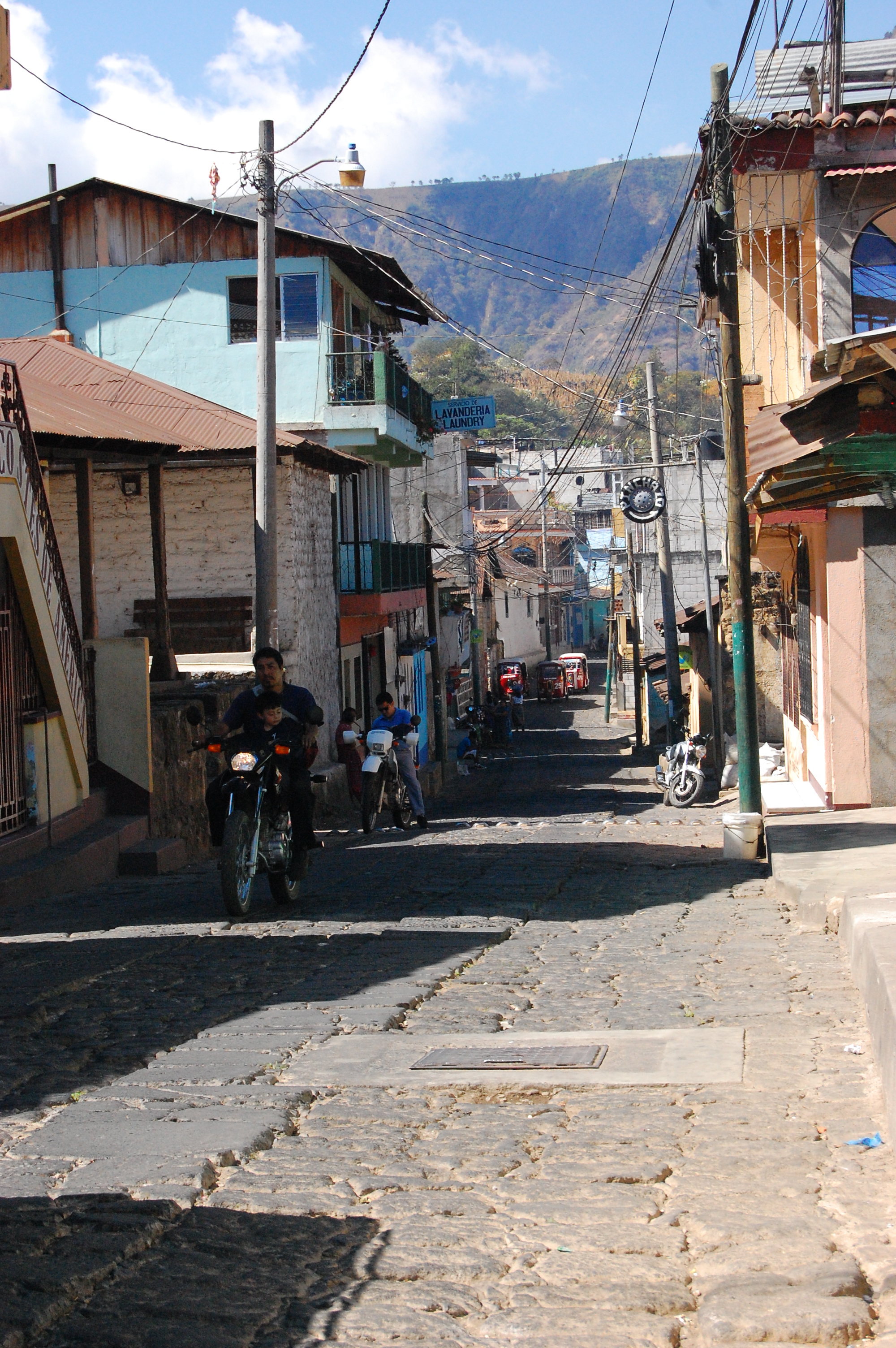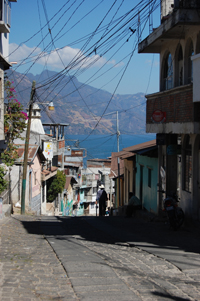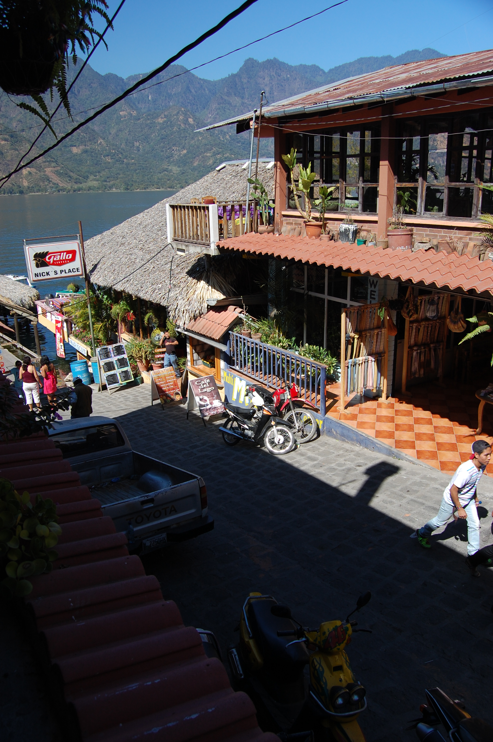 Après nous être couchés trop tôt, nous nous éveillons trop tôt. Nous nous rendormons et filons jusqu'à 9h00. Trop tard pour partir en kayak, nous montons déjeuner sur la terrasse à 10h00. Puis nous partons nous promener en ville dans la partie que nous n'avons pas encore parcourue, la "haute ville" en quelque sorte. Il y a moins de touristes, il n'y en n'a pas à vrai dire. Nous marchons dans les quelques rues, c'est vraiment petit comme village. Les gens nous saluent, tout le monde est très sympathique. Nous redescendons ensuite vers le quai de Panajachel et nous buvons 2 batidos chez Nick's place où le service est nettement meilleur que la veille au Chile's.