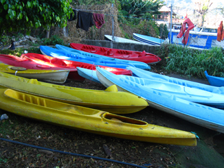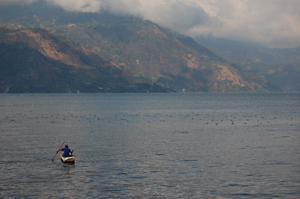 Tout le matériel est dans un état lamentable, les kayaks sont pleins d'eau que nous tentons d'éponger tant bien que mal avec un vieux tshirt que le monsieur nous tend. Nous choisissons un kayak sit on double, accceptons le fait que nous aurons les fesses trempées et partons. Le kayak en plastique à fond plat ne se dirige pas très bien mais le lac est très calme. Nous n'avançons pas vite mais nous ne sommes pas pressés. À 8h30, le soleil est déjà cuisant. Tout est tranquille, peut-être parce que c'est samedi matin. Nous pagayons vers San Pablo, suivons la côte vers l'est jusqu'à San Marcos puis revenons face au volcan vers Santiago Atitlan.