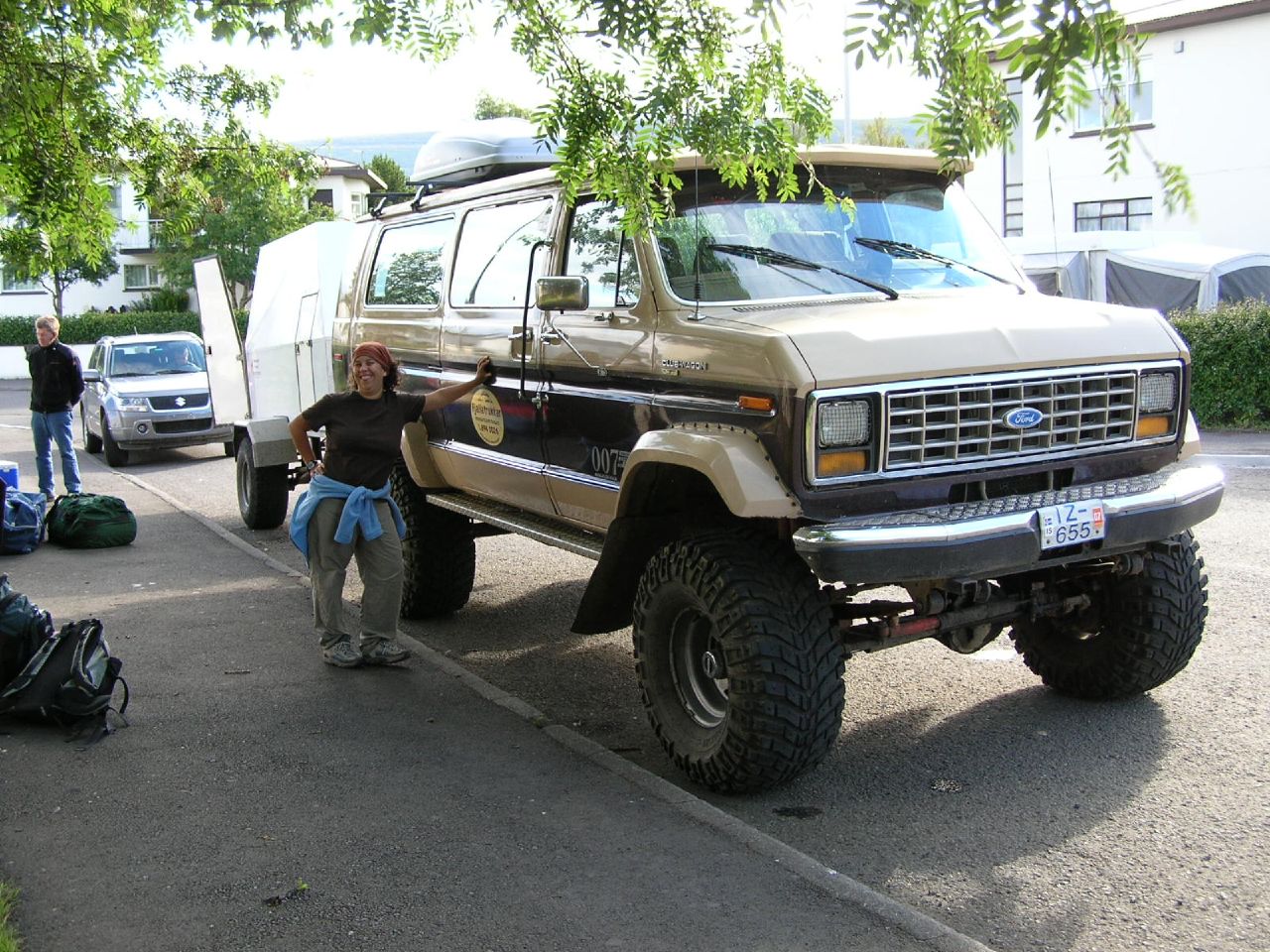 Départ en fourgonnette jackée avec remorque pour les bagages.