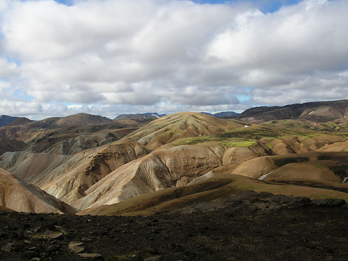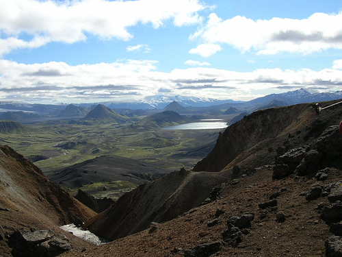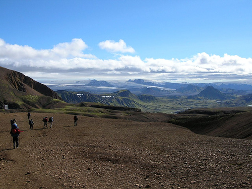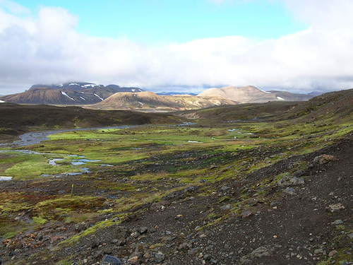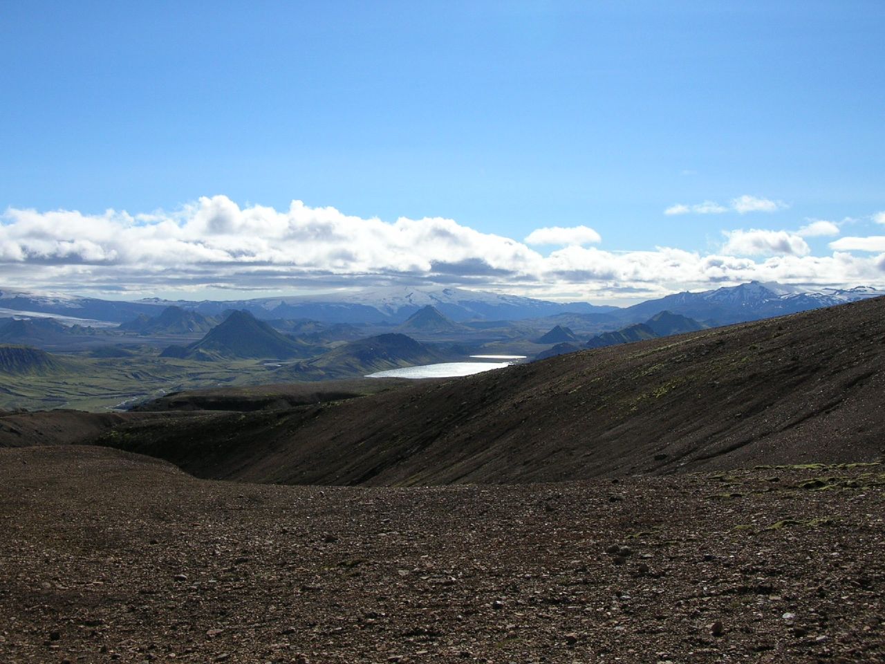 fumerolles près d'un glacierNous dînons au refuge (ce qui nous ravit, car cela fait un 3e repas de moins à transporter !) puis nous quittons pour la 2e journée du trek qui nous mènera à Alftavatn. Journée de 12km, incluant une traversée de rivière, en sandales, dans une eau glaciale. Les paysages sont toujours magnifiques et nous apercevons 2 heures avant d’y arriver le refuge au bord d’un lac. La descente finale pour s’y rendre est assez raide mais la vue est si splendide que nous n’y pensons même pas.