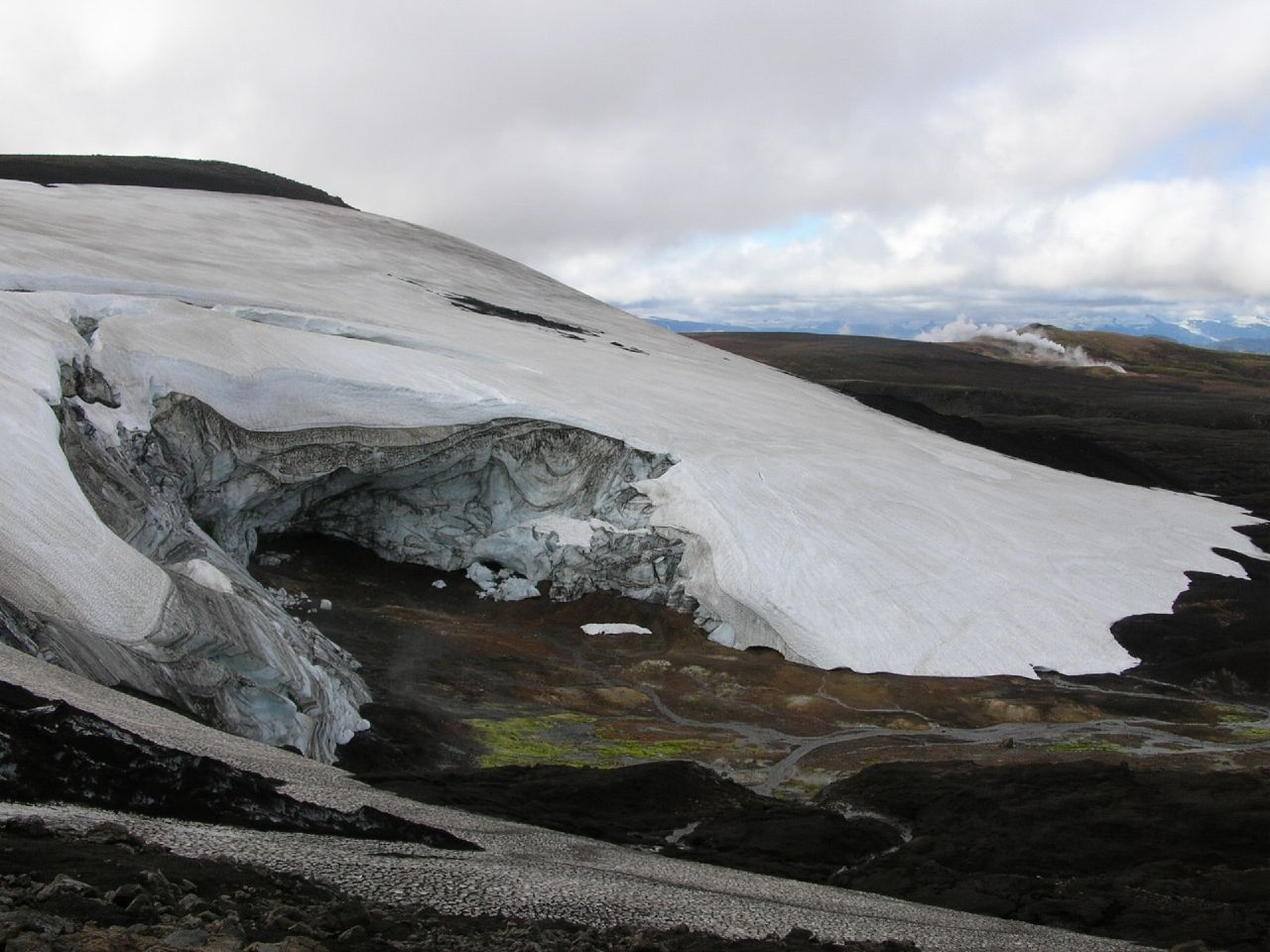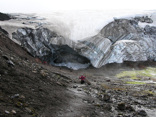 Le beau temps est de retour et ne nous quittera plus de tout le trek. Nous avons eu une chance presqu’impossible et je n’ose pas imaginer ce que serait devenu ce trek si le vent avait soufflé et s’il avait neigé et plu comme la première journée, particulièrement lors des montées et descentes abruptes. Après le déjeuner, nous faisons une courte randonnée pour aller voir des grottes de glace formées par la fonte d’un glacier. Nous ne nous approchons pas trop, car la chaleur des sources tout près et la température rendent la structure très instable. Nous apprendrons le lendemain soir qu’un homme est mort enseveli à cet endroit le lendemain de notre visite, nouvelle pour le moins troublante.