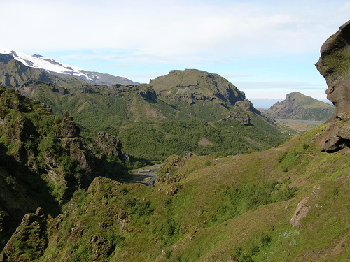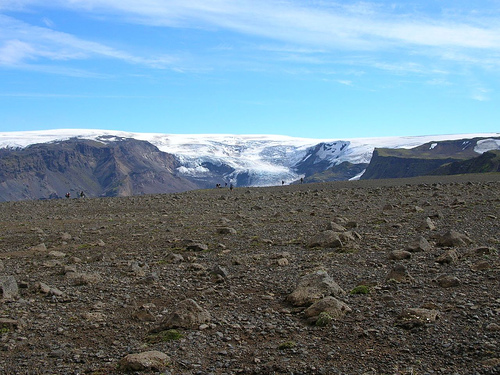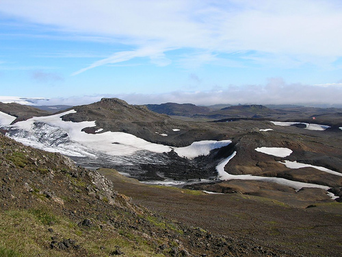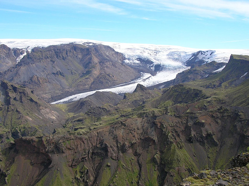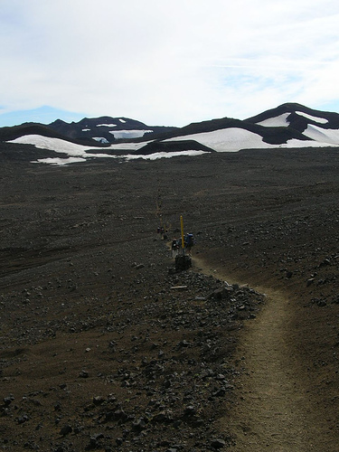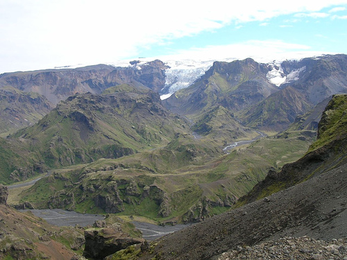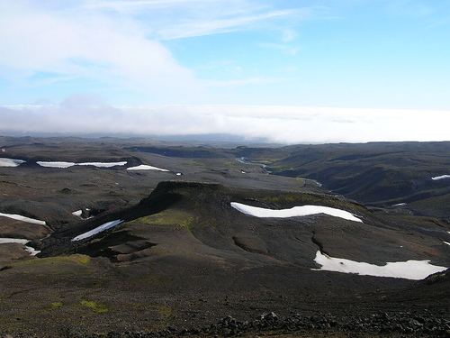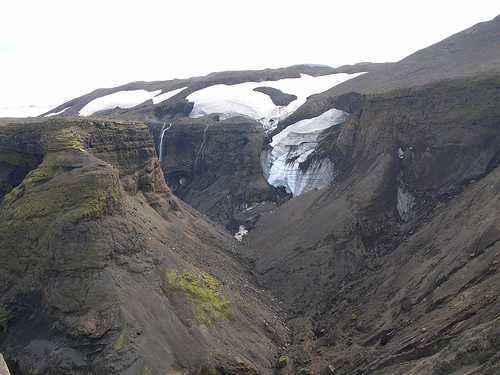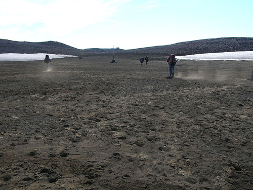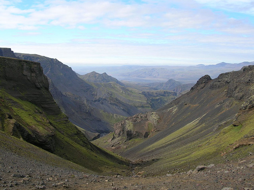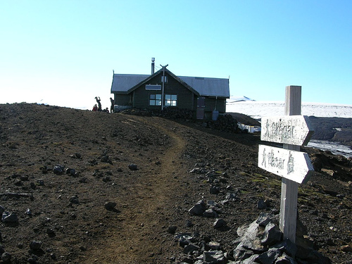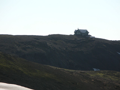 Nous apercevons le refuge Fimmvorduskalid d’assez loin, à la fin d’une traversée de la traversée d'un etit désert poussiéreux. Il est situé sur un promontoire d’où la vue est vraiment à couper le souffle (encore une fois !)
