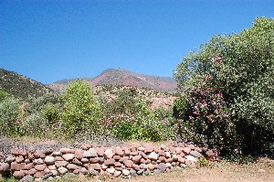 Nous repartons ensuite sur une piste désagréable où nous nous tordons les chevilles et roulons sur les gros cailloux à chaque pas. Le guide nous fait prendre des "raccourcis" qui descendent abruptement pour éviter quelques virages mais au bout du compte, comme nous devons descendre très lentement pour ne pas débouler, nous ne sommes pas convaincus au niveau de l'économie de temps ... Le Zat que nous apercevons en bas nous semble bien loin et bien petit, mais finalement, après n'avoir regardé que nos pieds pendant deux heures, nous parvenons à la piste qui longe la rivière, bordée de magnifiques lauriers sauvages. Nous continuons sur cette piste jusqu'au village où nous picniquons sous les oliviers en attendant la voiture qui vient nous chercher pour nous ramener avec notre guide, à Thighdouine puis au riad en ce qui nous concerne. Nous arrivons vers 17h00 au riad où nous enlevons nos bottes et nos vêtements poussiéreux pour plonger dans la piscine et boire un verre de vin rosé. La soirée se termine avec un excellent tagine de boulettes de sardines suivi d'un délicat feuilleté aux arachides. Nous sautons avec joie dans le lit confortable pour une première bonne nuit de sommeil depuis 4 jours.