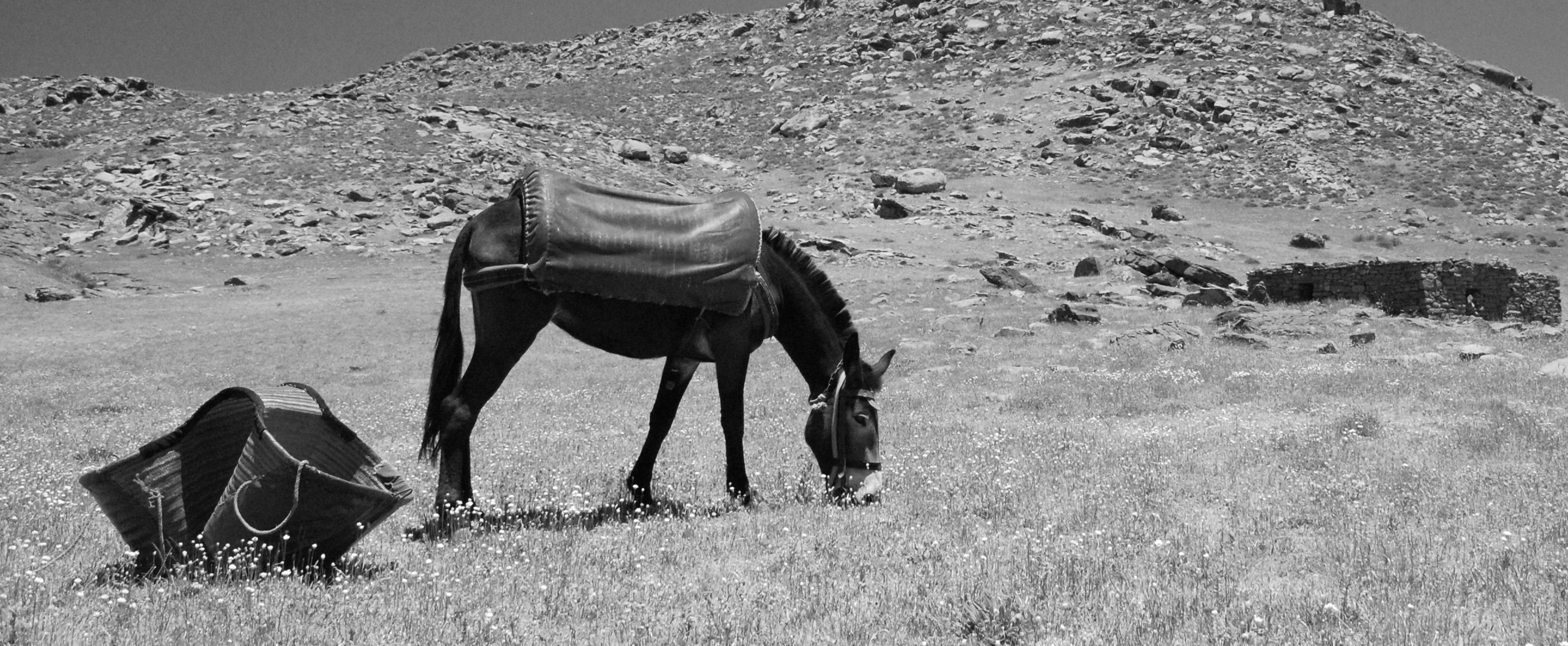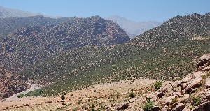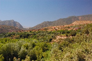 Pour la dernière journée de marche, nous quittons le camp après avoir chargé les mules vers 9h30. Le trajet est en descente pendant environ 4 heures. La première moitié est fort agréable, nous traversons des douars et suivons une piste à flanc de montagne d'où nous avons une vue spectaculaire sur les environs. Nous prenons une pause vers 11h30, pour manger dattes, figues et oranges.