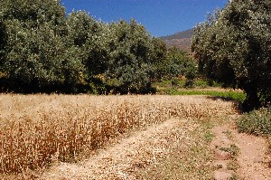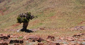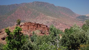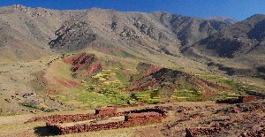 Nous quittons le riad Bledna vers 9h15 après avoir pris le petit déjeuner sur le patio. Le proprio vient nous reconduire à Tighdouine où nous arrivons vers 10h10. Nous faisons la connaissance de notre guide et de nos muletiers et attendons le départ à la terrasse d'un café en buvant un thé, pendant qu'ils s'affairent aux achats (légumes, fruits, pain, menthe, etc.) Les mulets sont ensuite chargés et vers 11h00 nous partons. Il fait un soleil de plomb mais, au début, à travers les terrasses, nous sommes un peu abrités. Nous faisons plusieurs arrêts alors que le guide nous expliquent différentes choses au sujet de l'agriculture et de la vie paysanne (vervaine, blé traditionnel). Nous passons dans un village de potiers, Talataste, puis nous montons sur la crête d'une colline jusqu'à un plateau où nous prenons une courte pause pour manger figues, dattes et arachides. Nous repartons et grimpons de plus belle jusqu'à 13h45 heure où nous lunchons sous un arbre pour reposer un peu nos têtes qui commencent à cuire au soleil. Nous mangeons bien: maquereau, salade, olives, pain, fromage et thé bien sûr. Nous tâchons de sommeiller un peu.