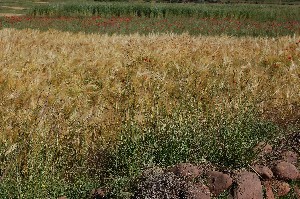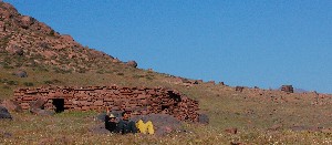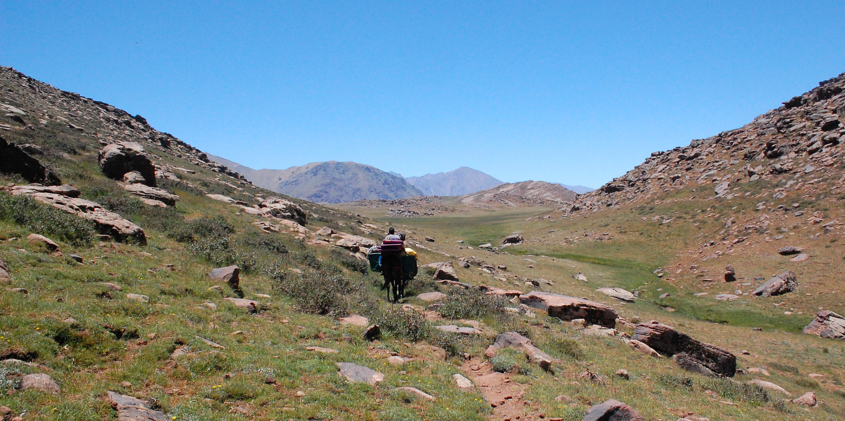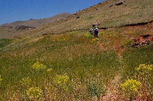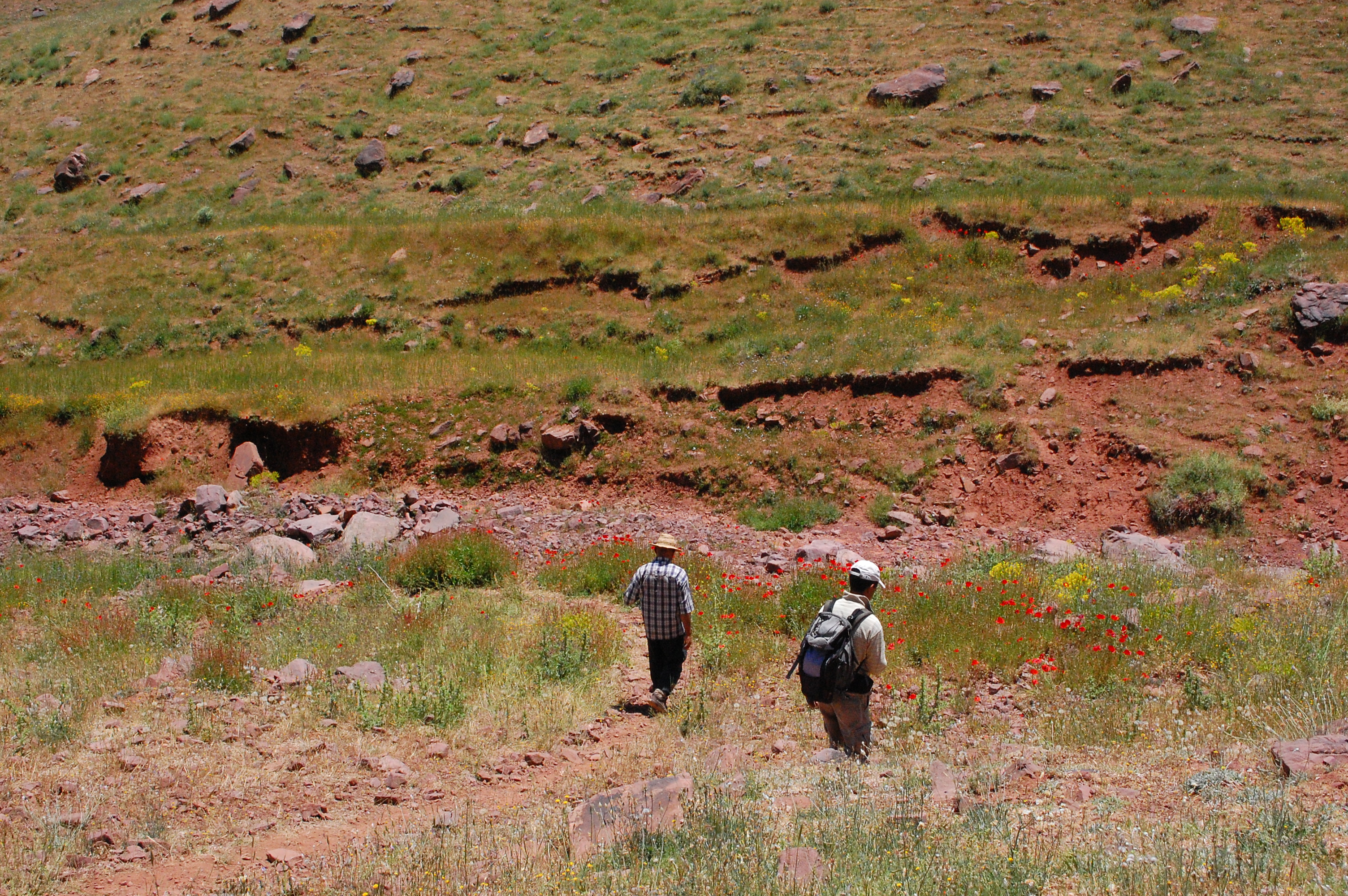 Nous redescendons du plateau vers une vallée où des gens labourent et travaillent sur les nombreuses terrasses de maïs, d'avoine, d'ail et autres plantations vivrières. Une culture de l'iris s'est aussi développée pour la vente à des intermédiaires qui l'utilisent ensuite à l'étranger dans l'industrie cosmétique. Le sentier longe ces terrasses et l'ensemble est fort champêtre car des fleurs sauvages mettent partout des taches de couleur. Après une dernière remontée à travers des bergeries, nous atteignons une prairie où nous montons le camp pour une dernière fois, entourés de montagnes, les tentes fouettées par le vent. Après le lunch, nous faisons la sieste pendant que le soleil brûle l'herbe aux alentours et que des millions de sauterelles prennent la tente d'assaut. Aux alentours de 16h, un des deux muletiers reçoit un appel sur son téléphone portable: sa mère est mourante, il doit partir de toute urgence pour rejoindre son village, à 2h30 de marche rapide. Il laisse sa mule au campement car il ne sera vraisemblablement pas revenu d'ici demain matin. Vers 17h, nous partons avec le guide observer d'autres sites de gravures rupestres tout en profitant de la superbe vue qu'exalte la lumière plus douce de la fin d'après-midi. Après le souper, nous filons dans la tente en espérant une nuit un peu moins froide que la veille. Ce sera quand même froid au final, peut-être 12 degrés celcius.