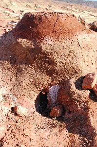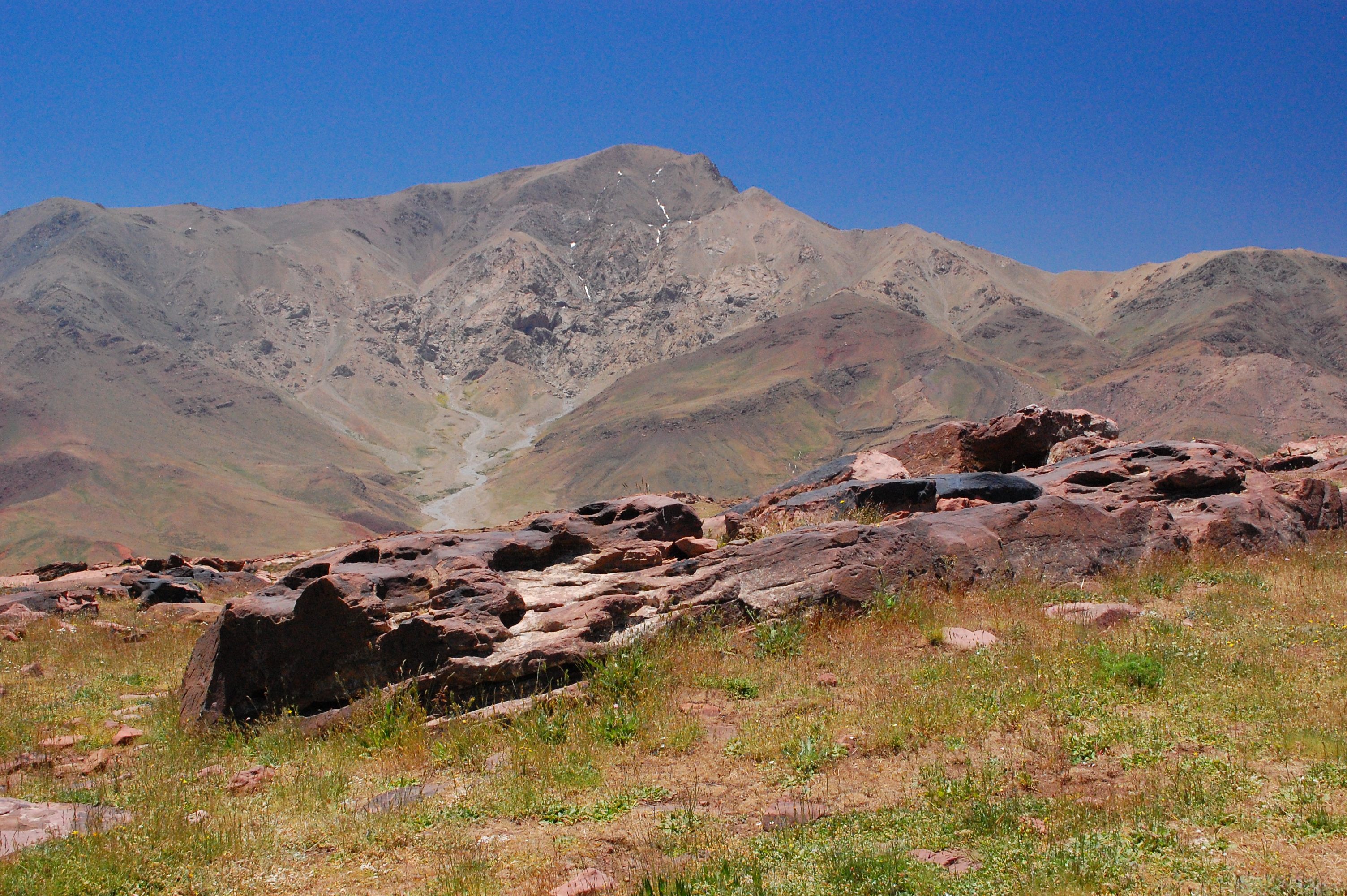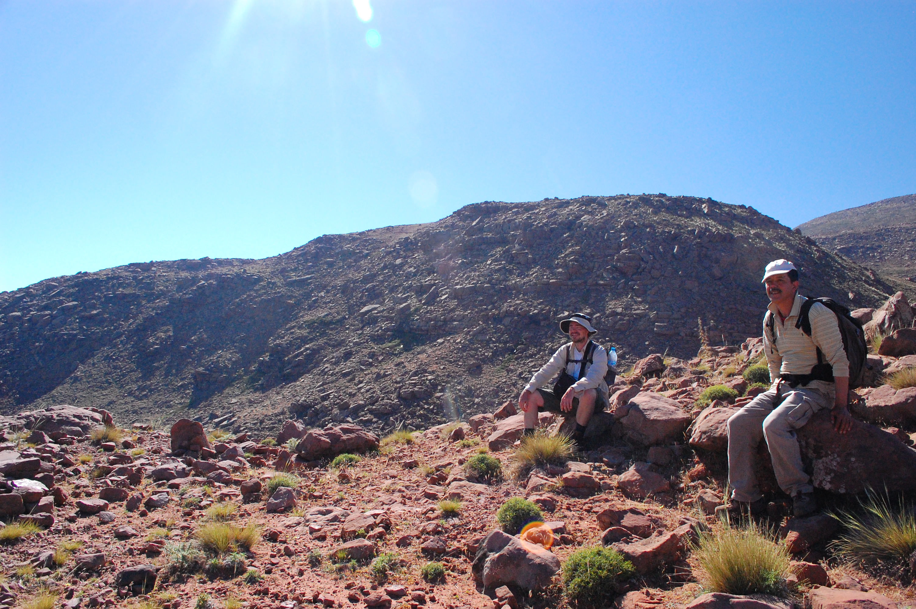Nous avons passé une assez mauvaise nuit car des chiens de berger ont aboyé presque sans relâche. Quand ils ont cessé, c'est l'appel à la prière, dans trois minarets différents et décalé de deux minutes chaque fois, qui a commencé. Nous avons quand même pris du sommeil car nous dormions déjà vers 22h00. Nous sommes sortis vers 5h00 pour "aller" au petit coin (derrière la tente!), le ciel était clair, rempli d'étoiles, et on voyait la voie lactée. Nous nous levons à 7h00, heure dont nous avons convenu hier avec nos guides afin de partir tôt et ainsi éviter de marcher au gros soleil de l'après-midi. Le temps de déjeuner, ramasser les choses, et préparer le repas du midi, nous ne partons qu'à 8h30, inquiets d'avoir aussi chaud et de souffrir autant qu'hier. Après avoir fait quelques pas, nous nous arrêtons déjà dans le village même, pour regarder des hommes préparer un méchoui traditionnel: 6 chèvres sont transpercées d'une perche en bois et attachées avec de la corde et elles seront cuites, debout, toutes à la fois, dans un four de terre traditionnel que l'on aperçoit en contrebas et que notre guide nous emmène voir de plus près. Les trippes des chèvres seront jetées aux chiens. Les peaux traînent sur une clôture et nous ne savons pas à quoi elles serviront. Nous passons nettoyer de la vaisselle à un gîte construit et géré par l'Association des amis du Zat. Notre guide nous explique que trois gites ont été construits par cette Association qui a vu le jour en 1996. Malheureusement, elle ne fonctionne plus pour le moment, ce qui est bien dommage car plusieurs agences étrangères passaient par cette association pour planifier des trek dans la région. Avec la crise économique en Europe, les voyageurs se sont faits plus rare, et notre guide a dû trouver du travail ailleurs pour l'instant. Les gîtes sont de belles installations: bâtis en pierres, avec douches, toilettes, cuisine et dortoirs, nous en avons même vu un avec un très beau balcon panoramique; notre guide nous explique que des pourparlers sont en cours avec certains organisateurs de tours de la région, afin de pouvoir utiliser les gîtes, ce qui vraiment serait une excellente idée, histoire que cet effort ne soit pas gaspillé. De plus, cela permettrait d'ouvrir la porte à un type de clientèle qui ne désire pas nécessairement camper "à la dure"! Il est finalement passé 9h00 lorsque nous partons enfin. Nous grimpons sans relâche pendant 2h30 avec quelques courts arrêts pour admirer des gravures rupestres. Nous prenons une plus longue pause juste avant le sommet de la crête que nous gravissons, au-delà de laquelle nous redescendrons vers un petit plateau qui sera le site de notre bivouac et d'où on a une superbe vue sur le Meltsen et ses 3595 mètres.