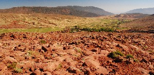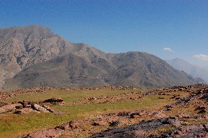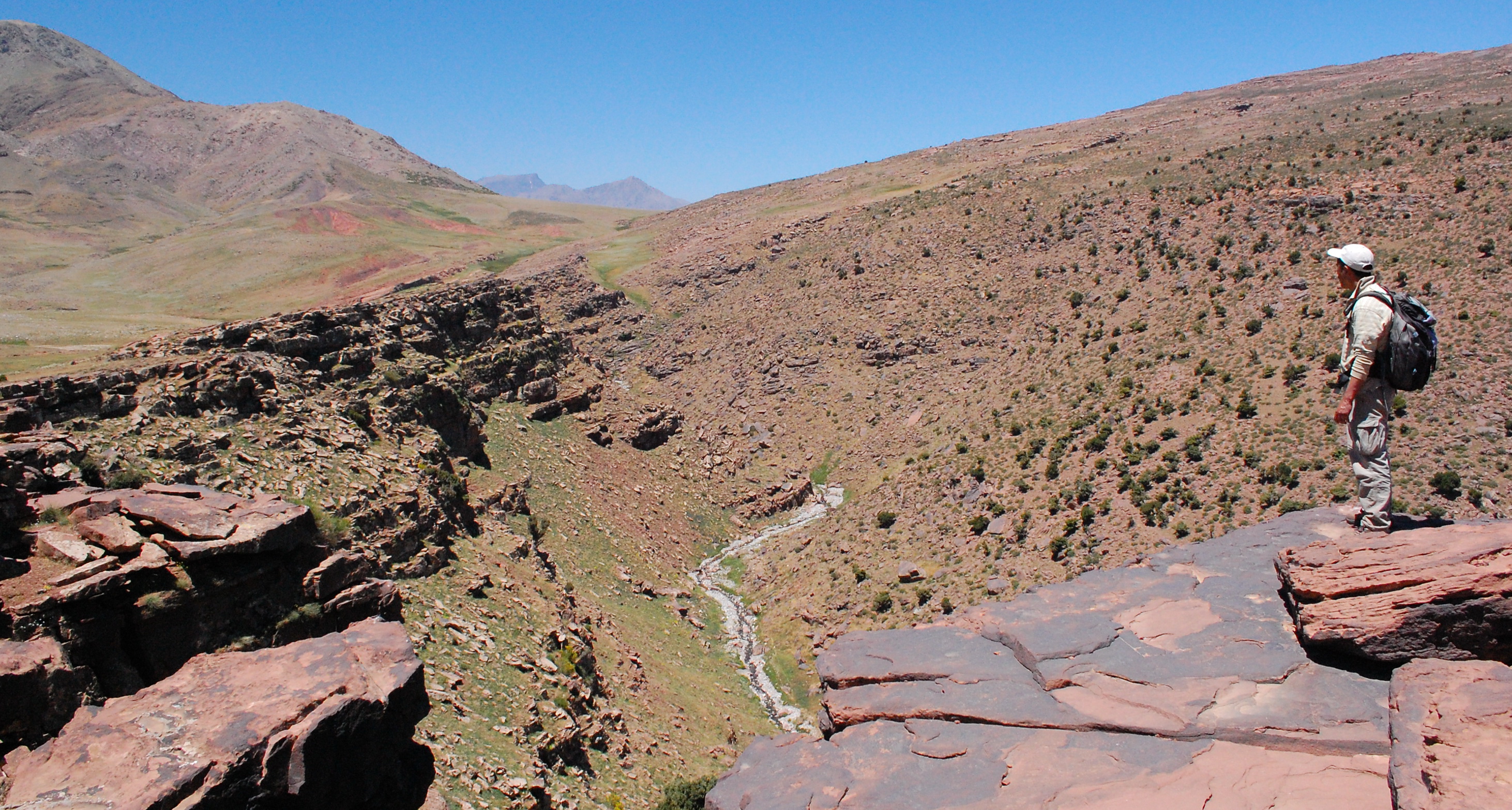 Levés à 8h00, nous quittons le site vers 10h00 après nous être rendus au bord d'un lac tout à côté où des milliers de grenouilles font un vacarme presqu'angoissant! Il semble qu'il y aurait un projet pour faire un barrage au bout du lac et creuser la cuvette après que le lac se soit asséché de manière à ce qu'il se remplisse ensuite avec l'eau s'écoulant des ravins aux alentours et qu'il puisse être ensemencé avec de la truite. Gros projets pour un lac de cette taille! Nous descendons ensuite dans la vallée vers la base du Meltsen puis nous marchons dans le col en longeant un ruisseau qui coule de la montagne. Après une petite pause d'une trentaine de minutes, pour laisser passer un groupe qui arrive de la vallée de l'Ourika (les seuls autres randonneurs que nous verrons pendant le trek), nous remontons sur un autre plateau pour faire le tour du canyon, afin de poursuivre notre route.