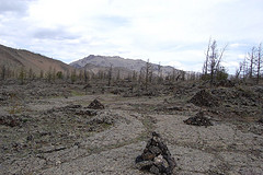 Nous nous réveillons à 8h00, il fait une chaleur suffoquante dans la tente. Nous déjeunons en short, puis levons le camp. Nous partons voir les champs de lave et grimper au sommet du volcan éteint d'où nous avons une belle vue sur les alentours: le lac, les champs de lave, le paysage désolé entourant le volcan. Des arbres ont poussé à travers la lave séchée. Nous partons ensuite dans une famille mongole qui a des chevaux que nous sommes sensés monter cette après-midi.