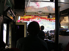 Sur le siège devant moi, une femme a ouvert sa fenêtre et sort sa tête dehors .... je fais pareil et je regarde la ville où vivent les gens, la vie hors de Thamel. Il y a des tas d'ordures partout où des chiens errants et des poules se promènent en picossant ce qu'ils peuvent. Il y a tellement de gens dehors, et aussi tellement de voitures, de bus, de camions, de motos! C'est l'heure de pointe à Katmandou et ça n'a rien à voir avec le pont Champlain. Nous sommes complètement bloqués, le chauffeur arrête le moteur, un bus scolaire attend à côté de nous, les enfants en uniformes me regarde d'un air curieux par les fenêtres sales. Des gens nous offrent des choses par la fenêtre, la femme devant moi achète une montre après avoir eu le temps de la négocier pendant 10 minutes. Ainsi arrêtés, nous n'avons d'autre choix que de fermer les fenêtres car l'odeur de diesel ambiante est insoutenable et nous voyons dans les rayons de soleil chatoyer une quantité incroyable de poussière qui s'engouffre dans le bus.