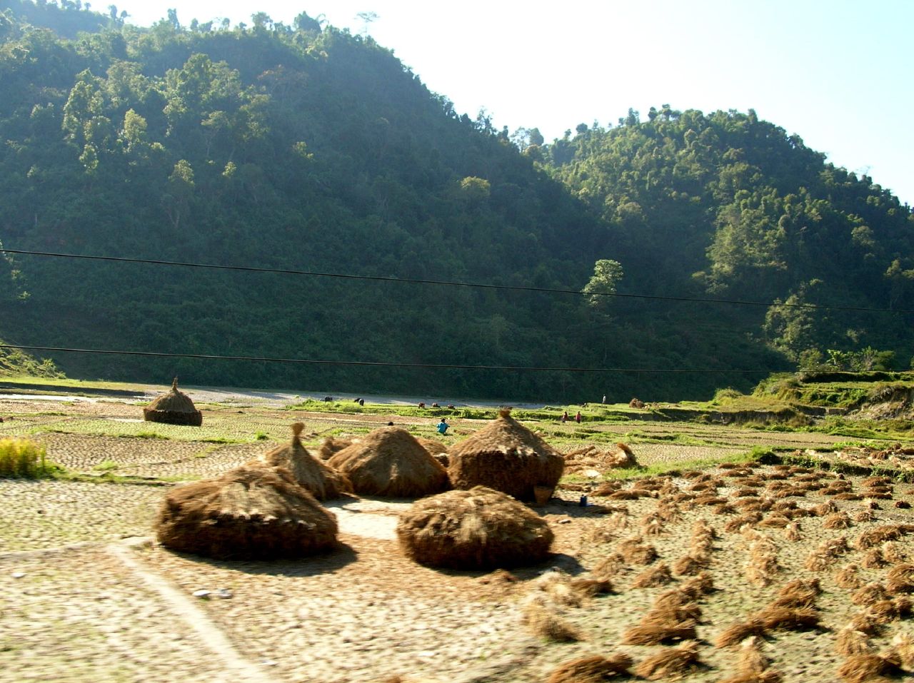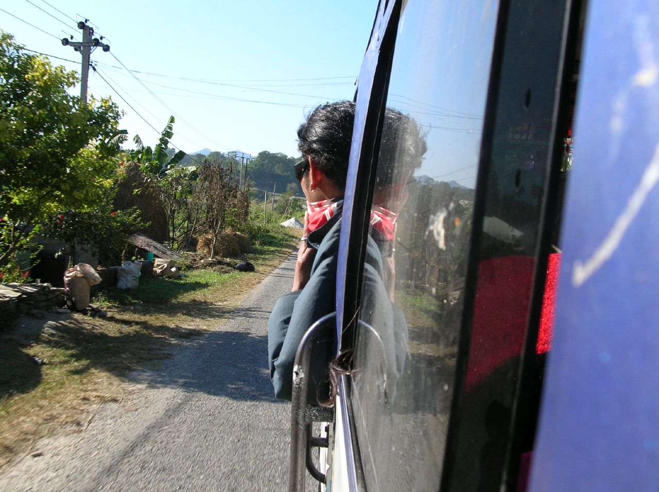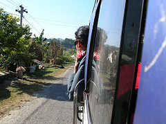 La route est longue, mais c'est captivant. Je regarde sans cesse dehors, la tête sortie. je m'enhardis et je sors mon appareil photo. Le chauffeur met de la musique indienne. On est content d'être là. Nous évitons de justesse 5 ou 6 face-à- face, nous en évitons de moins juste au moins une centaine. Nous croisons des camions qui viennent de l'Inde, surchargés, avec des jeunes hommes assis sur des poches de grains sur le toit. On roule à une vitesse folle mais la route n'est pas mal.