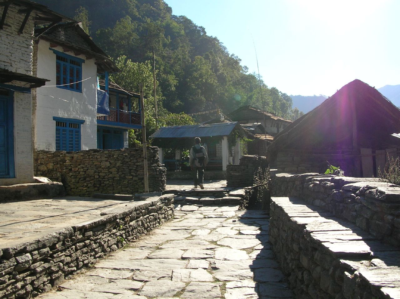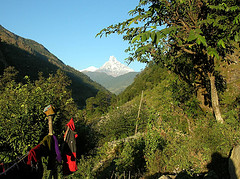 Nous enfilons nos sacs, direction Birethanti. Ça fait du bien de se délier les jambes après 8h de bus. Petite demi-heure d'un pas léger, nous longeons une rivière couleur émeraude, avec en toile de fond le Macchu pucchare. On est ravi. Le sentier est en fait la route caillouteuse qui traverse le village de Nayapool. Les écoliers rentrent chez eux et courent en nous dépassant. Je suis un peu gênee, meme s'il y a 2 ou 3 autres trekkeurs: c'est comme si une trail de randonnée passait devant chez moi et que j'habitais sur le trottoir... Ils vendent toutes sortes de choses, de l'équipement de trekking, de l'eau, de la bouffe... Nous arrivons à un lodge, Dhan va voir s'il y a une chambre pour nous.