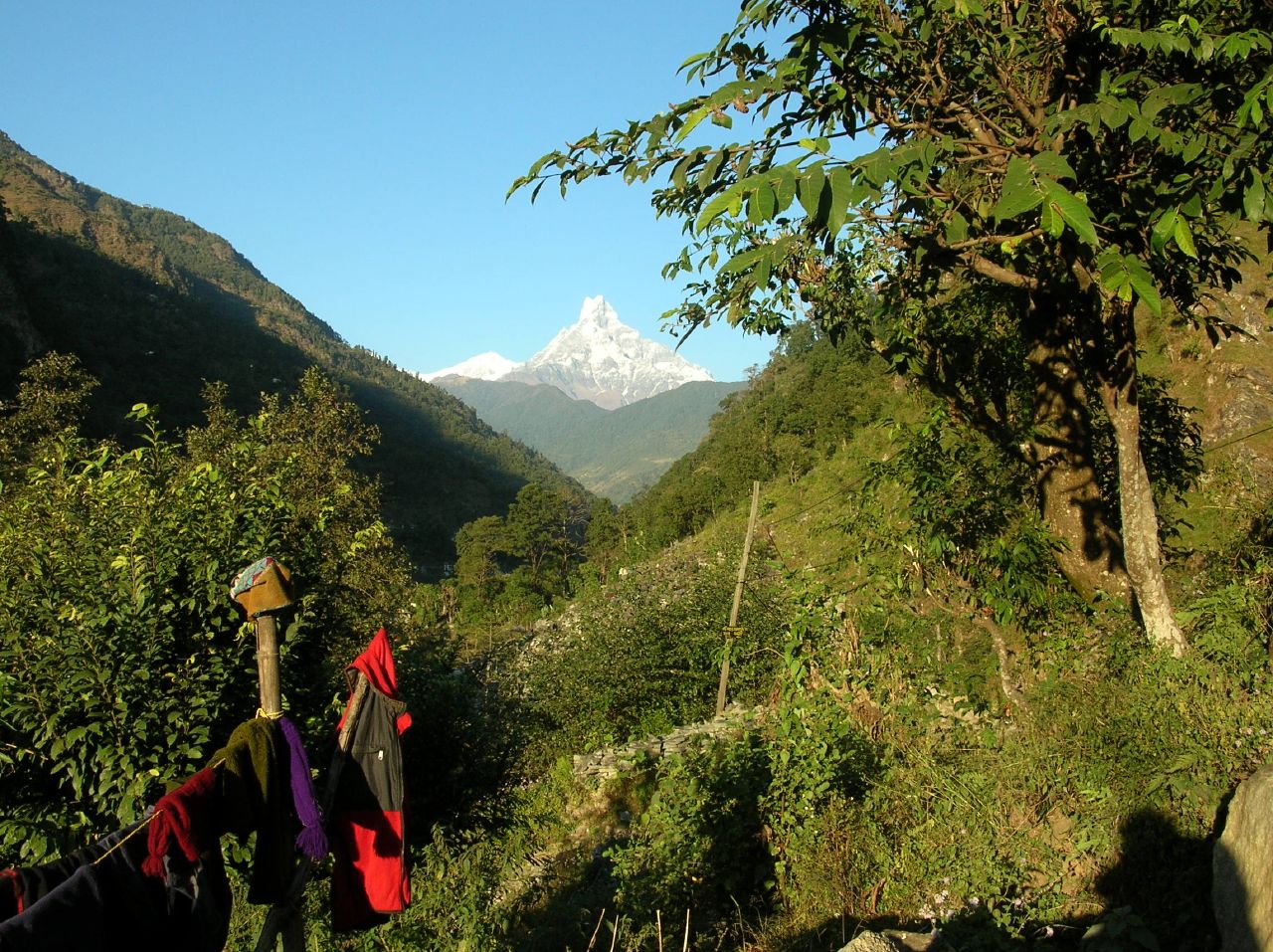 Nous montons à l'étage, où nous nous installons dans une grande chambre avec trois lits. Dhan dormira en bas, avec les autres guides et porteurs népalais. La vue est superbe sur le "fish tail" au soleil couchant et le bruit de la rivière est puissant. Nous commandons le souper: un macaroni au thon délicieux avec deux Everest ! Nous jasons avec Dhan qui nous parle de la vie difficile dans son village. Nous commandons le dejeuner pour 7h et montons nous coucher à 20h. Il ne nous faut pas 30 secondes pour nous endormir.