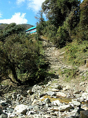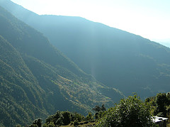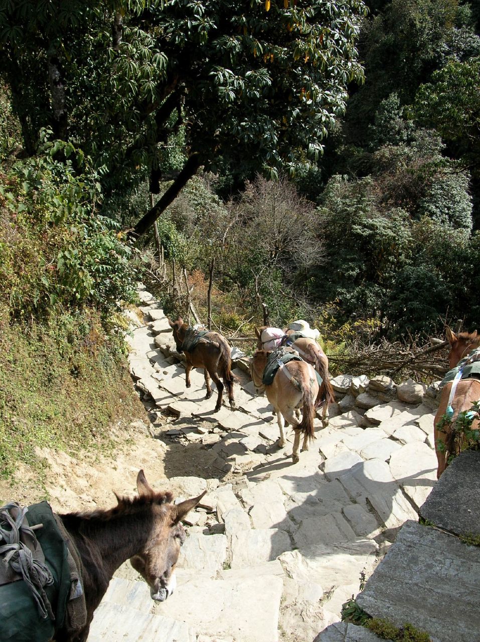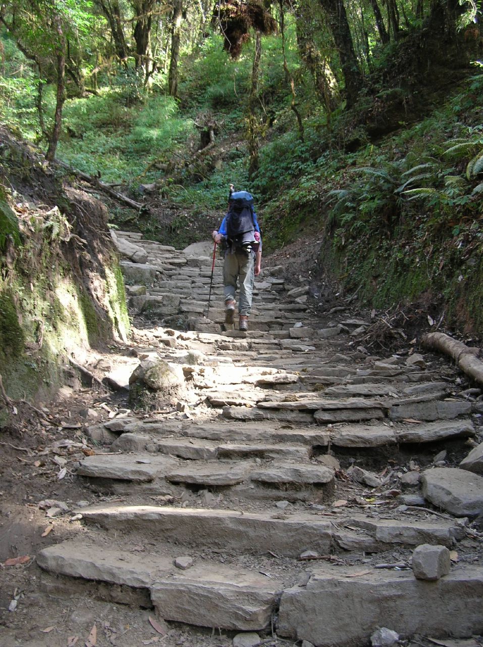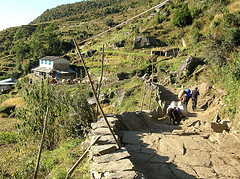 Nous partons d'Ulleri en montant encore des escaliers pour sortir du village. Après la première heure de marche, nous prenons une pause pour enlever nos vestes car on crève déjà de chaud. C'est devenu un classique: on s'habille chaudement au départ tôt le matin, puis vers 9h00, dès que le soleil a dispersé la brume, la chaleur oblige à retirer les sacs, les vestes en polar et les chandails à manches longues pour passer le reste de la journée en tshirt.