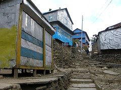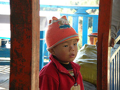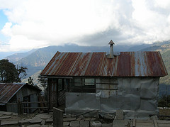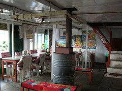 Après avoir à nouveau tâté de la douche, qui n'est pas mal (petit tapis pour les pieds frileux!), nous nous faisons sécher, ainsi que nos vêtements, près du poêle autour duquel nous rencontrons 4 francais fort sympathiques qui arrivent du tour des Annarpurnas (voir les photos de Robert Cognet ici). Ils ne manquent bien sûr pas de nous parler de Céline, que nous feignons de ne pas connaître (!) et ils nous trouvent très cutes avec notre "débarbouillette", mot qu'ils entendent pour la première fois. Ils nous racontent leur voyage, les randos qu'ils font en France, nous parlent de Sarkozy, bref nous discutons avec eux jusqu'à 21h quand nous montons nous coucher. Nous sommes transis: il gèle à pierre-fendre.