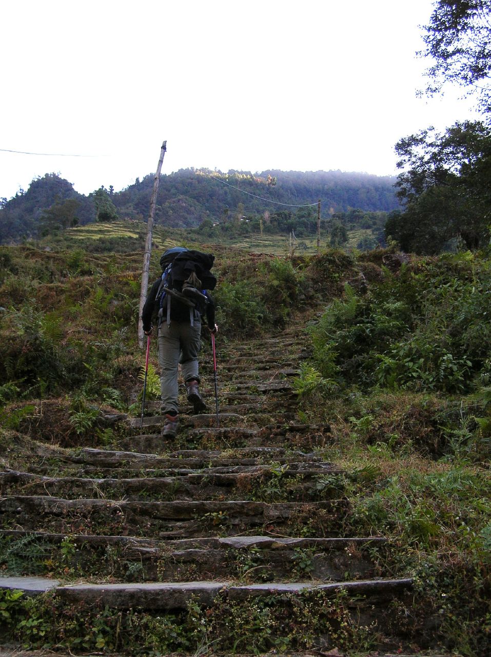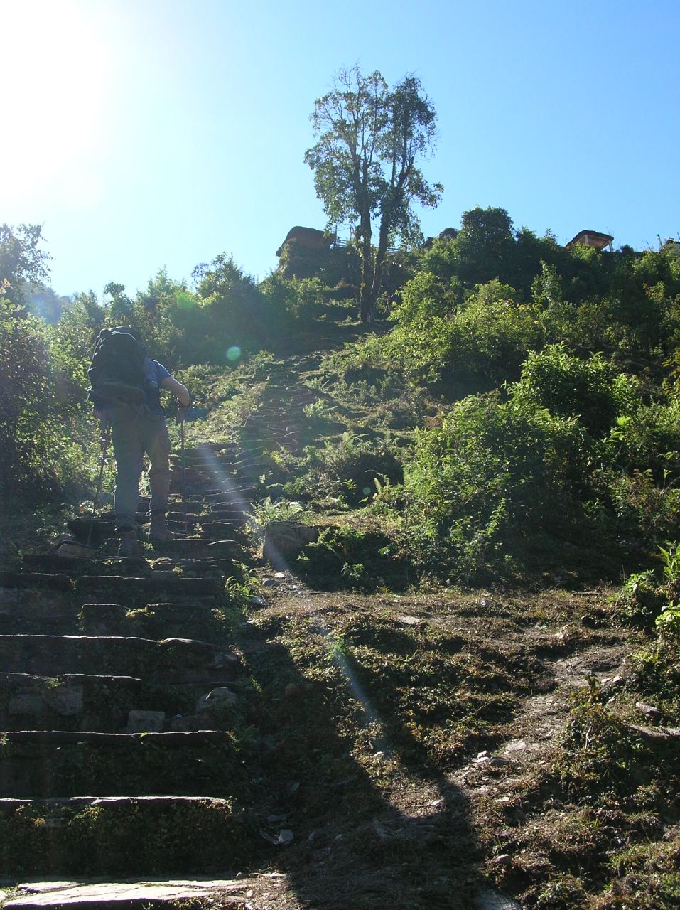 Nous arrêtons dîner à la sortie de Tolka. Martin dort un peu à l'ombre, car le soleil est encore de plomb. Dix minutes après que nous soyons repartis, il vomit en bordure du sentier les quatre bouchées de soupe qu'il avait audacieusement tentées ! Et il est chambranlant alors que nous entamons une très longue montée vers Deurali. Dhan prend son sac, fort heureusement car nous y serions encore!