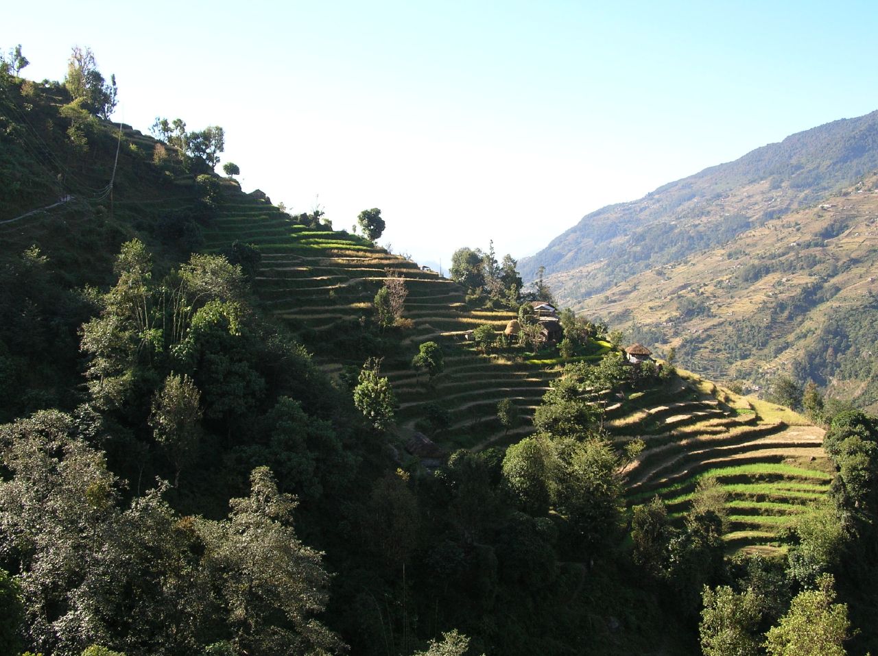Ça ne va somme toute pas mal, on avance lentement, "bistare bistare". Il ne fait pas encore soleil sur la face que nous grimpons, et la montée se passe bien. On continue jusqu'à Tolka, que nous atteignons tout en haut d'une montée assez raide après le pont suspendu.