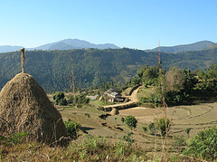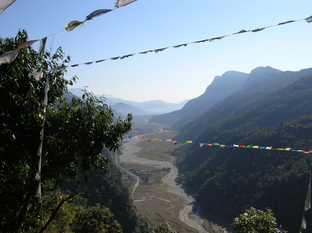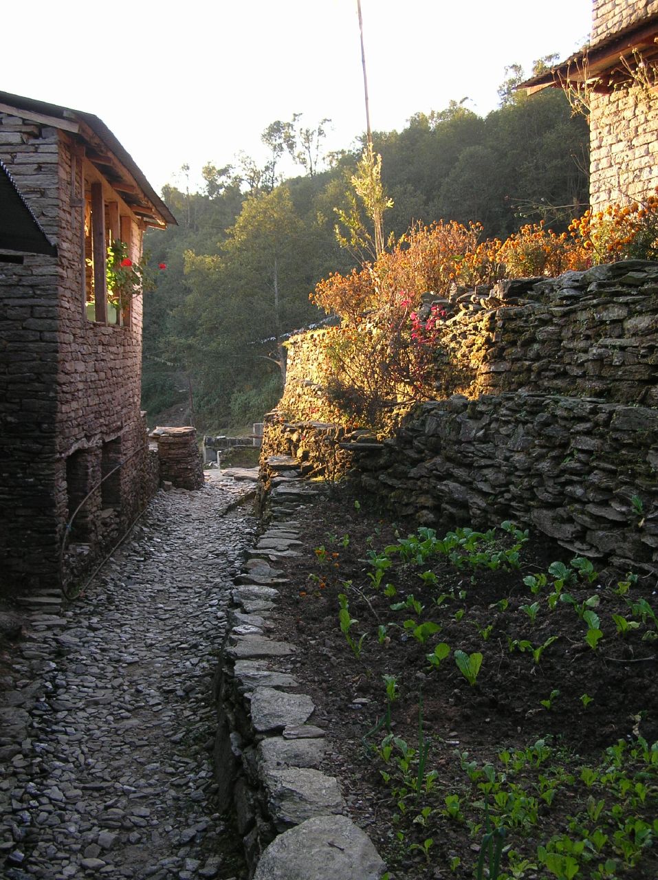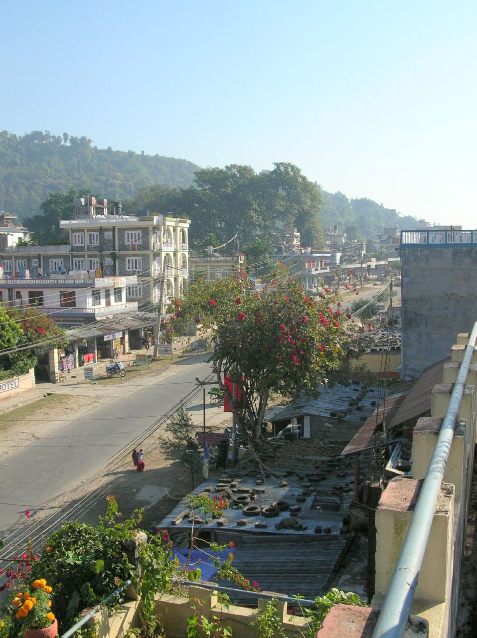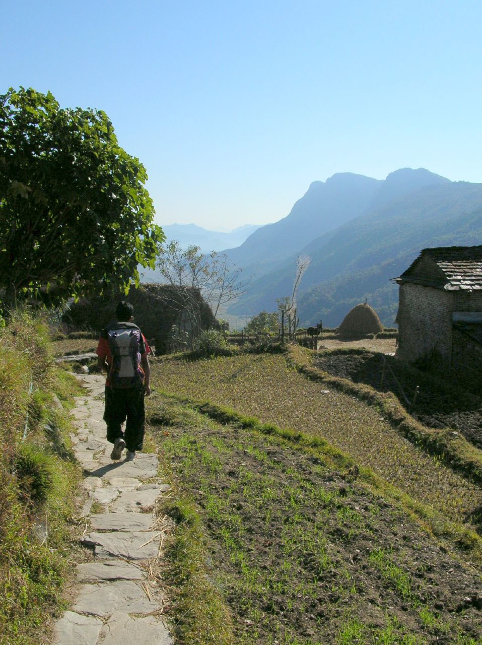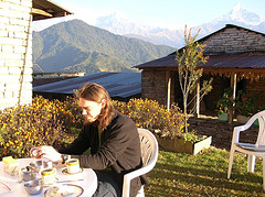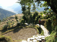 Lever à 6h15 après une bonne nuit de dix heures de sommeil ininterrompu. Nous déjeunons léger (!) et entamons à 8h20 la descente en escalier vers Phedi. Le sentier est magnifique, un trottoir en pierres qui longe les maisons et les terrasses où les gens font leur toilette matinale. La descente est dure pour les genoux déjà éprouvés et les mollets (mal étirés) sont raides. Mais comme d'habitude le décor enchanteur nous distrait de nos maux. Nous apercevons la route alors qu'il nous reste encore une trentaine de minutes de descente. Arrivé au bithume, nous relaxons 10 minutes, puis montons dans un taxi vers Pokhara. Le trajet dure une vingtaine de minutes pendant lequelles nous n'avons qu'un face à face à éviter, tranquille ...