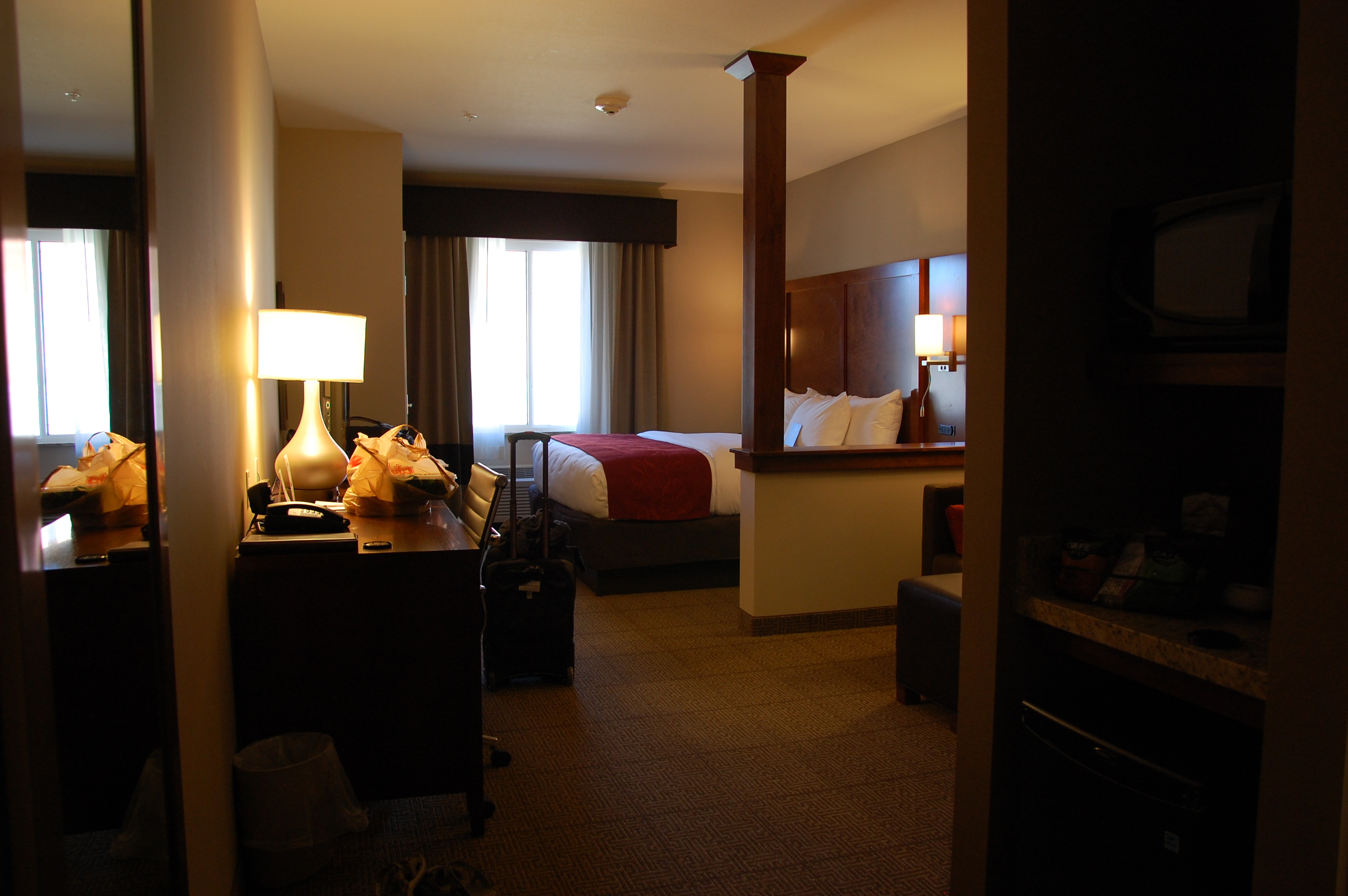 Comfort Suites à Moab. Nous avions une grande chambre avec petit "salon" séparé par un muret, un micro-onde, un frigo et l'accès wifi gratuit. Le lit et la literie étaient les plus confortables de tout le voyage. L'hôtel offre aussi un centre d'entraînement, une piscine ultra chauffée et un spa. Tout est flambant neuf. ll y avait un bizarre de bruit de vent émanant de la porte et du corridor, on nous a changé de chambre sans problème lorsque nous l'avons demandé à la réception, le problème était déjà connu et le commis croyait qu'il avait été résolu. Le déjeuner était inclus. L'emplacement est bien, sur la rue principale, à proximité de plusieurs restos et commerces.