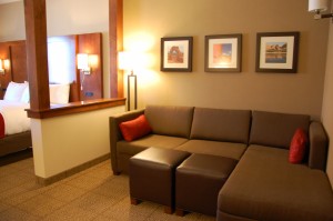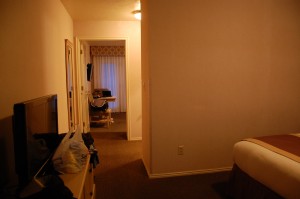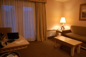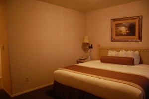 Capitol Reef Resort à l'est de Torrey. La chambre était très grande avec un petit salon séparé, deux télévision, un coin cuisinette avec une table, deux chaises, un micro-onde, un évier et un petit frigo. L'accès wifi était gratuit et fonctionnait très bien. Une porte patio offre une vue sur les montagnes et il y a un petit patio privé doté de deux chaises pour s'assoir dehors. Le restaurant était surprenant, assez bon pour ce genre d'endroit, avec un excellent service à des prix raisonnables. De toute façon, il n'y a pas vraiment d'autres endroits pour manger, l'endroit est très isolé.