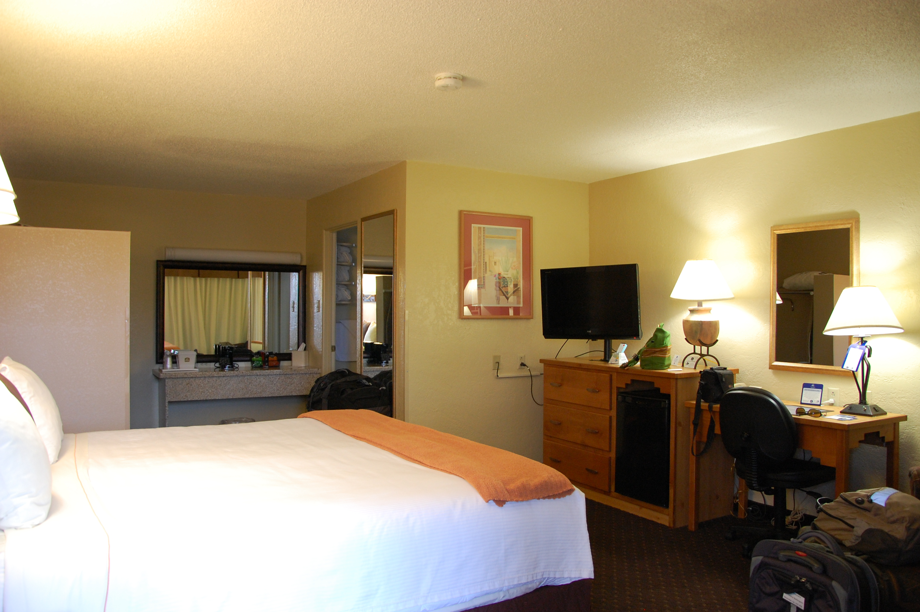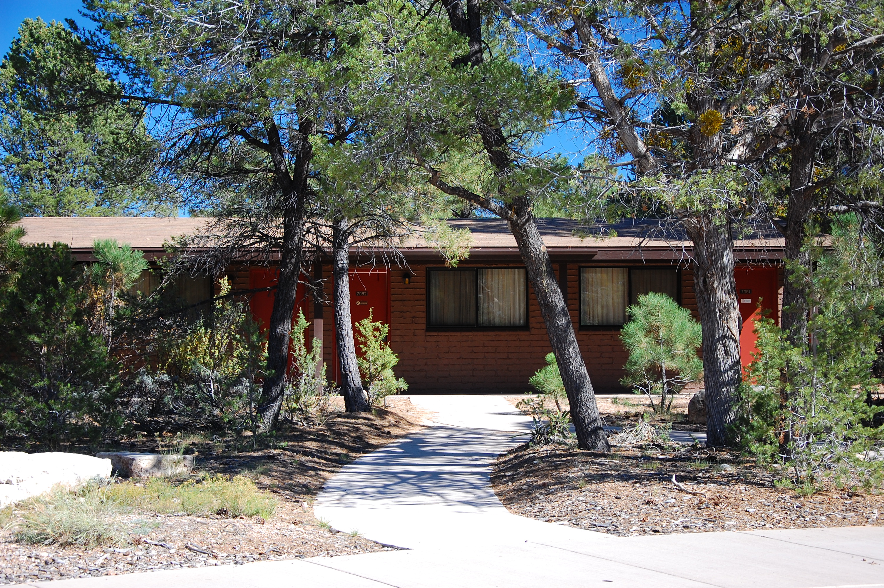 Yavapai Lodge, dans le parc du Grand Canyon. Comme les lodges du parc sont la plupart du temps tous complets une année à l'avance, nous avons été chanceux de pouvoir réserver une chambre à ce lodge qui est le plus gros du site. Nous n'avons pas eu le choix vraiment du type de chambre ni du bâtiment car il ne restait que quatre unités disponibles lorsque nous avons fait notre réservation. La chambre était simple, propre, ni belle ni laide. Nous avons eu un petit problème avec la toilette qui ne flushait pas la première journée, vite réglé mais le système est resté précaire durant tout le séjour, les installations sont un peu vétustes. Il y a un petit frigo mais pas de micro-onde. Il n'y a pas non plus de wifi dans la chambre, seulement dans le lobby qui est à cinq minutes de marche environ (pour nous car notre unité était proche, d'autres sont plus loin). Le lodge a un look "motel", on aime bien car on se gare devant la porte de notre chambre. L'arrêt du shuttle est à cinq minutes à pied, juste devant le lobby et le "market plaza" où il y a une épicerie avec quelques denrées qui peuvent dépanner et un "déli" qui offre pizza, sandwiches, chilis et soupes. Il y a une télévision mais la réception est très mauvaise pour la dizaine de postes offerts. De toute façon, il y a autre chose à faire. Avec le shuttle, il est inutile de prendre la voiture, on peut aller partout dans le parc. Les autres lodges, tous complets un an d'avance, sont situés près du rim, tandis que Yavapai est dans la "forêt" mais c'est à une dizaine de minutes du rim en shuttle et c'est très tranquille contrairement aux autres qui sont dans le "village". La cafétéria est à côté du lobby, c'est assez cher mais assez acceptable comme nourriture, offrant une bonne variété.