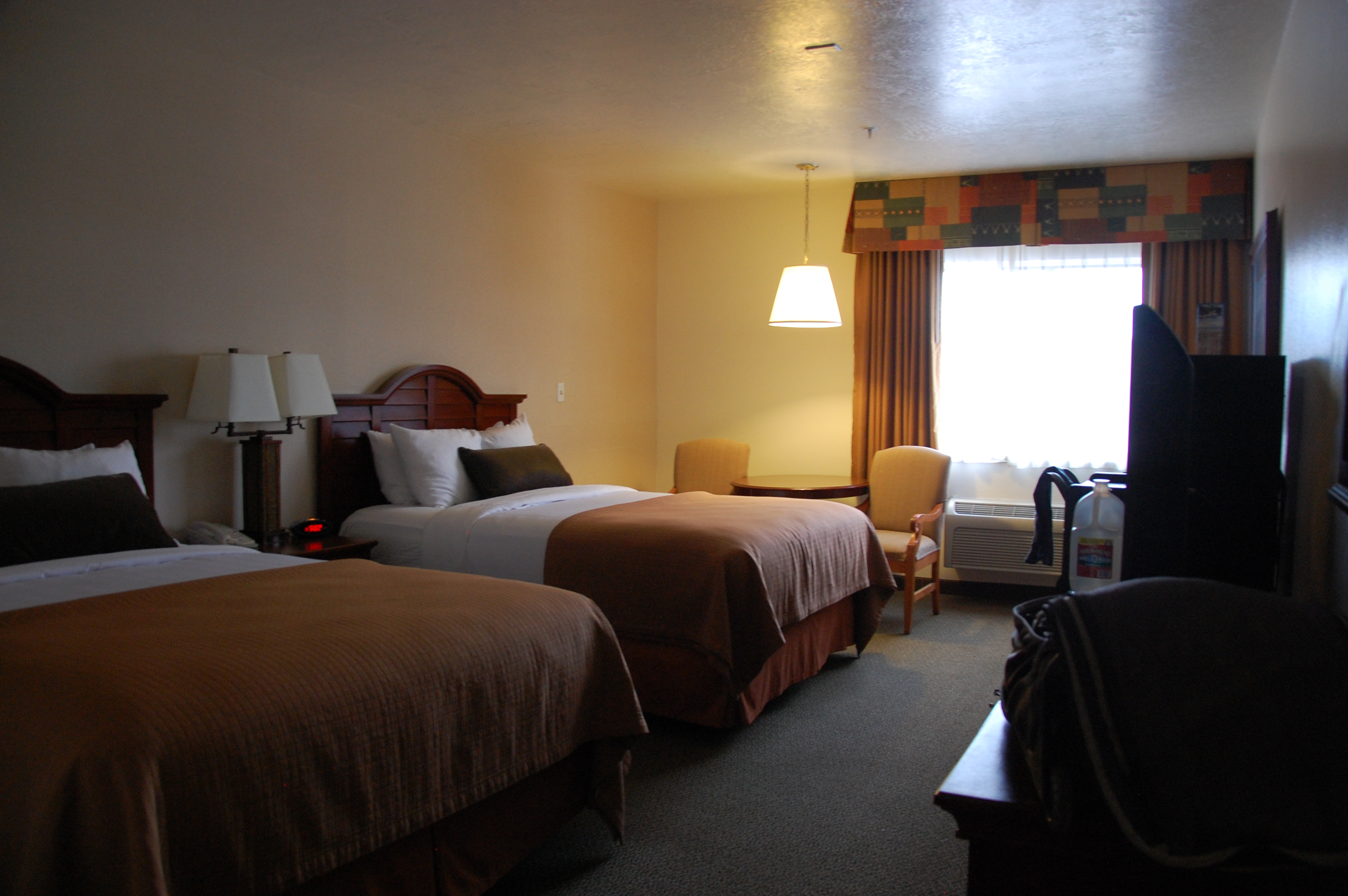 Ruby's Inn Best Western, à l'entrée de Bryce Canyon. Nous avions une chambre dans l'immeuble principal, il y a aussi plusieurs petits bâtiments de look "motels" sur le même terrain. Notre chambre était très grande, avec deux lits queen, un micro-onde, un frigo, accès wifi fonctionnant très bien et une salle de bain avec baignoire à remous. Sur place il y a aussi une piscine intérieure avec spa, un magasin général avec des souvenirs et des provisions, un restaurant avec un menu quand même assez limité (et pas donné) et des services d'organisation d'excursions. Le principal intérêt de cet hôtel est sa proximité du parc, environ trois minutes de voiture! La chambre était propre et fonctionnelle, pas laide mais légèrement datée.