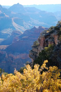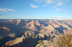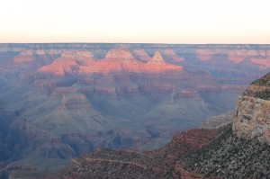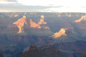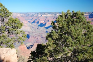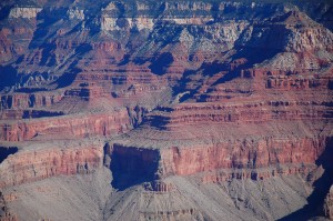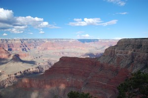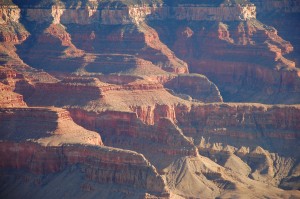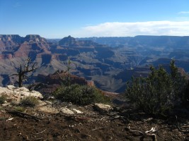Re-navette ce matin à 8h avec le shuttle bleu mais cette fois-ci dans l'autre direction, vers le "visitor center" où nous prenons ensuite la navette de la ligne orange pour nous rendre à Yaki point. Au lever du soleil ce doit être encore plus beau, à 8h30 c'est encore très acceptable! La lumière est douce et le site est presque désert. Nous reprenons la ligne orange jusqu'à Pipe spring et de là, nous reviendrons jusqu'au village par la "rim trail", en passant par Mather point, Yavapai point, le musée géologique et la "historic times trail", pour un total d'environ 8km. Le sentier est la plupart du temps asphalté et plat, la balade est très agréable. Le soleil tape déjà fort en matinée mais nous l'avons dans le dos et il y a un petit vent qui nous rafraîchit un peu. Plus nous nous rapprochons du village et plus les points de vue sont fréquentés, particulièrement Mather point et Yavapai point; le musée est intéressant et permet de visualiser certain points d'intérêt en les identifiant à l'aide d'une maquette sous les fenêtres.