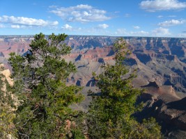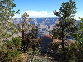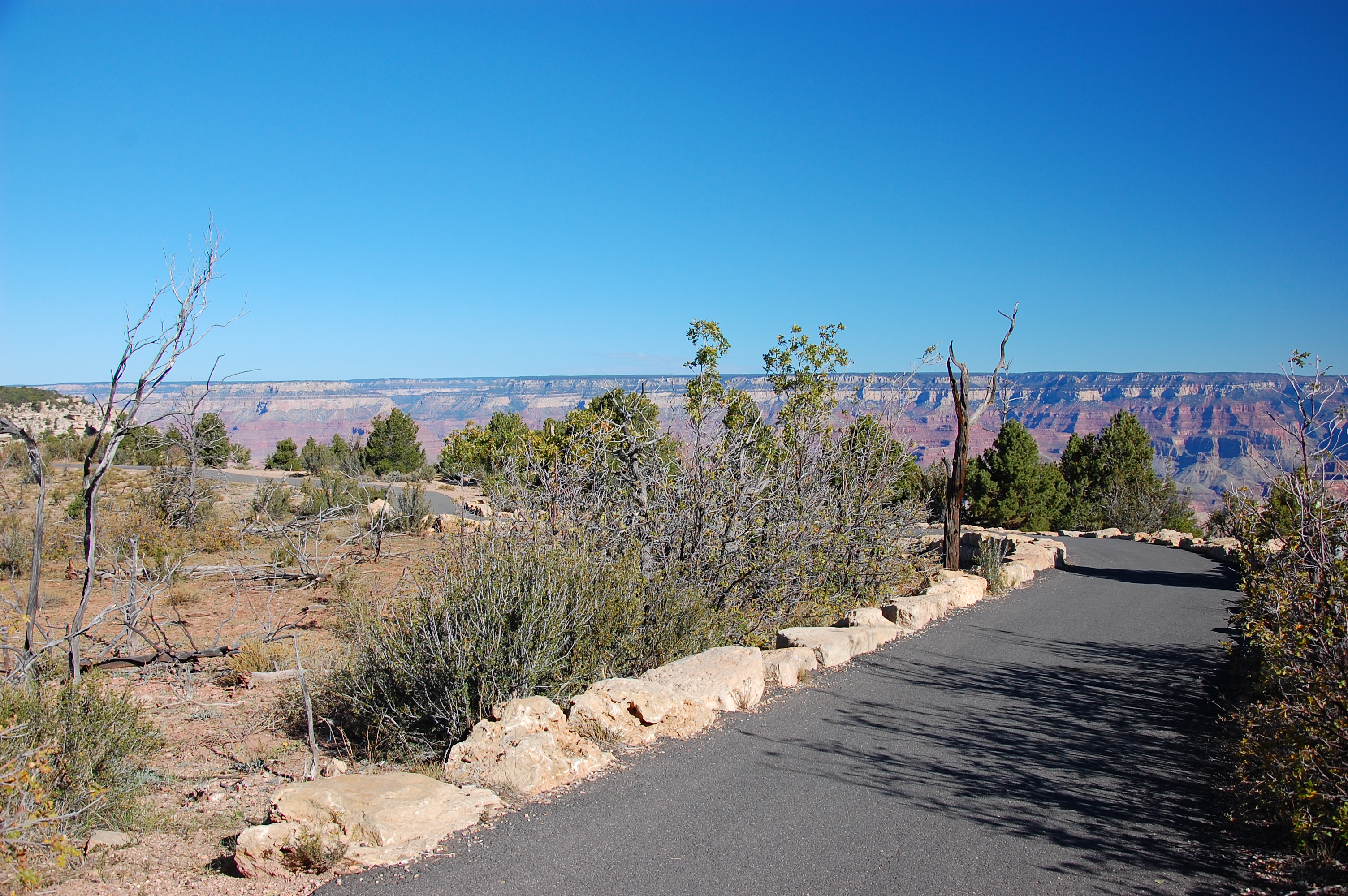De retour à notre lodge, nous décidons de dîner à la cafétéria Yavapai. Ce n'est pas donné mais le repas du jour, soupe, poisson, thé, nous sustente bien. Nous montons ensuite dans la navette de la ligne bleue juste devant notre lodge pour nous rendre jusqu'au bout du circuit et transférer alors sur la ligne rouge qui nous mène jusqu'à Hermits Rest, dernier arrêt de la ligne. Nous revenons ensuite à la marche, par la "rim trail" ce qui fait 12km pour regagner le village. C'est un très beau sentier, asphalté pour la majeure partie, sur lequel nous ne croisons que 3 ou 4 personnes pendant les 3 heures que nous prendrons à le parcourir. Il n'y a de monde qu'aux points de vue, où il y a des arrêts de la navette; les gens descendent, prennent quelques photos et montent dans la navette suivante pour continuer leur parcours. Entre les points de vue, il n'y a quasiment pas un chat et comme la vue est la plupart du temps dégagée, cela permet de voir le canyon plus longtemps et plus tranquillement. Nous apprécions vraiment chaque instant de cette randonnée très facile.