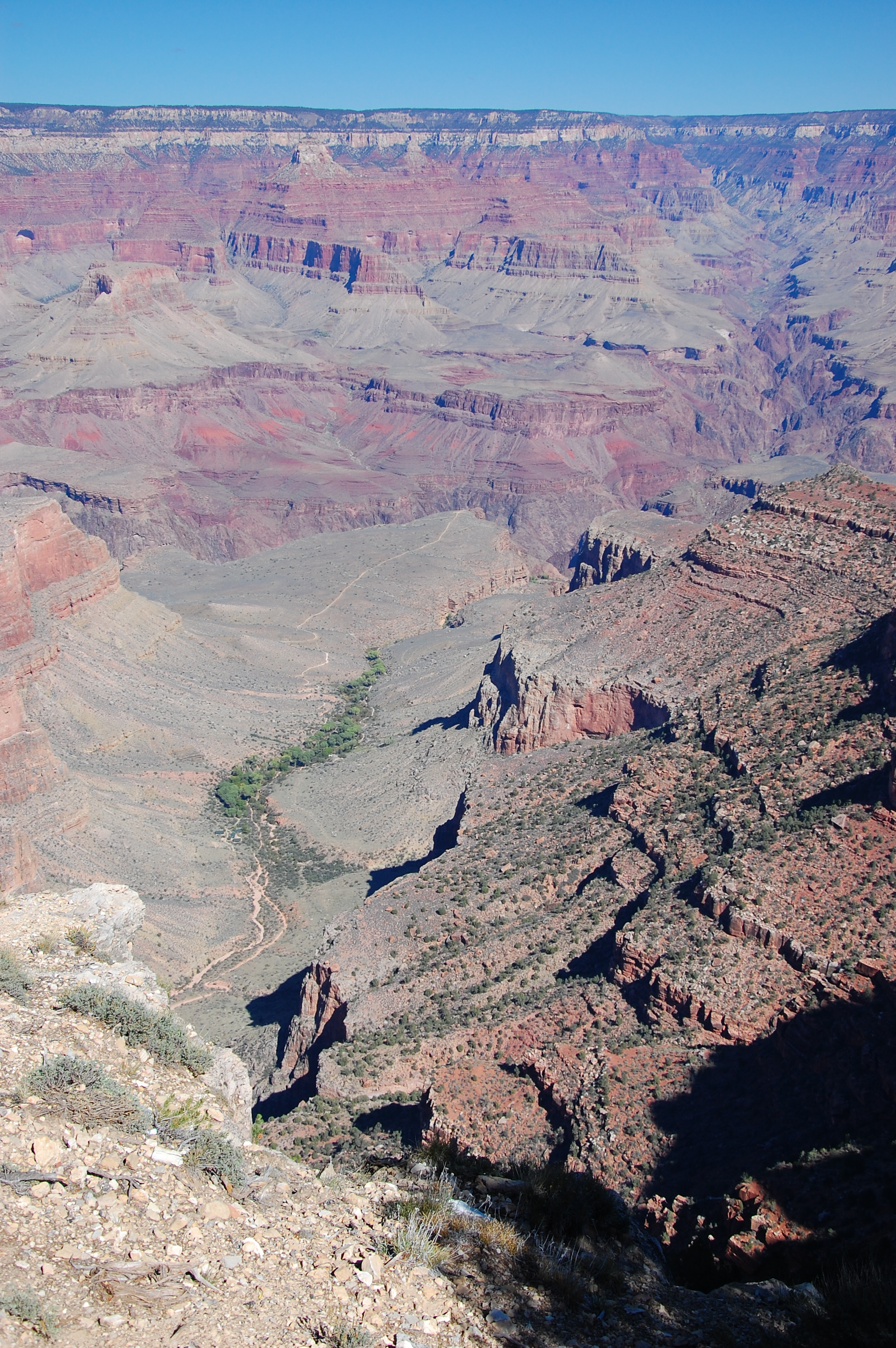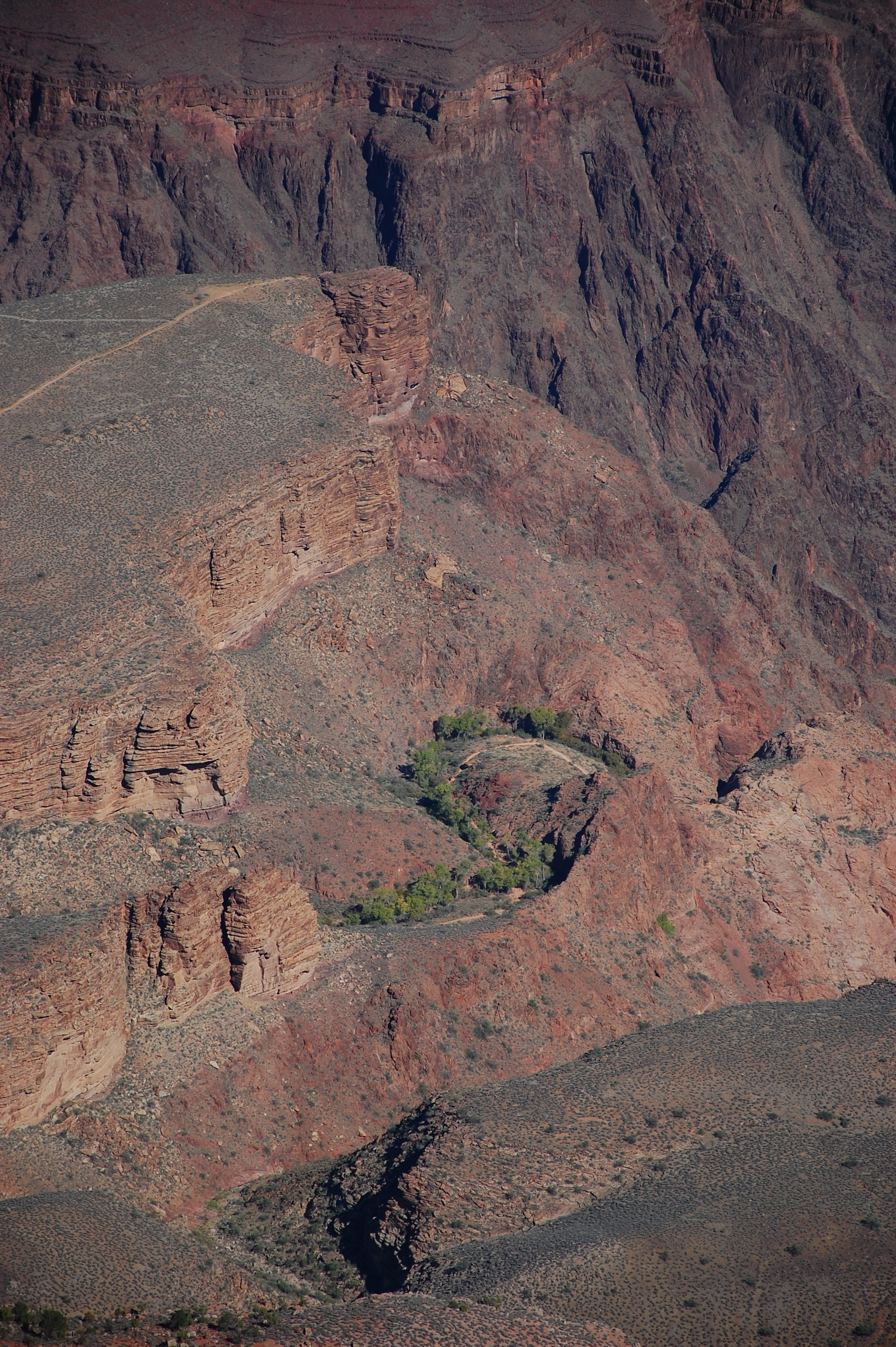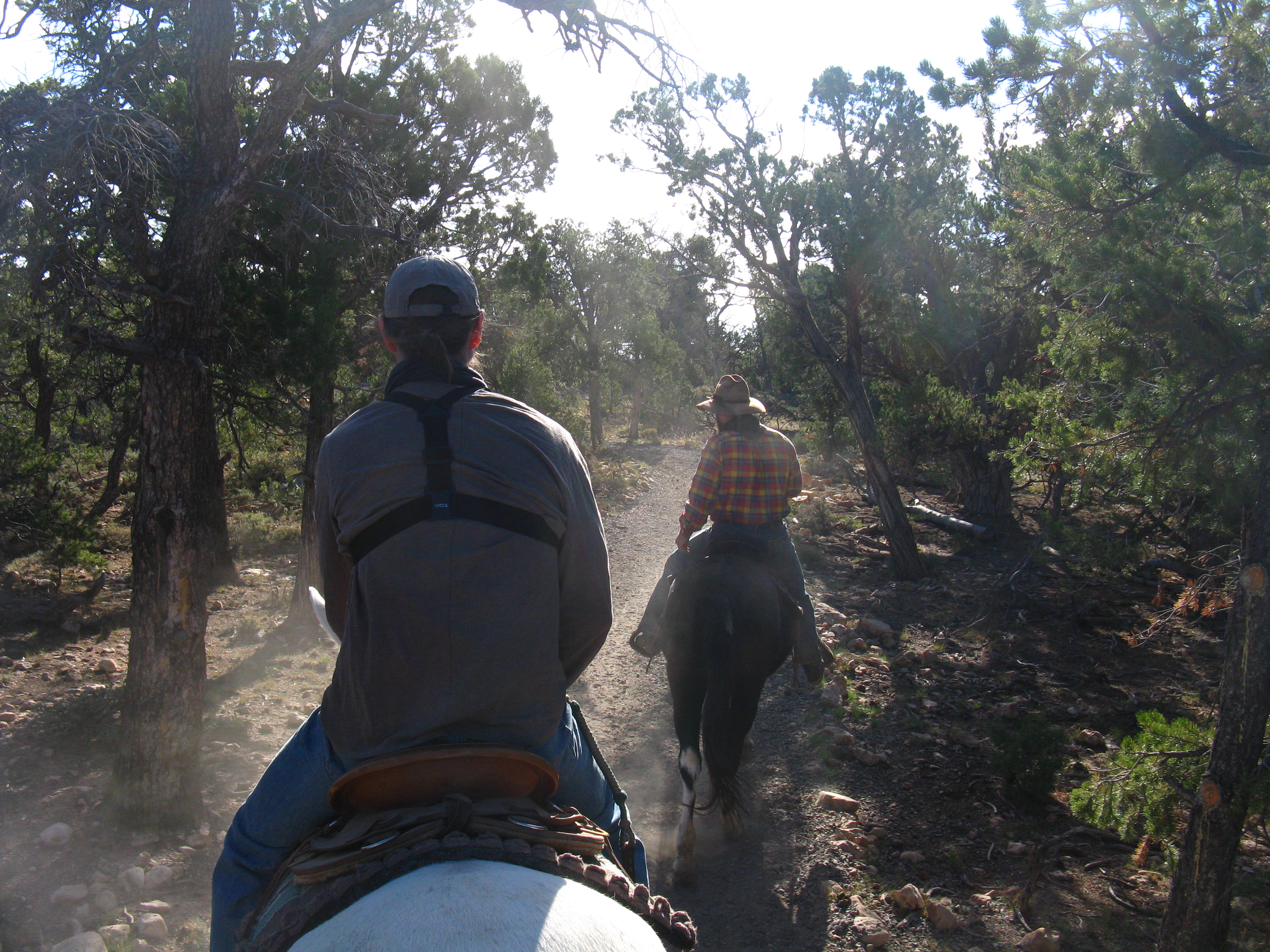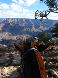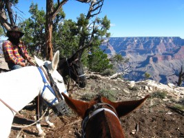 Levés à 6h15, nous passons vingt minutes à taponner sur la toilette qui refoule, avant d'appeler le front desk quand il finit par y avoir de l'eau partout dans la salle de bain. Ils envoient quelqu'un sur le champ, ils n'ont pas l'air surpris. Entretemps nous partons pour l'écurie (mule barn); l'autobus nous y attend et à 8h nous démarrons pour un trajet d'une quinzaine de minutes vers une autre écurie sur Desert View road. Pendant le trajet, le chauffeur super sympathique nous explique plein de choses intéressantes au sujet du parc, entre autres qu'ils sont 1500 personnes à travailler et vivre carrément dans le parc! Les enfants des employés fréquentent même l'école dans le parc. Arrivés à l'écurie, nous rencontrons notre guide, Luke, très enthousiaste muletier du Michigan. Après les recommandations d'usage, nous nous prétendons les plus novices du groupe et de cette façon sommes placés immédiatement après le guide dans la queue leu leu ce qui nous permettra d'échanger avec lui et d'entendre toutes ses explications intéressantes non seulement au sujet de ce que nous voyons, de l'exploitation minière du canyon au développement du tourisme, mais aussi à propos des animaux avec lesquels nous partageons quelques heures.