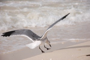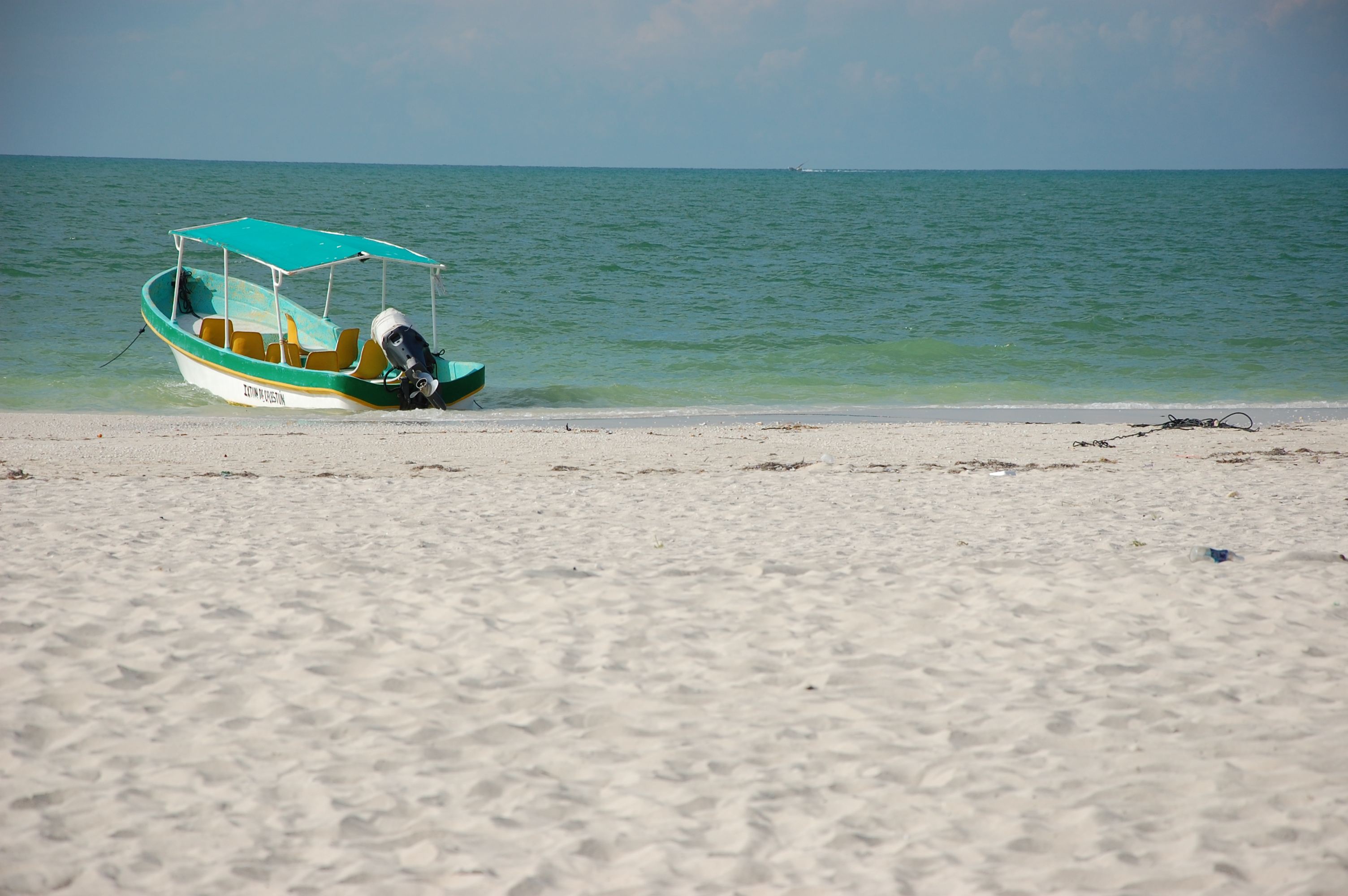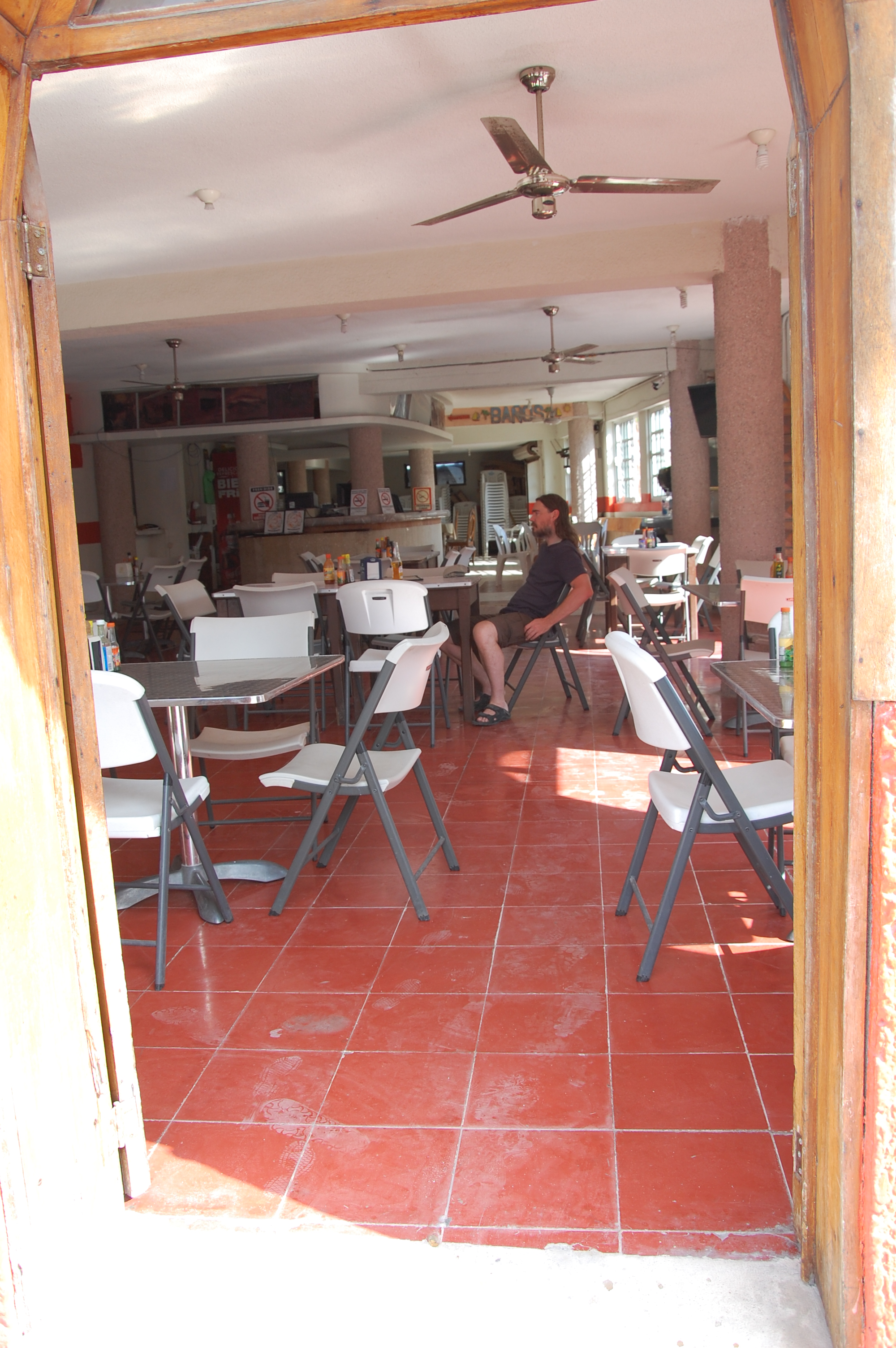 Nous prenons la journée pour relaxer aujourd'hui. Nous avions prévu faire une sortie en bateau dans la réserve pour voir les flamants mais comme nous en avons vu beaucoup à Rio Lagartos, que ces sorties ne sont pas données, que les inondations ont entraîné de la boue et toutes sortes de déchets dans la lagune et qu'il vente à écorner les boeufs en plus de tomber quelques averses violentes, nous restons au lit et sommeillons jusqu'à tard, bercés par le son des palmiers qui battent dans le vent, des rouleaux qui s'écrasent sur la plage et de la pluie qui tombe sur la terrasse. En fin d'avant-midi, la pluie a cessé, le vent est toujours là et les nuages aussi, ce qui nous ravit car cela nous permet de nous assoir dehors sans craindre de calciner. Nous passons l'après-midi à lire et à observer les nombreux oiseaux marins, et nous nous baignons même un peu car la mer est moins violente que la veille et la plage un peu plus grande.