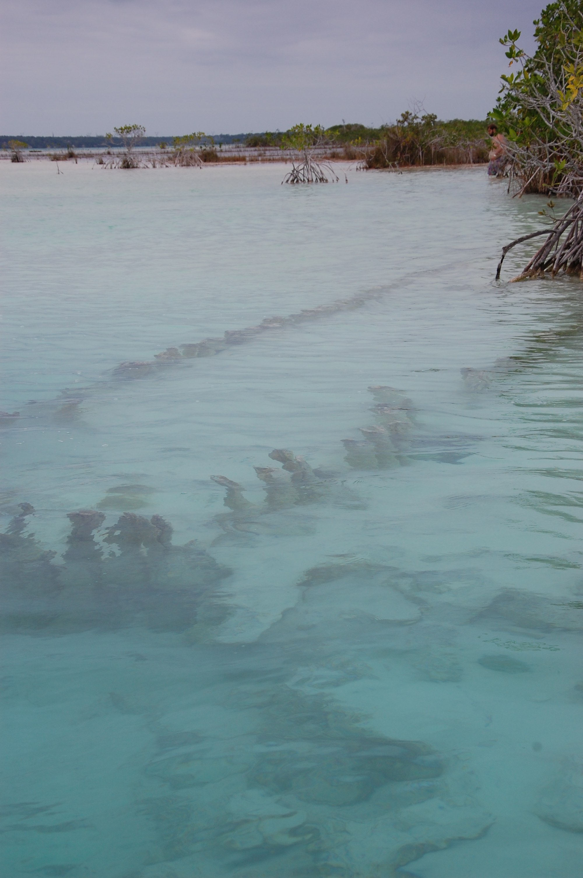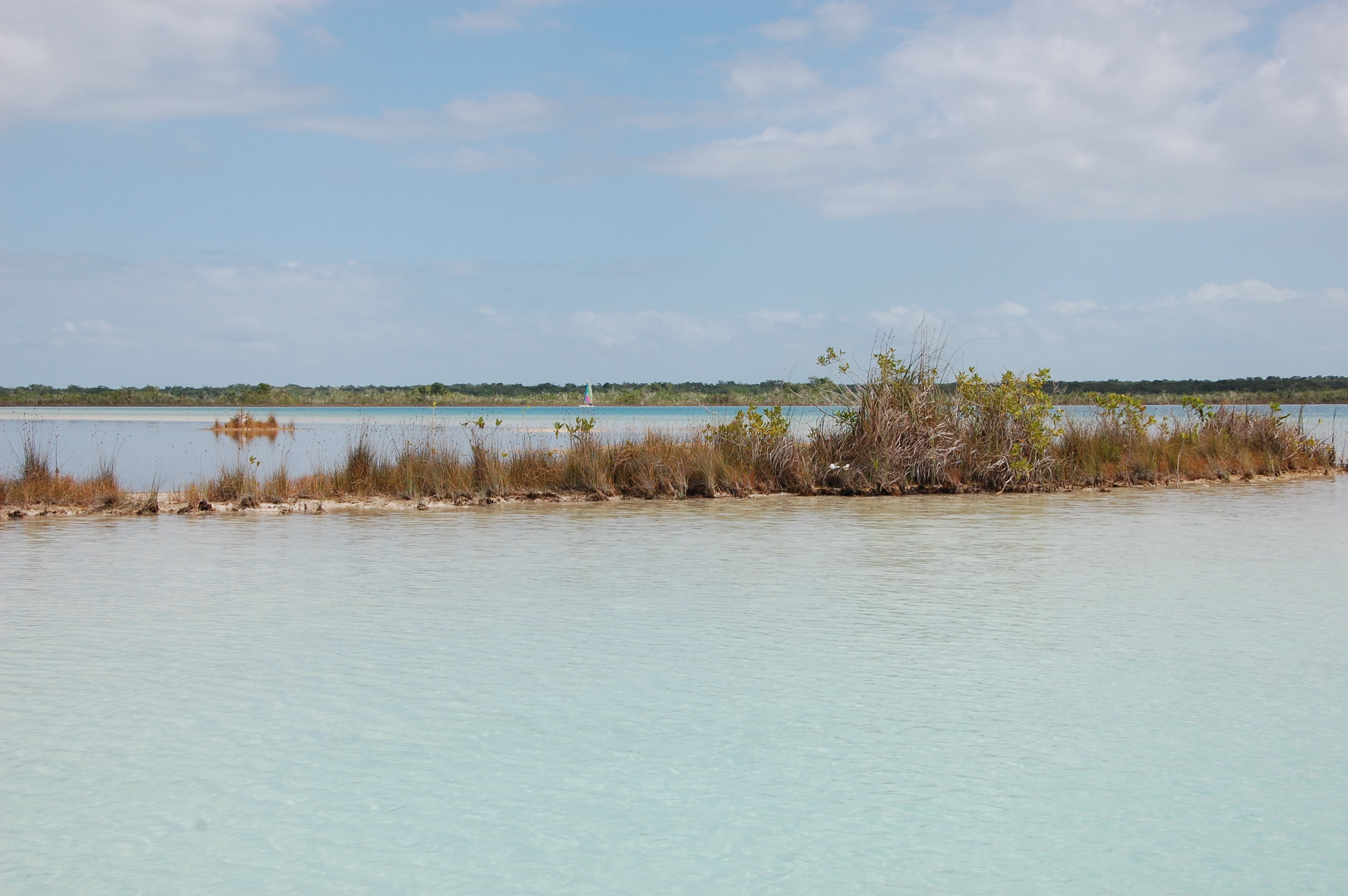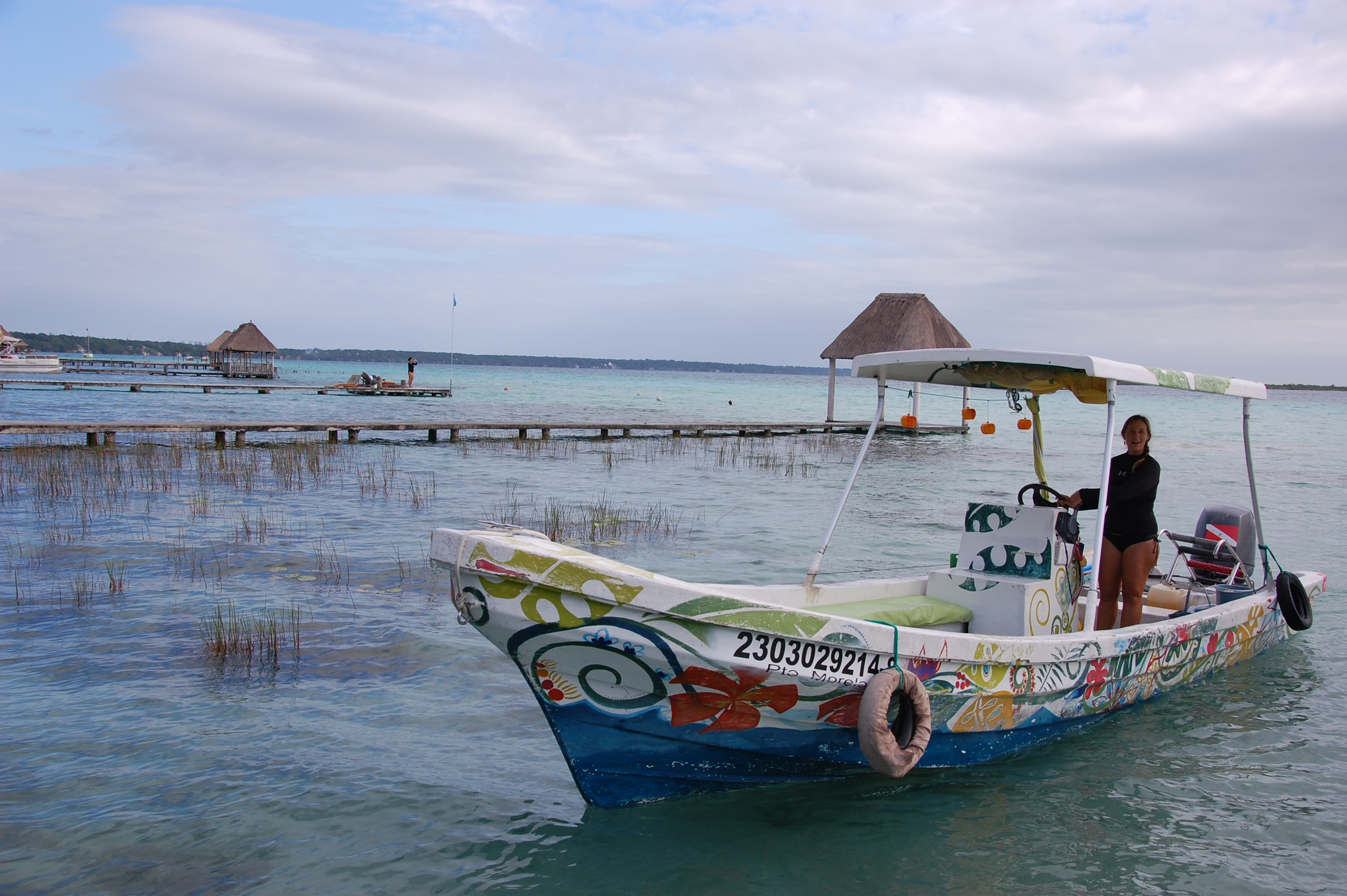 Nous déjeunons avec nos hôtes et les trois Américains sur la terrasse au soleil et partons tous les cinq pour une balade en bateau avec Kristel au départ du muelle ecologico de Bacalar. Le temps est assez couvert ce qui fait assez notre affaire car nous avons peur de cuire en combo bateau/baignade pendant trois heures. Nous rencontrons les autres passagers, un couple d'Allemands de Munich et un couple de Belges qui ont été pris pour des Québécois, les pauvres, à cause de leur accent. Nous embarquons et partons sur la lagune. Kristel nous donne une foule d'informations très intéressantes au sujet de la lagune. Celle-ci est alimentée par cinq cenotes qui sont connectés entre eux par des rivières souterraines, ainsi que par des sources tout autour. Les eaux de la lagune circulent à travers un réseau de canaux jusqu'au Rio Hondo puis à la Baie de Chetumal, qui étaient utilisés par les mayas comme liens commerciaux. Des joncs et des fleurs de lotus près des berges filtrent l'eau, mais sont de plus en plus arrachés par les riverains quand ils se construisent sur les berges car ils veulent accéder plus facilement à l'eau. La mangrove qui peuple une partie de la lagune est protégée de par sa nature car il n'est pas interdit de s'y construire mais les complications que cela implique découragent les gens, fort heureusement. La lagune abrite aussi des stomalites, ces structures à la fois biogéniques et sédimentaires, qu'on ne retrouve plus qu'à quelques endroits seulement sur la terre. Des projets sont en court, auxquels participe Kristel, pour obtenir une reconnaissance de patrimoine mondial de l'Unesco afin d'assurer la préservation de l'environnement de la lagune, car le développement très rapide de l'endroit ces dernières années laisse présager le pire pour l'avenir si des mesures ne sont pas mises en place bientôt.