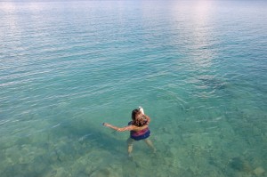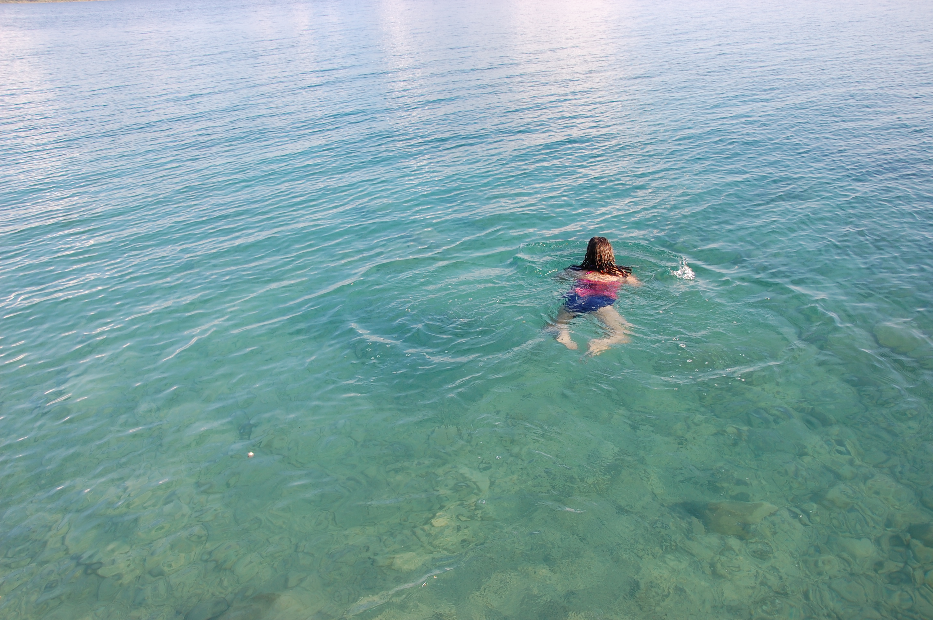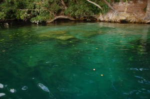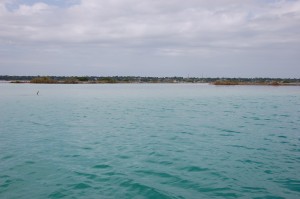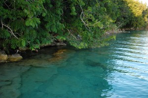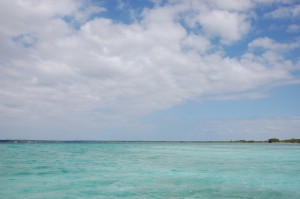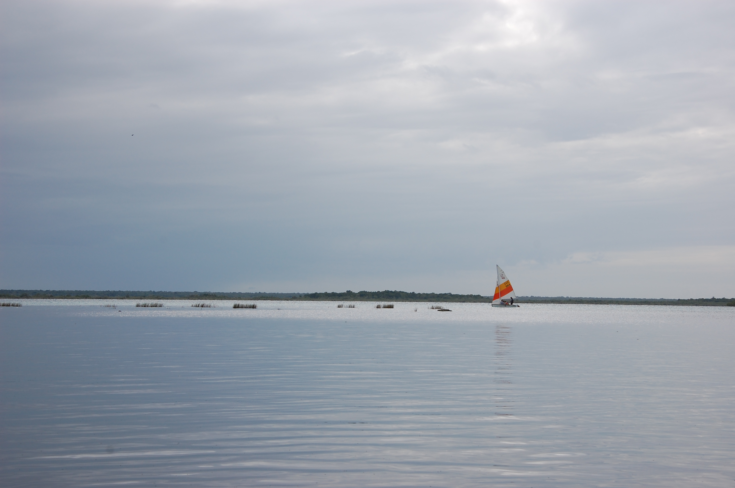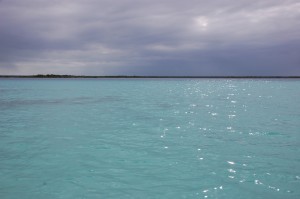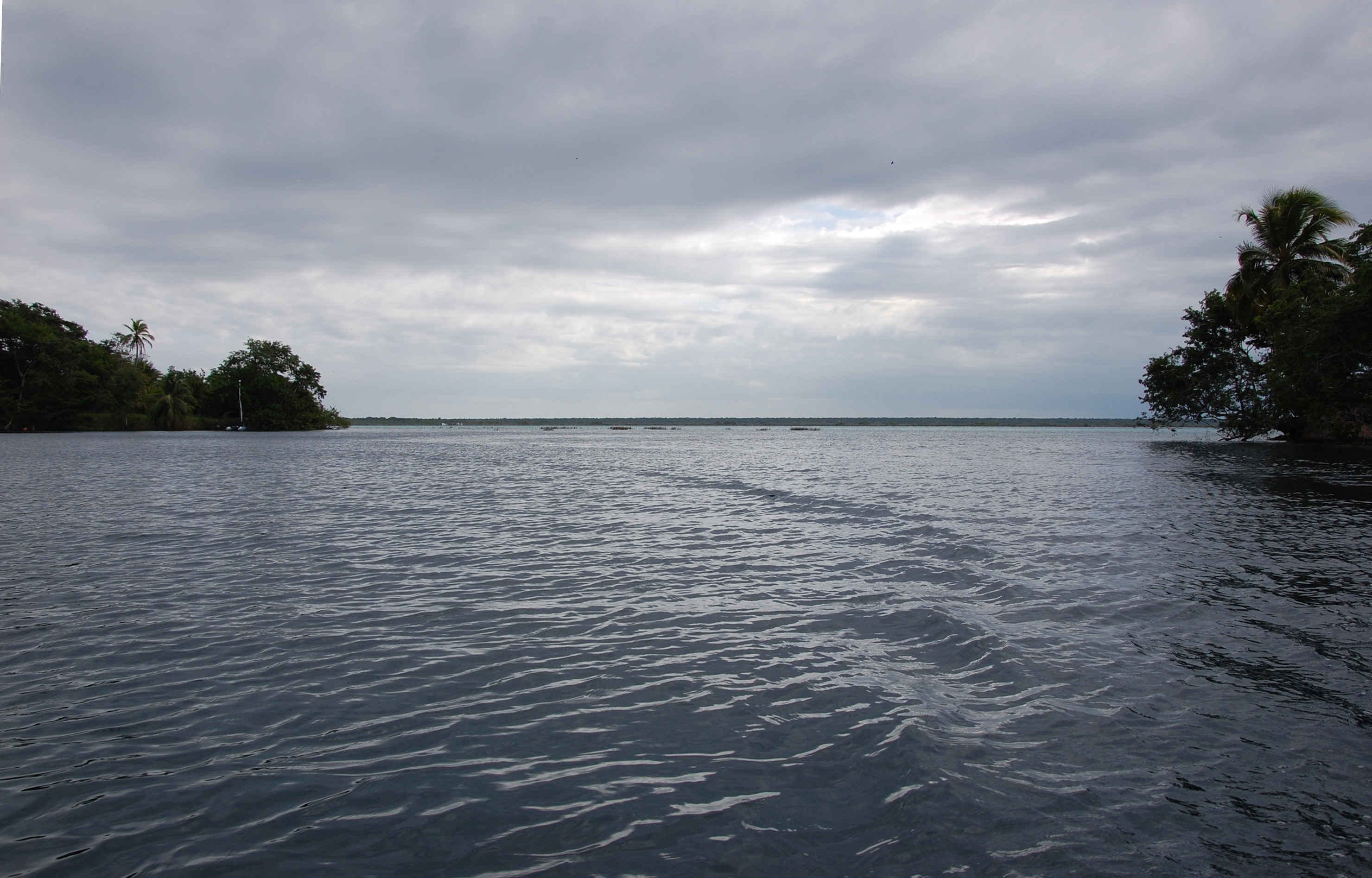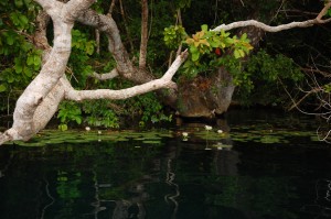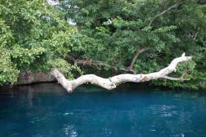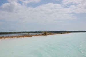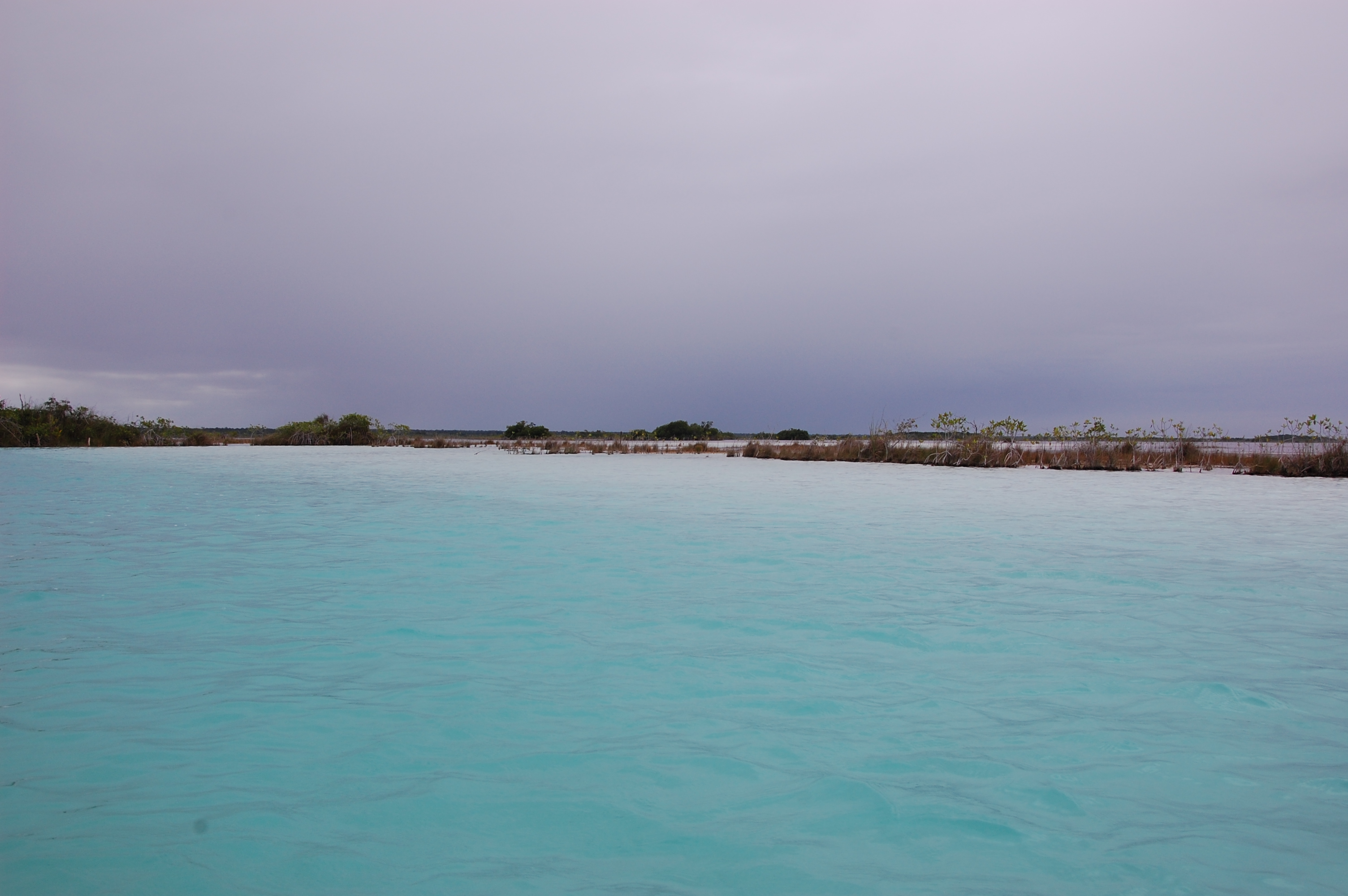 Nous nous dirigeons vers le cenote la Bruja, trou bleu foncé dont la couleur se démarque des eaux moins profondes de la lagune, et qui reflète sa profondeur impressionnante. C'est avec empressement que nous débarquons pour nous baigner longtemps dans cette eau sensée être plus fraîche que celle de la lagune mais tout aussi chaude à notre avis! À certains endroits du cenote on peut sentir un courant d'eau froide qui provient de la circulation d'eau de la rivière souterraine. Nous naviguons ensuite de cenote en cenote, traversons ensuite la lagune puis partons vers le canal de los piratas, qui permet de circuler vers la baie de Chetumal. Nous débarquons à nouveau pour nous baigner, cette fois-ci dans une eau peu profonde et très chaude. Le courant est quand même assez fort au centre du canal et on peut apercevoir au fond les vestiges des barrières mayas qui fermaient auparavant le canal. Le temps couvert fait apparaître des reflets spectaculaires sur l'eau et nous permet de prolonger la baignade sans crainte de calciner! Sur le chemin du retour vers le débarcadère, le soleil pointe son nez et nous offre de splendides nuances de couleurs sur la lagune.