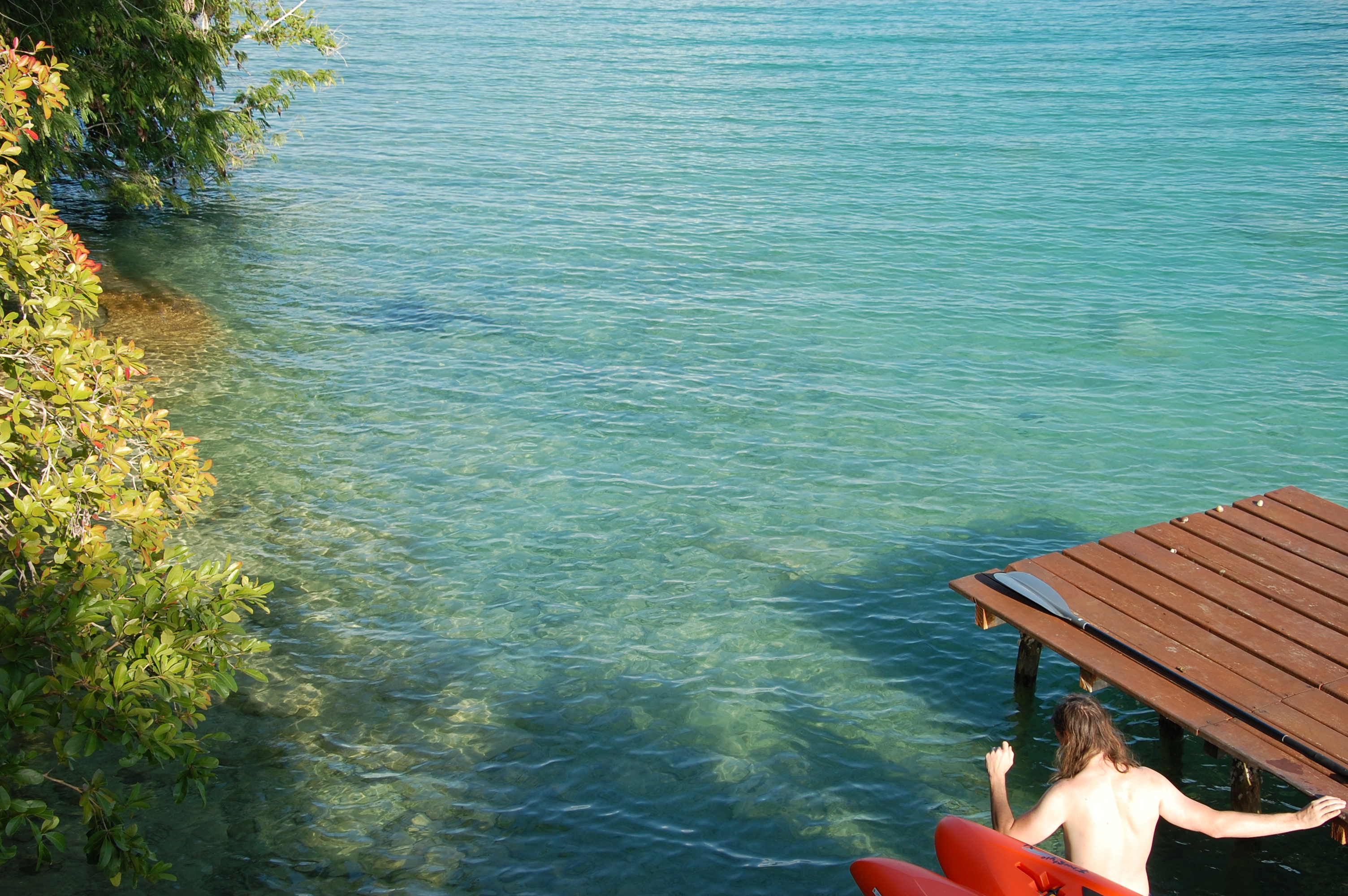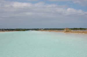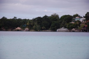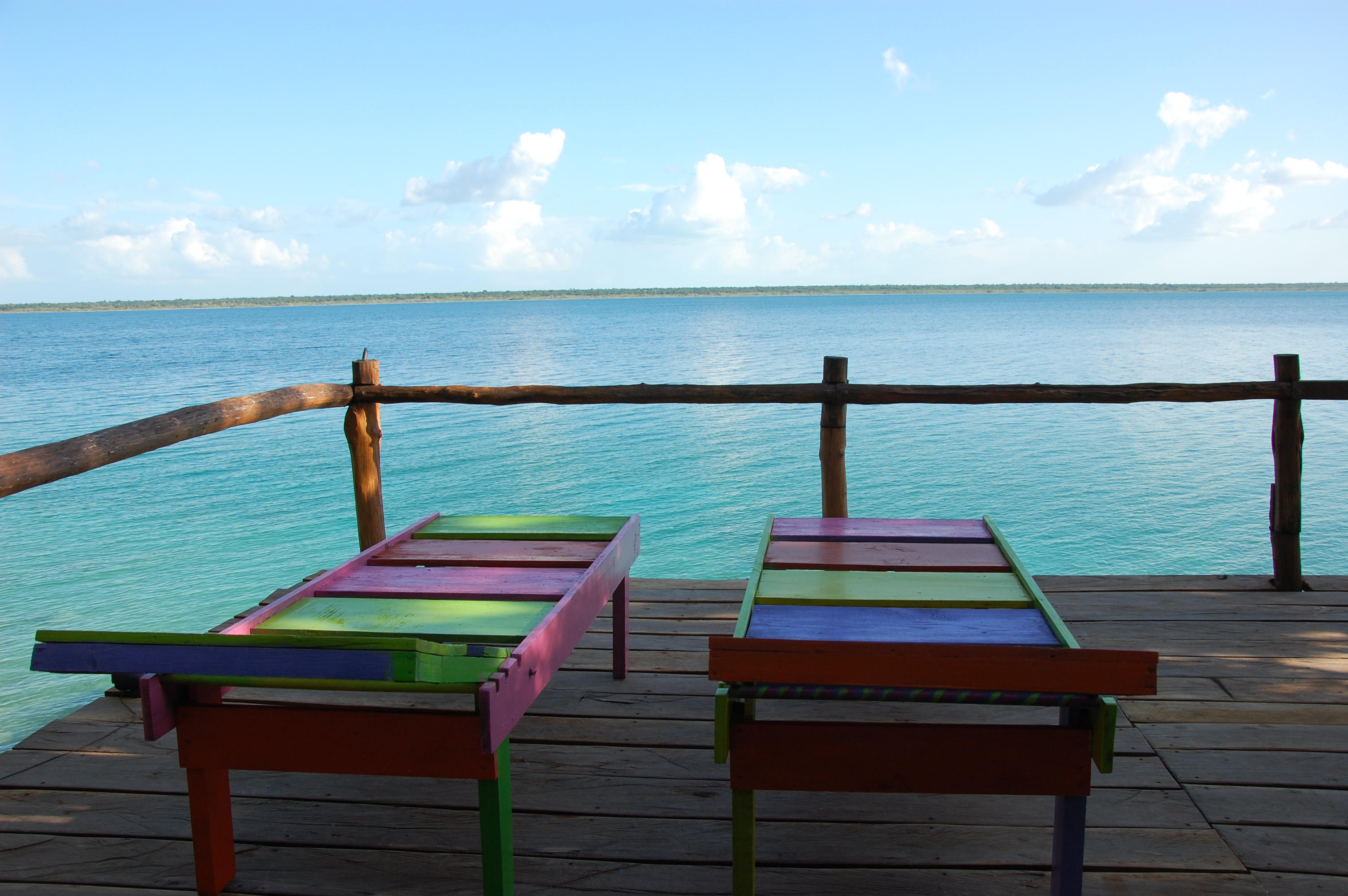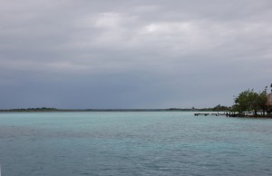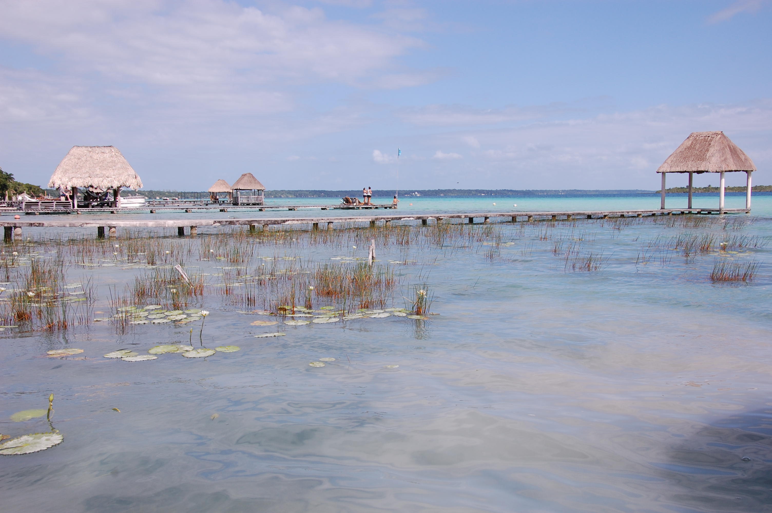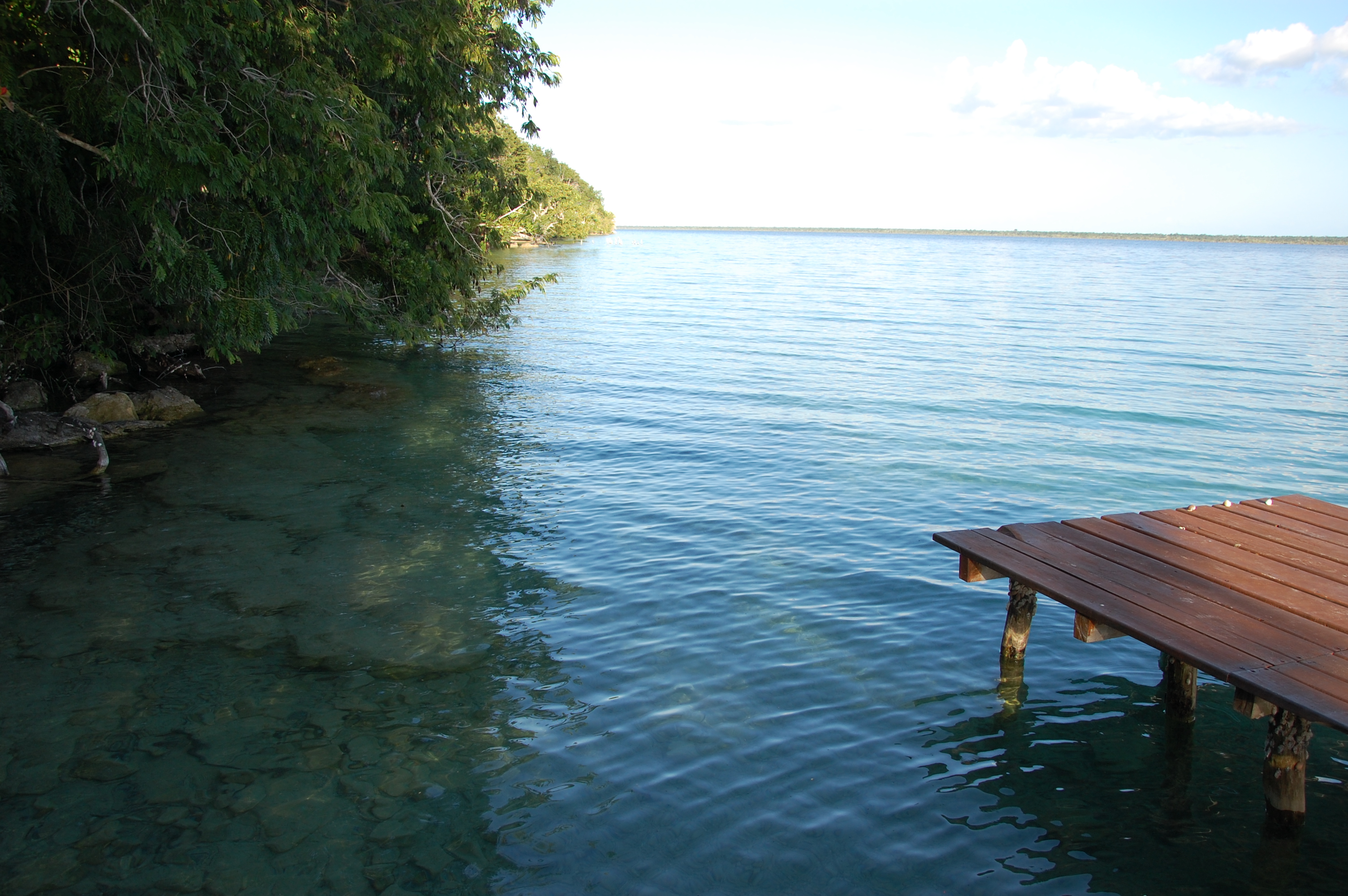 Nous retrouvons sans problème la route 307 en direction de Bacalar que nous rejoignons en une trentaine de minutes. Nous faisons quelques provisions et partons trouver notre hébergement qui est à quelques kilomètres après la sortie de la ville. Nous arrivons vers 14h30 et après que l'hôte nous ait fait faire le tour des lieux, nous nous précipitons à l'eau pour une baignade qui dure toute la fin de l'après-midi. L'eau est chaude, environ à 25 degrés, et la proprio nous explique qu'elle est fraîche car l'été elle est autour de 35 degrés! La lagune n'héberge pas beaucoup de vie en raison de son ph alcalin qui n'est pas propice à la végétation et son fond de calcaire explique les nuances étonnantes de bleu qu'elle exhibe. On se croirait dans les caraibes mais il n'y a pas de sable, pas de vague et l'eau est douce. Nous remontons du quai au soleil couchant pour boire quelques bières en attendant de souper chez nos hôtes, avec les autres locataires du gites, trois américains contrits de la côte ouest et un couple allemand de Cologne, tous très sympathiques.